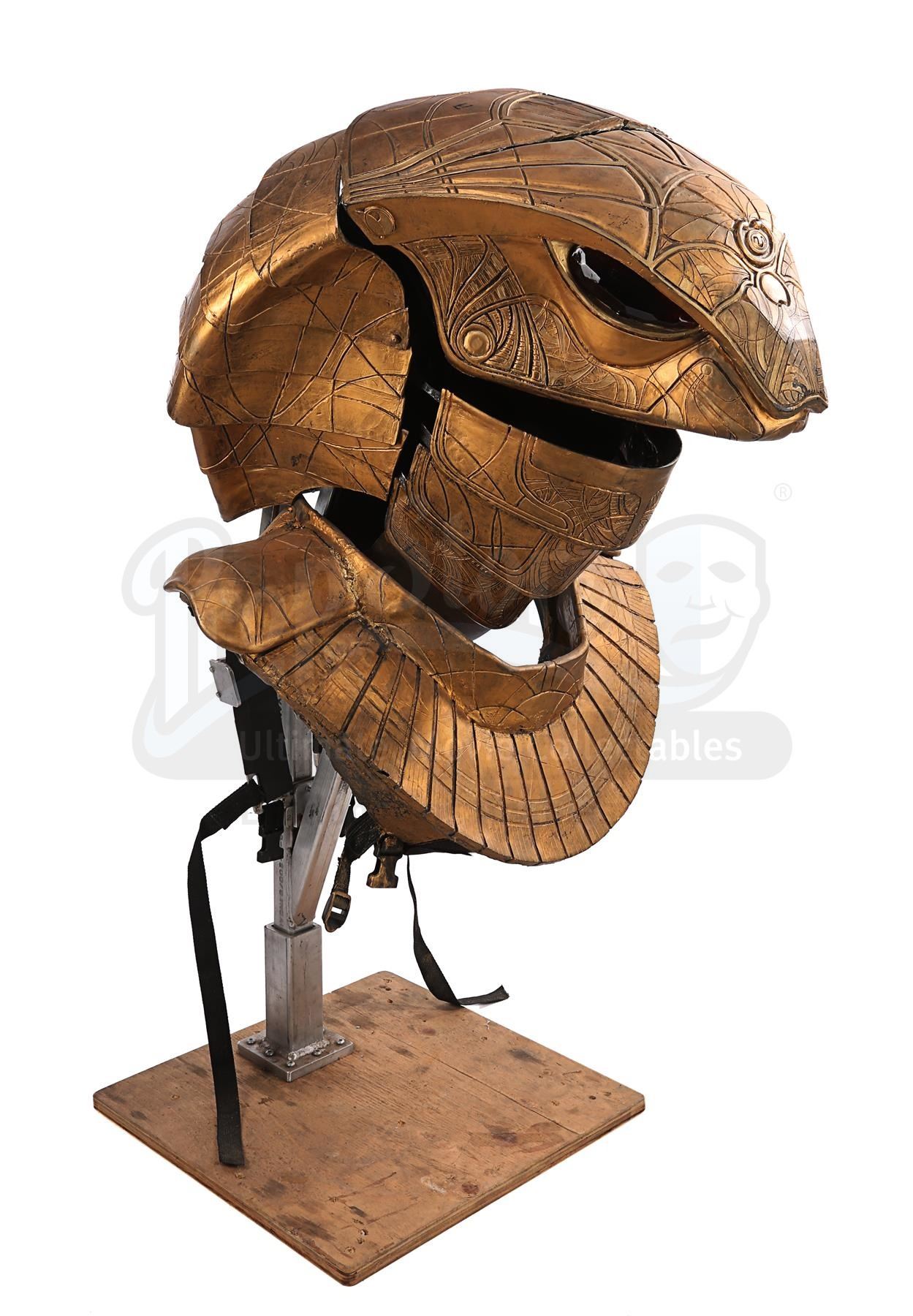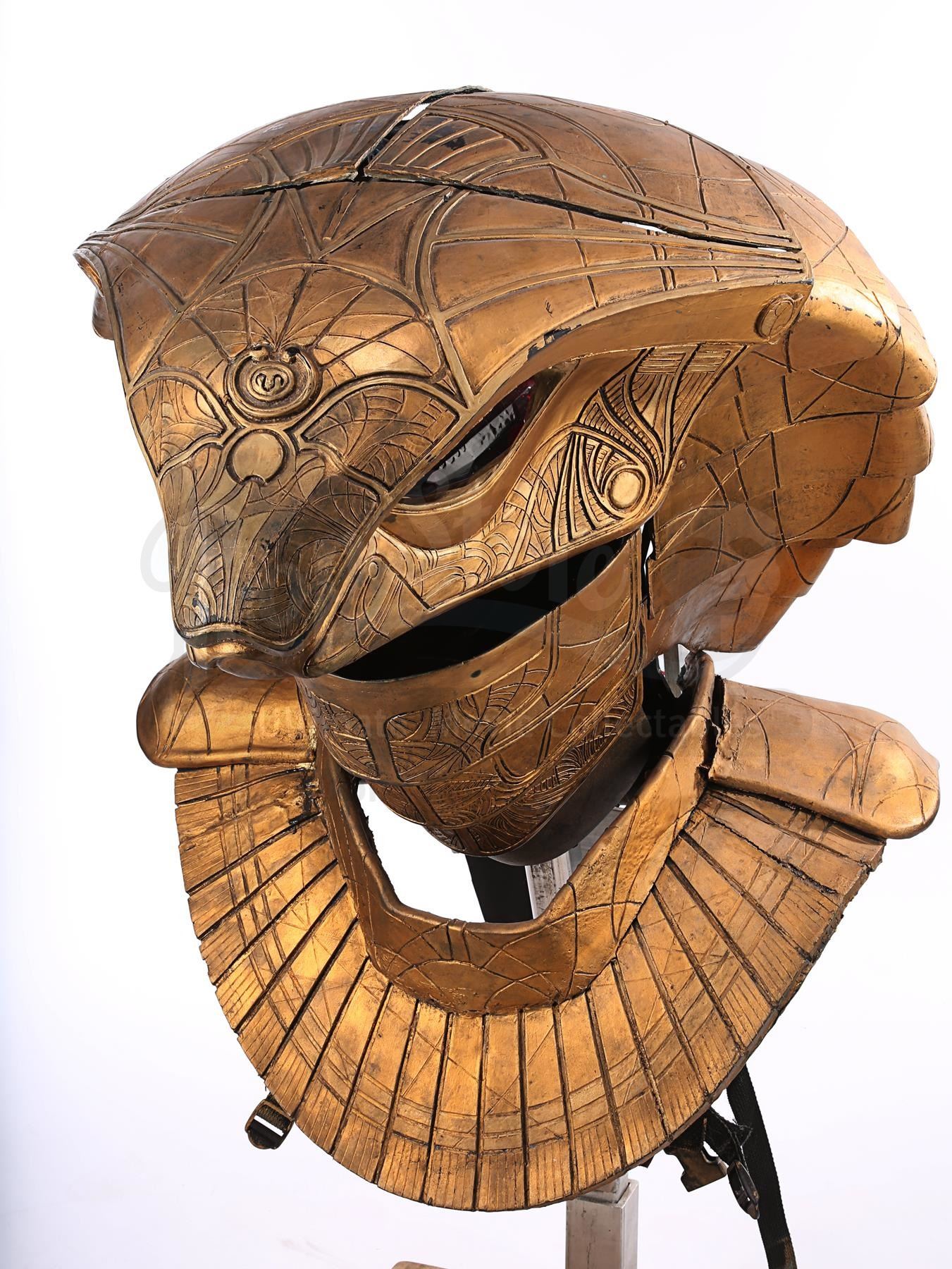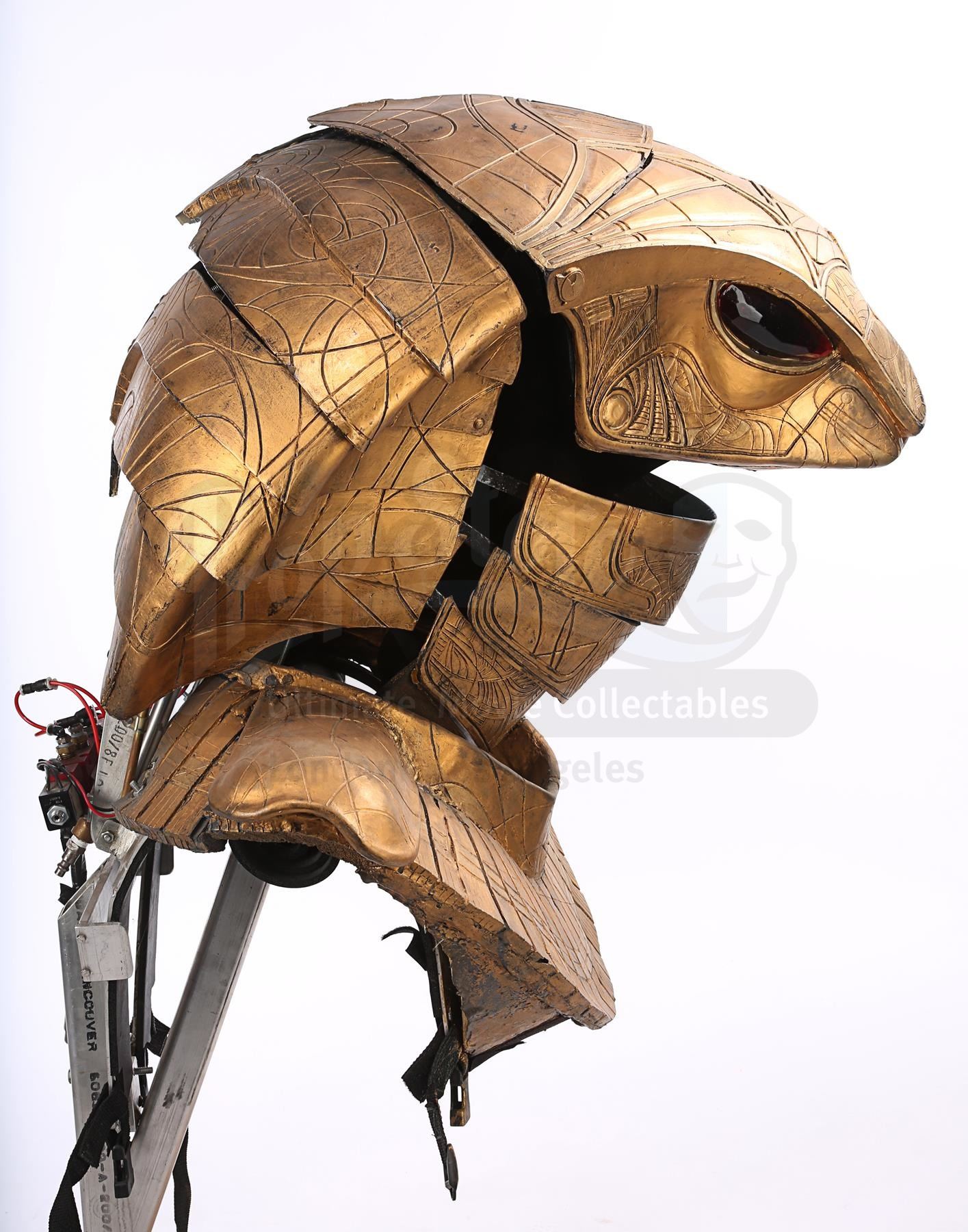 Apophis' (Peter Williams) mechanical headdress from the sci-fi television show Stargate SG-1. Apophis was a System Lord of the Goa'uld and the ultimate nemesis of Stargate Command. He wore his armoured headdress, designed by Christina McQuarrie, in the pilot episode, in which he and his Jaffa Serpent Guards infiltrated the Embarkation room of Stargate Command. He lowered his mechanical headdress and commanded his Jaffas to kill the stationed guards, before abducting Senior Airman Carol Weterings (Rachel Hayward).