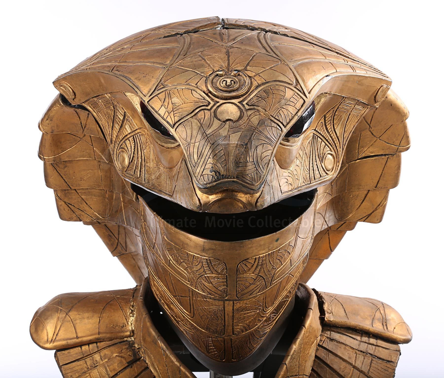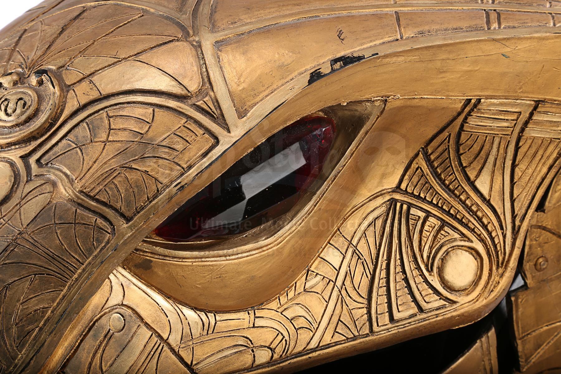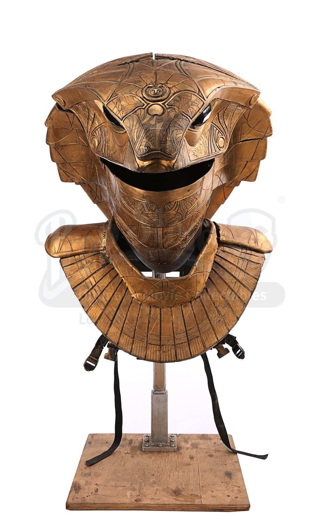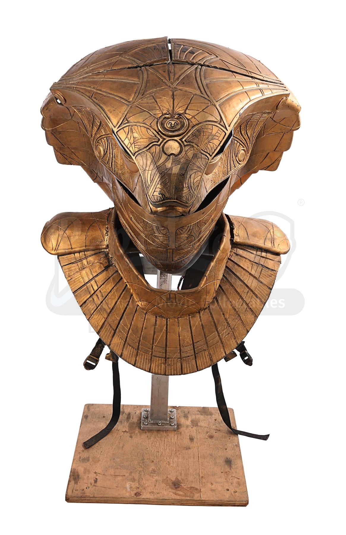 The headdress is made up of several components. The cobra head is made of fibreglass painted faux-gold, and features red resin crystals for eyes, the Apophis symbol on its forehead and an engraved pattern throughout. The face and back of the headdress are segmented so they can open and close, a function that is controlled by a pressure valve and electrical system concealed at the back. The neck-and-shoulder guard is made of foam and rubber painted faux gold, with plastic buckles and straps to hold the headdress onto the wearer.
