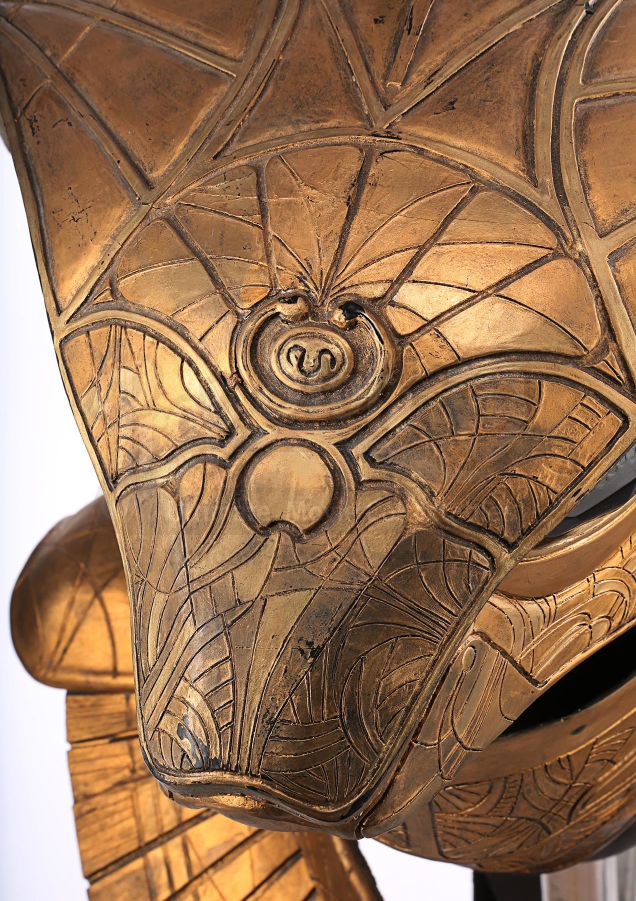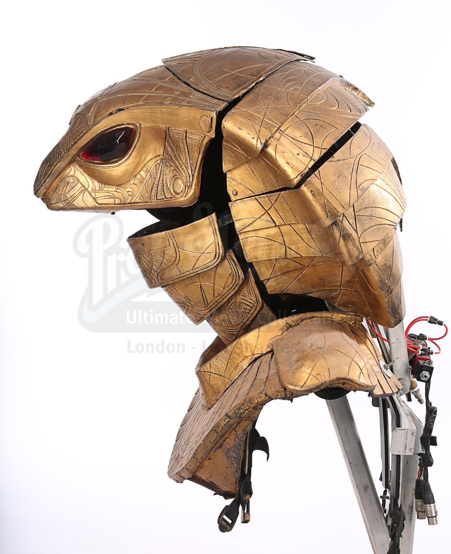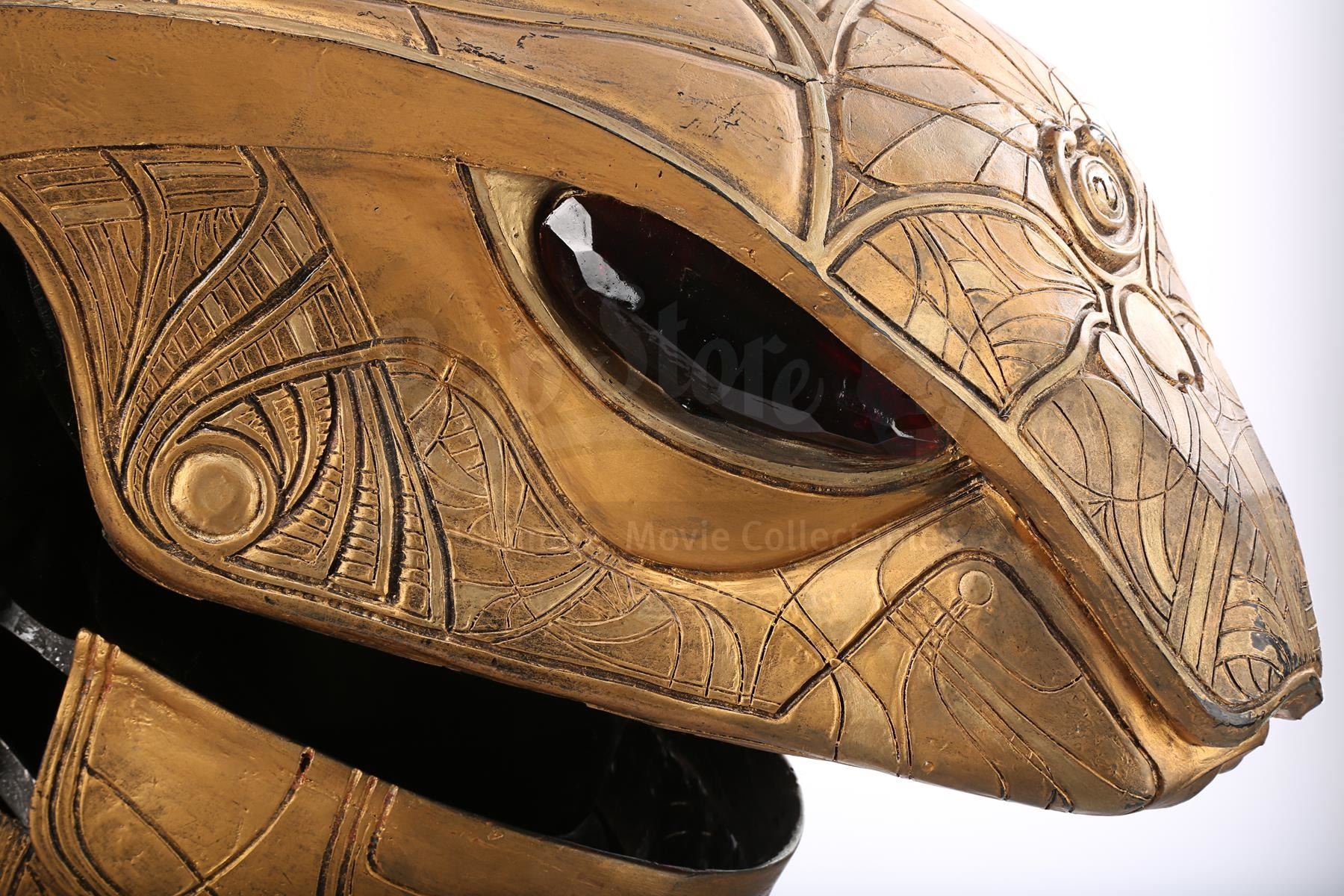 The headdress is made up of several components. The cobra head is made of fibreglass painted faux-gold, and features red resin crystals for eyes, the Apophis symbol on its forehead and an engraved pattern throughout. The face and back of the headdress are segmented so they can open and close, a function that is controlled by a pressure valve and electrical system concealed at the back. The neck-and-shoulder guard is made of foam and rubber painted faux gold, with plastic buckles and straps to hold the headdress onto the wearer.