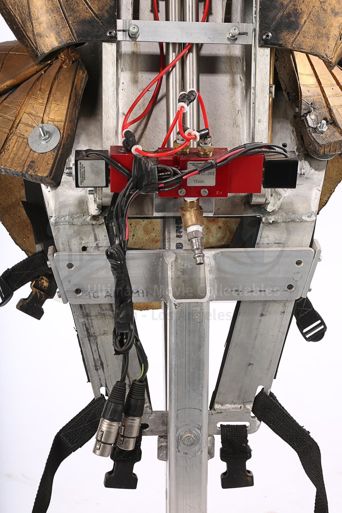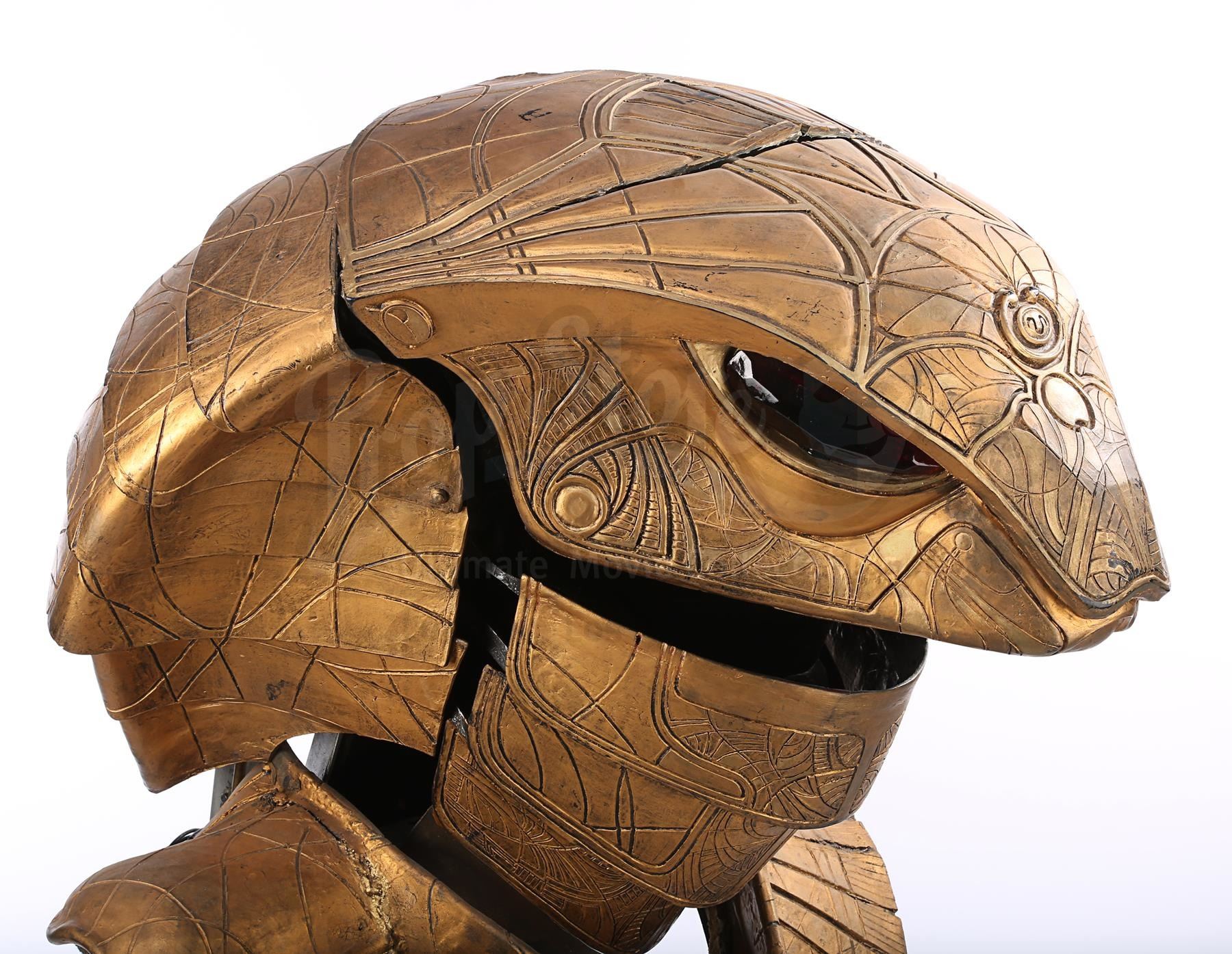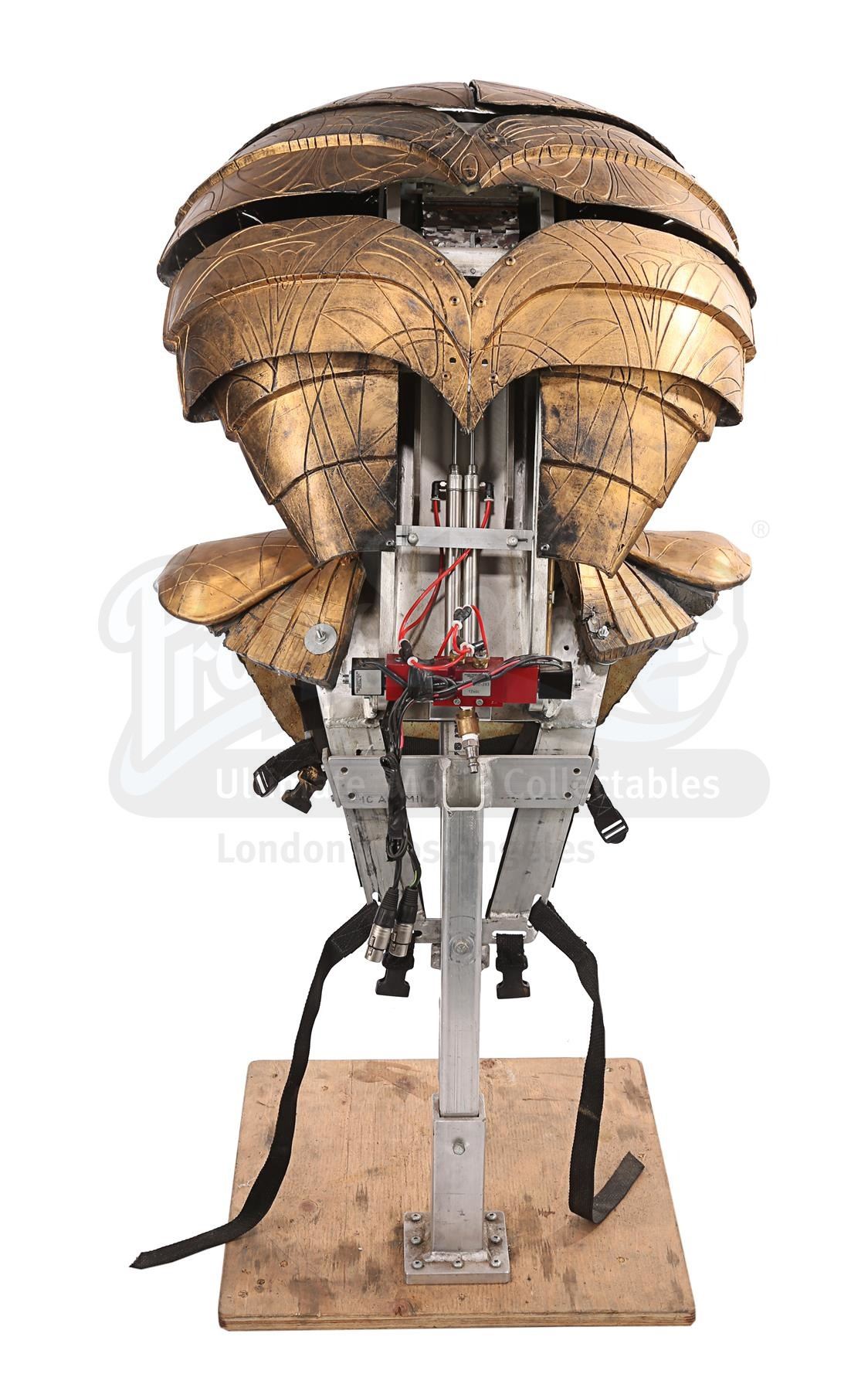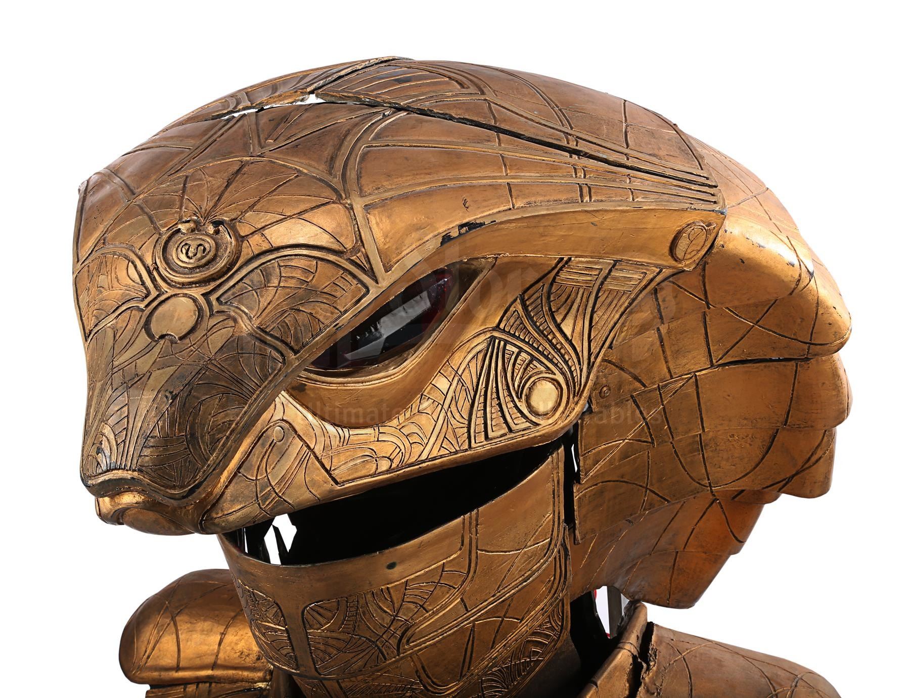 The headdress is made up of several components. The cobra head is made of fibreglass painted faux-gold, and features red resin crystals for eyes, the Apophis symbol on its forehead and an engraved pattern throughout. The face and back of the headdress are segmented so they can open and close, a function that is controlled by a pressure valve and electrical system concealed at the back. The neck-and-shoulder guard is made of foam and rubber painted faux gold, with plastic buckles and straps to hold the headdress onto the wearer.