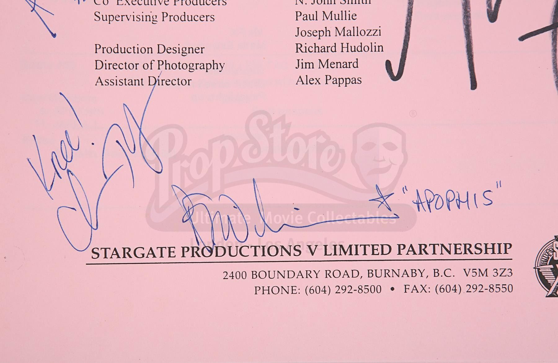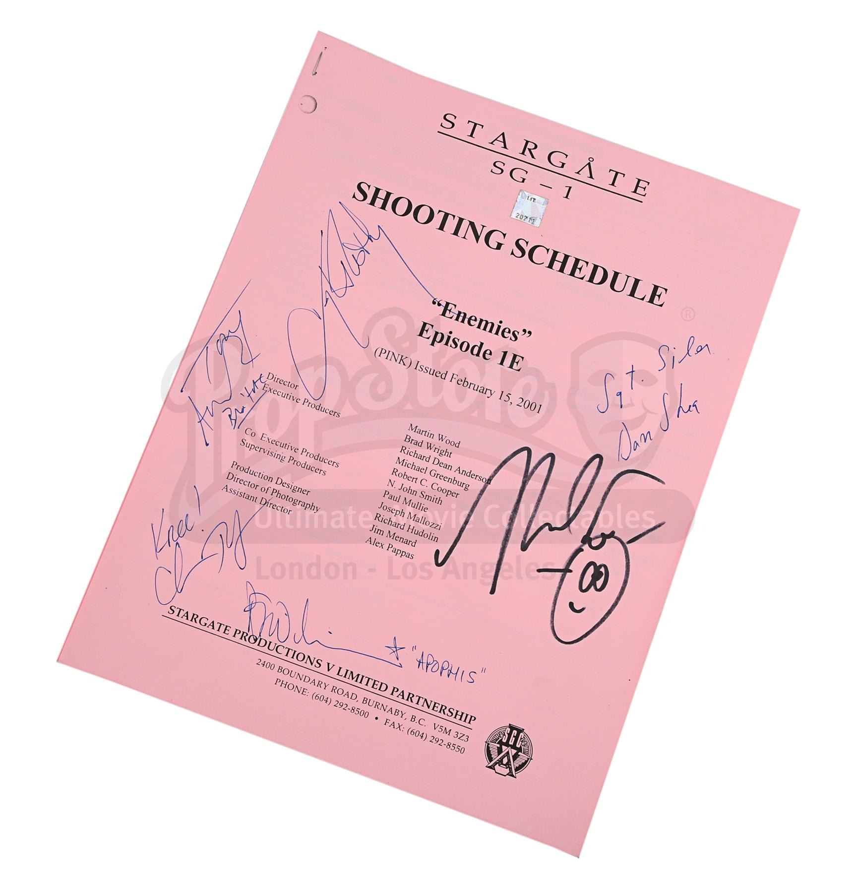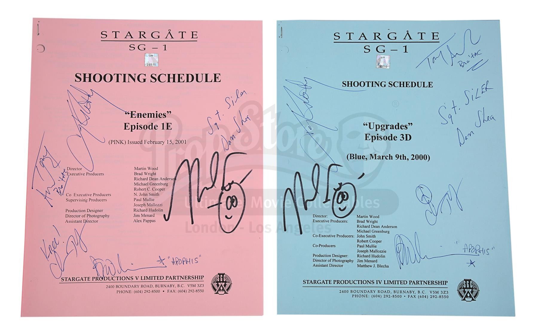 A pair of cast-autographed shooting schedules from the production of the sci-fi adventure series Stargate SG-1. Shooting schedules were used by the crew to plan scenes and organise special effects, props, set design and makeup.
