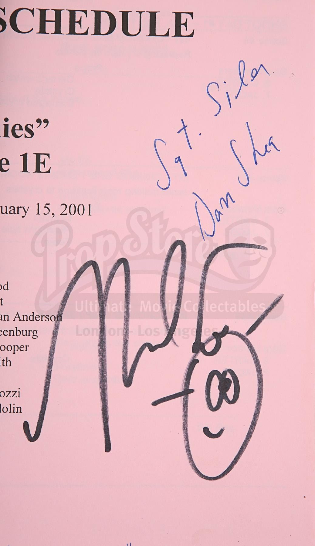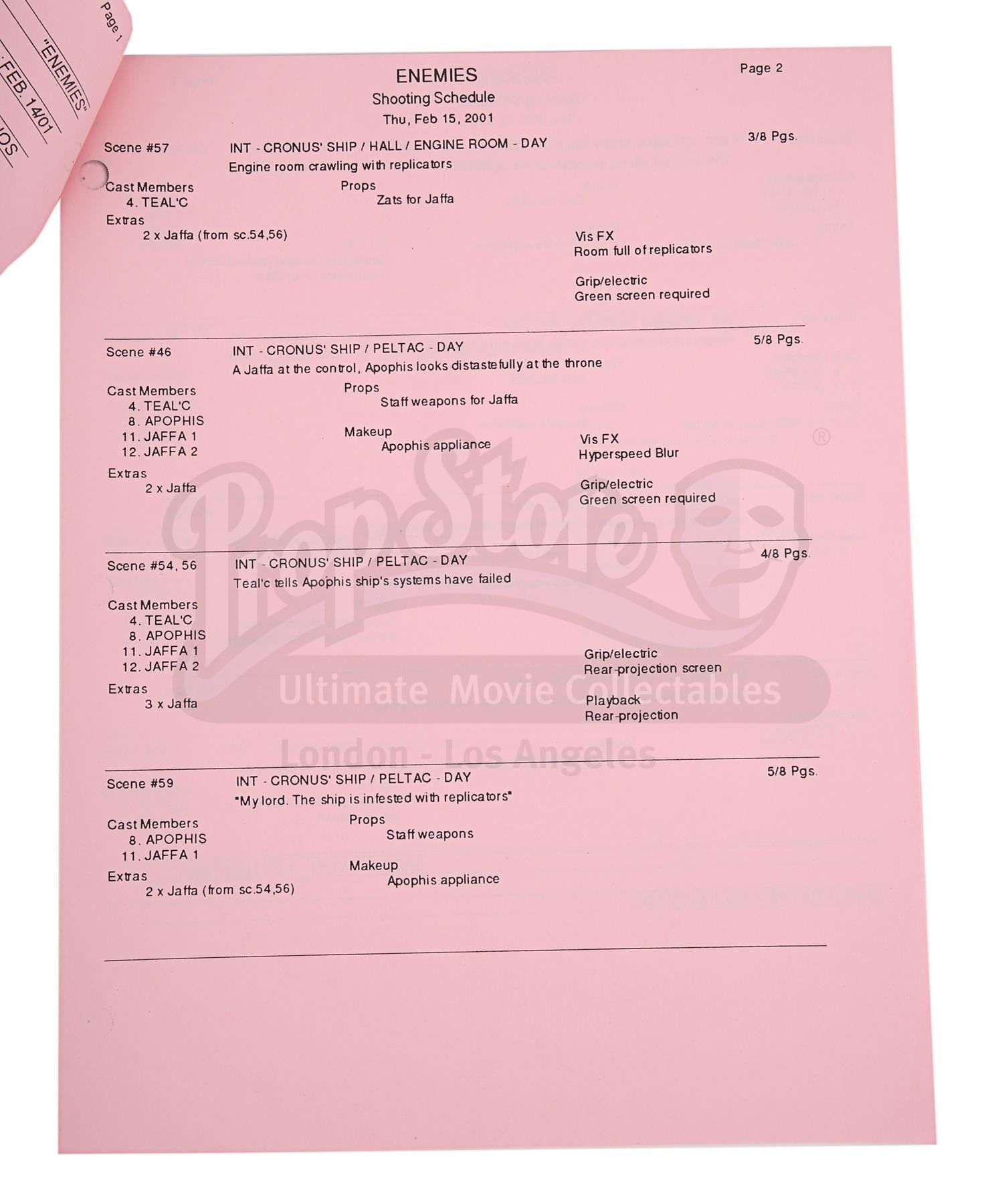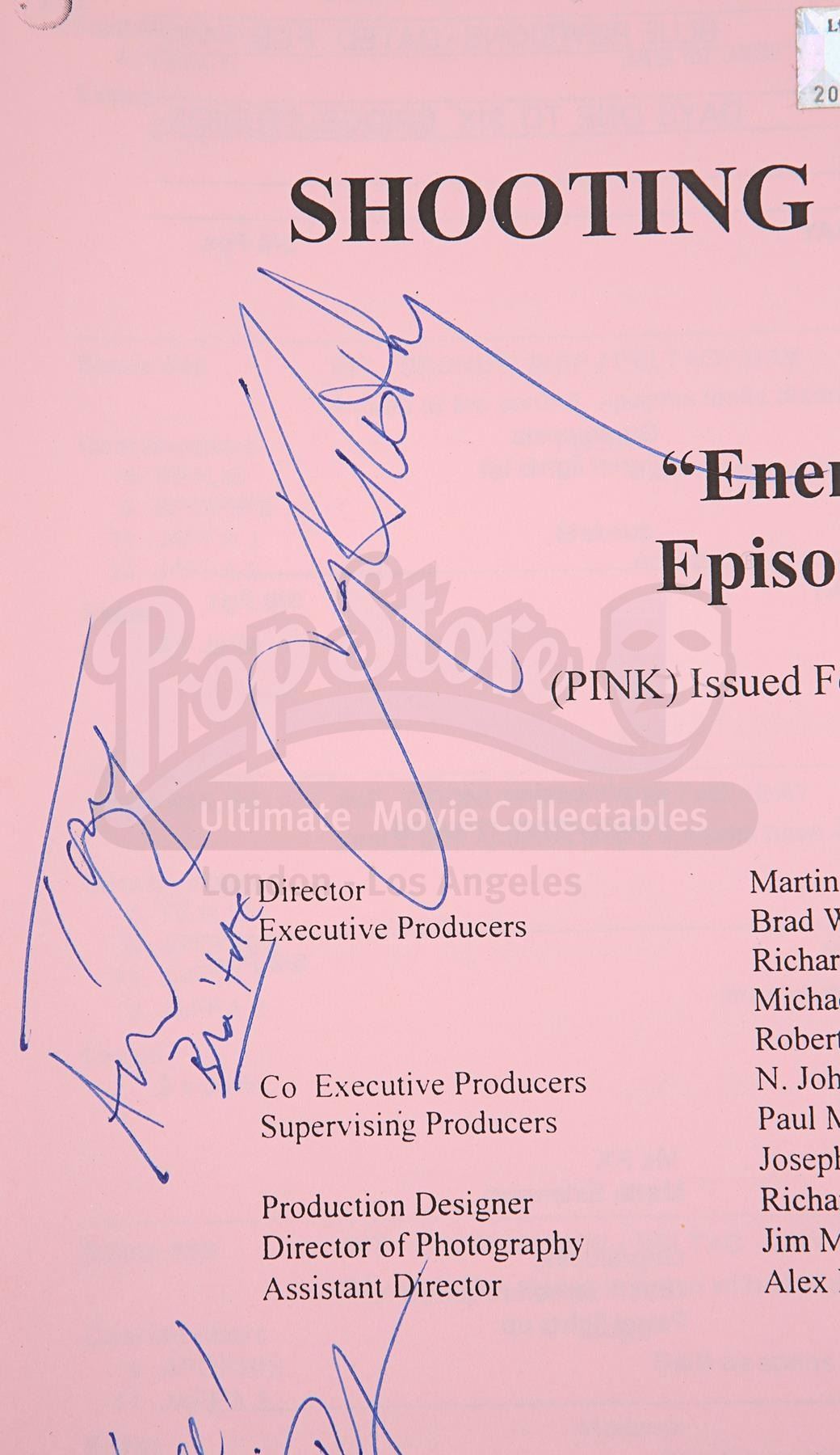 A pair of cast-autographed shooting schedules from the production of the sci-fi adventure series Stargate SG-1. Shooting schedules were used by the crew to plan scenes and organise special effects, props, set design and makeup.