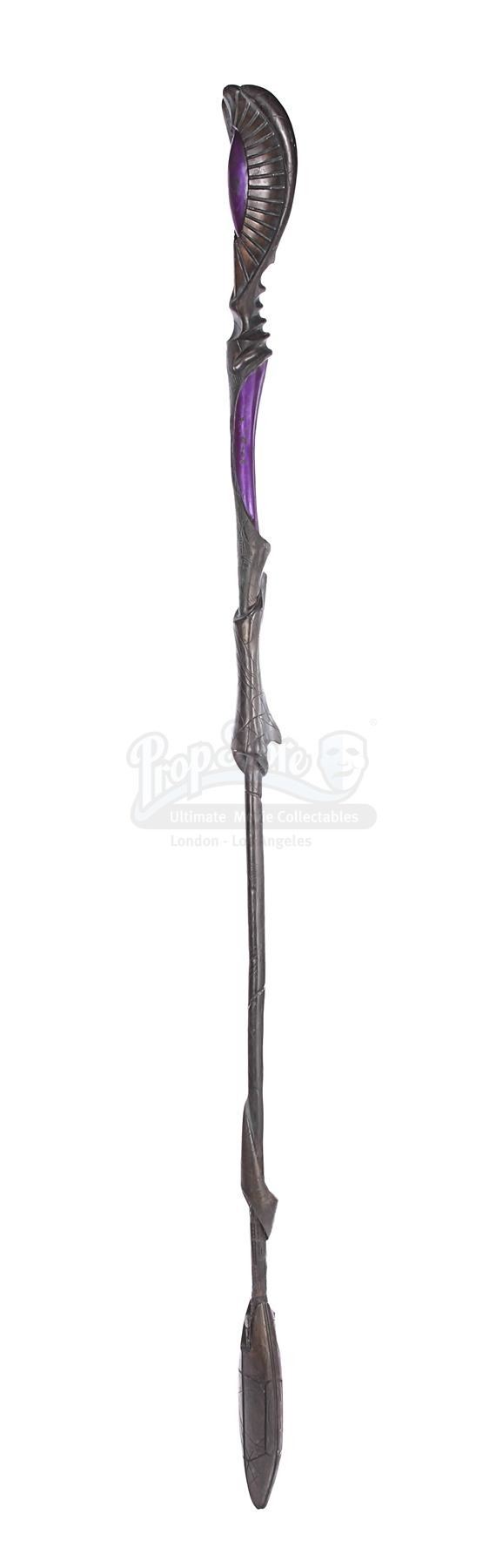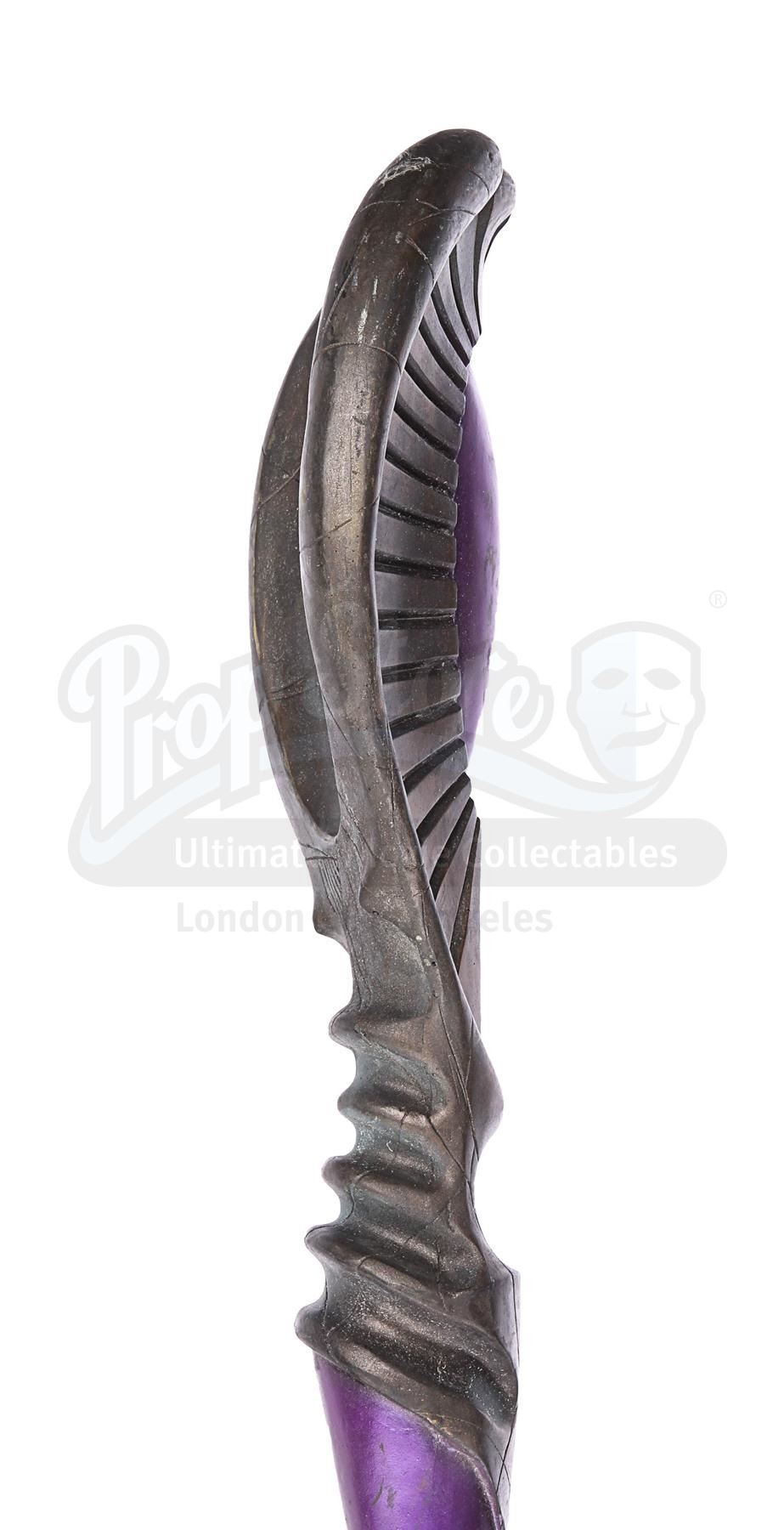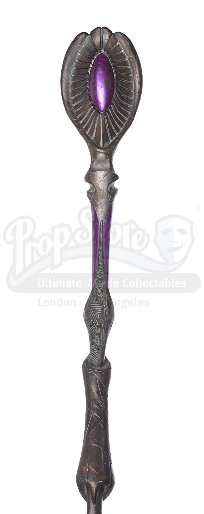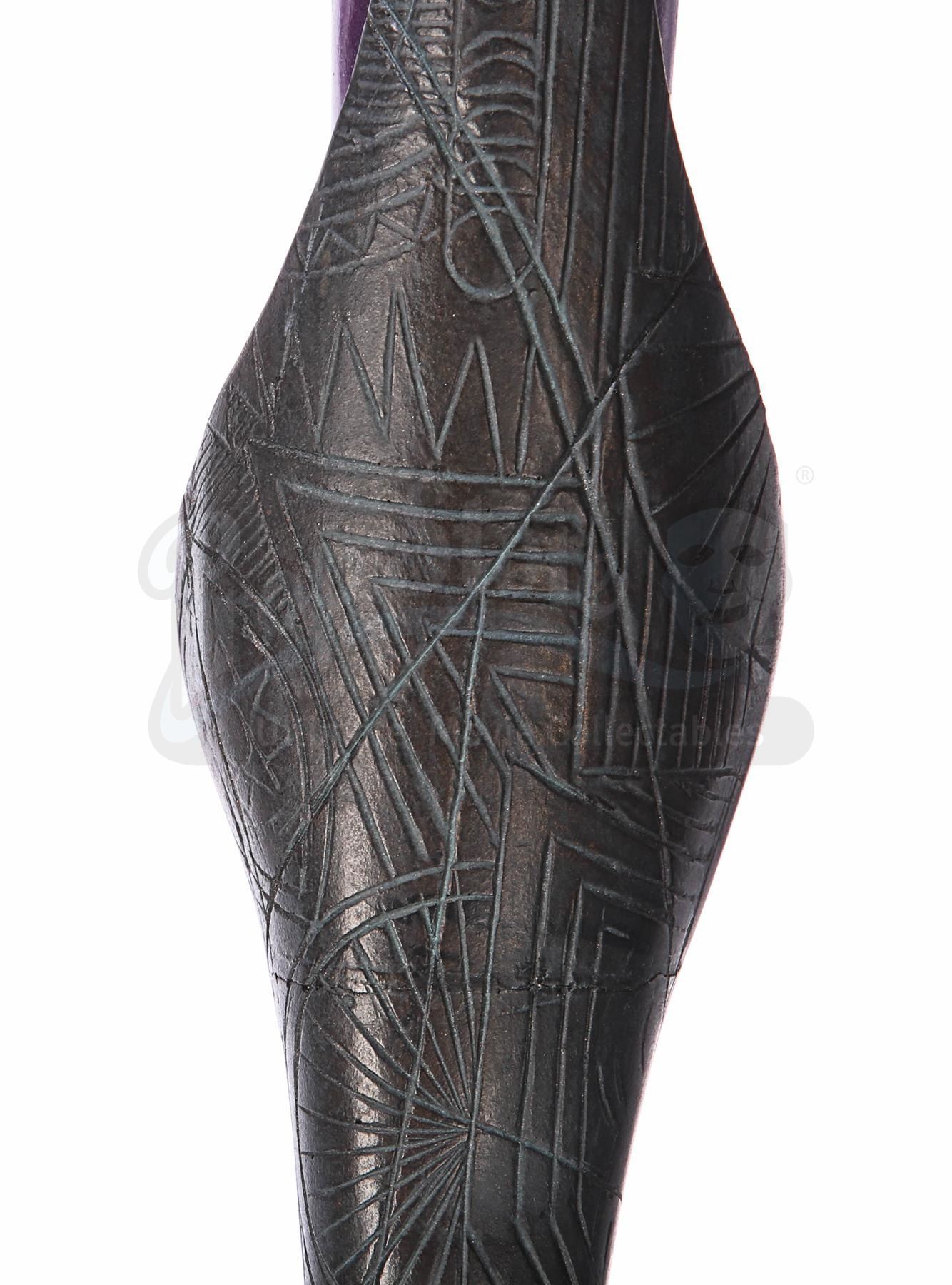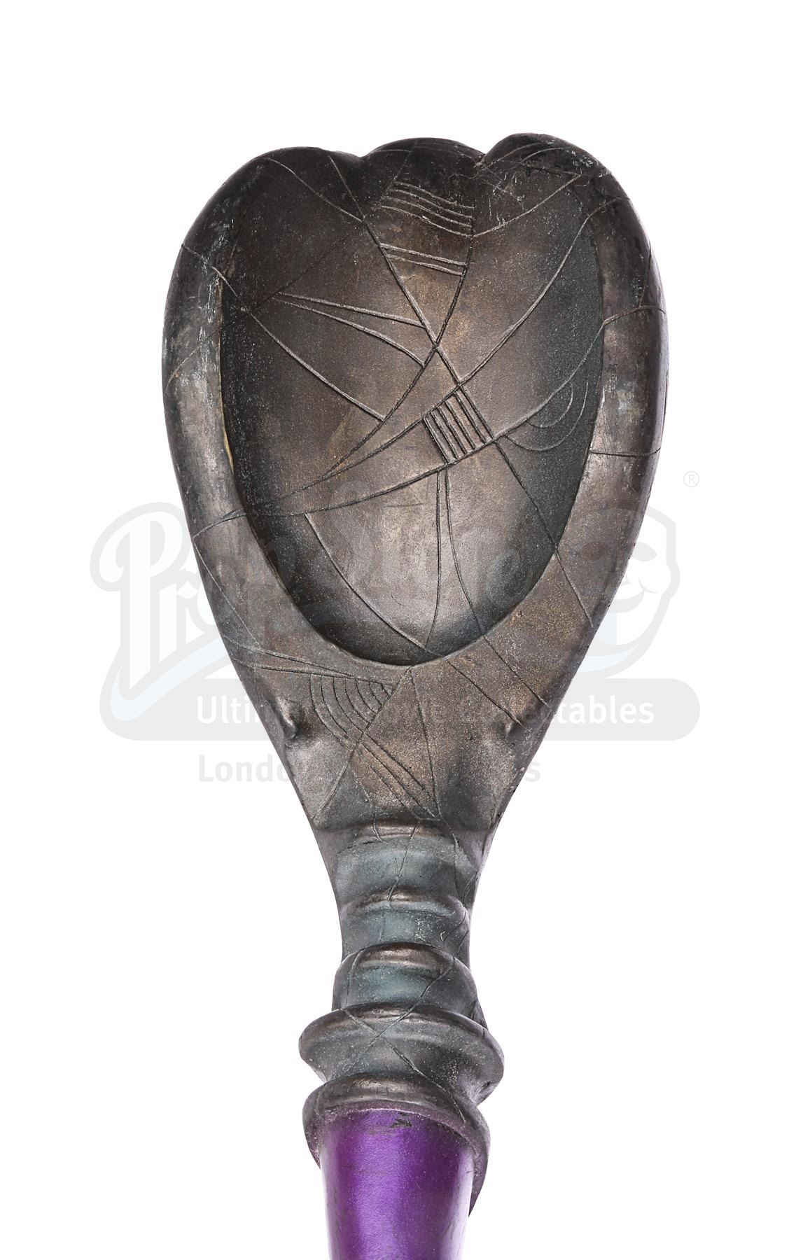 Crafted from dense rubber with an internal metal armature, the staff comprises an oval shaped €˜barrel', a long handle and a large paddle-like head at the opposite end. Painted in a dark copper colour with metallic purple accents, the weapon displays intricate etched patterns, and a green hue has been applied to produce a weathered appearance.