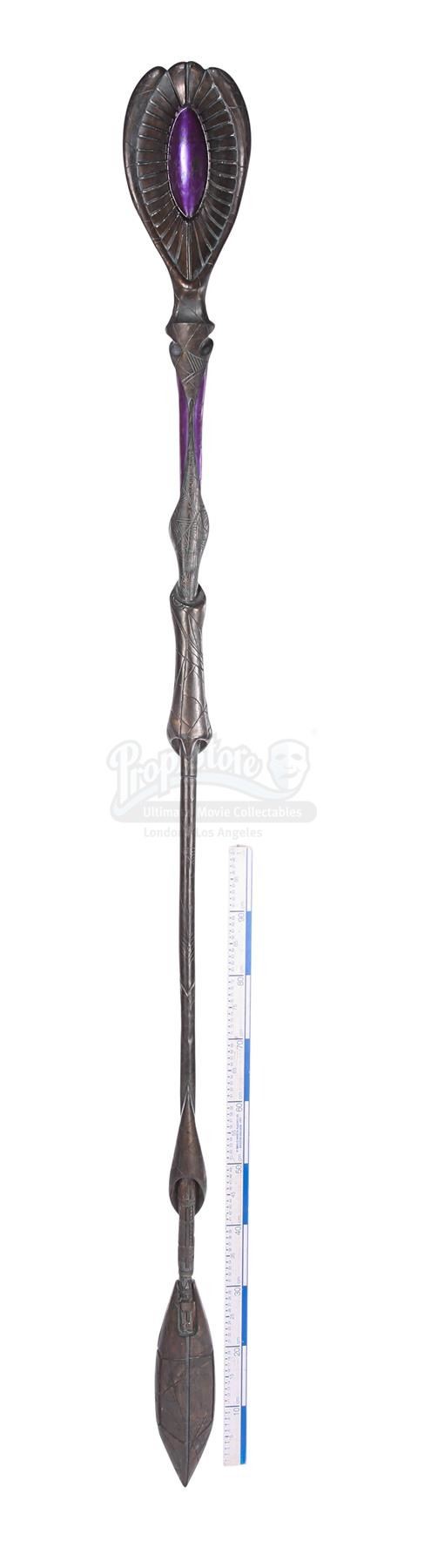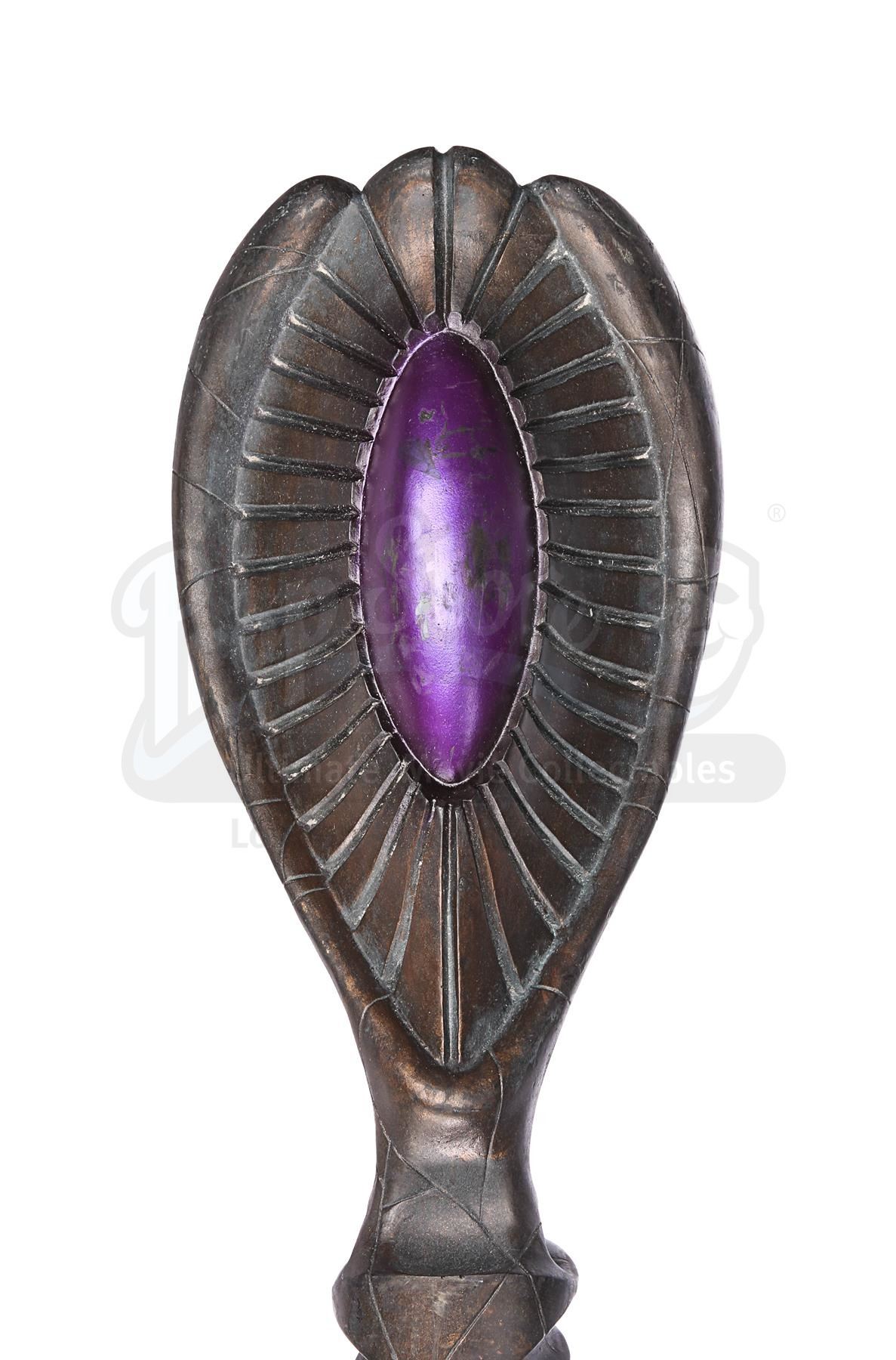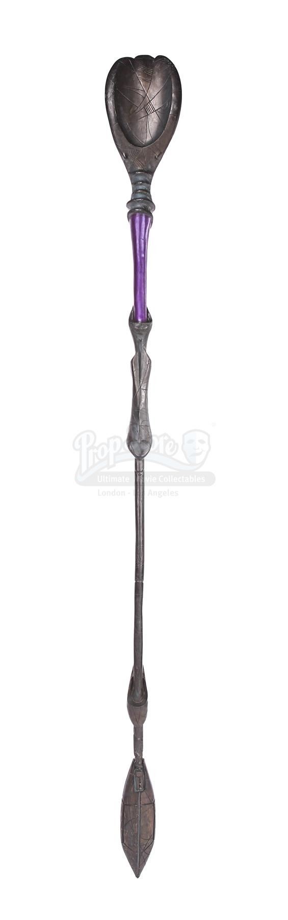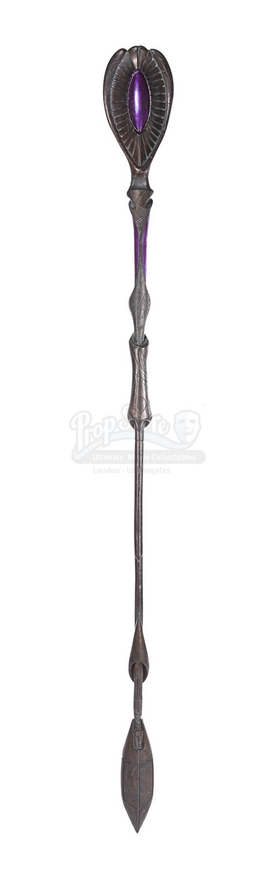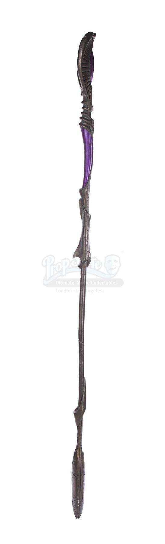 Crafted from dense rubber with an internal metal armature, the staff comprises an oval shaped €˜barrel', a long handle and a large paddle-like head at the opposite end. Painted in a dark copper colour with metallic purple accents, the weapon displays intricate etched patterns, and a green hue has been applied to produce a weathered appearance.