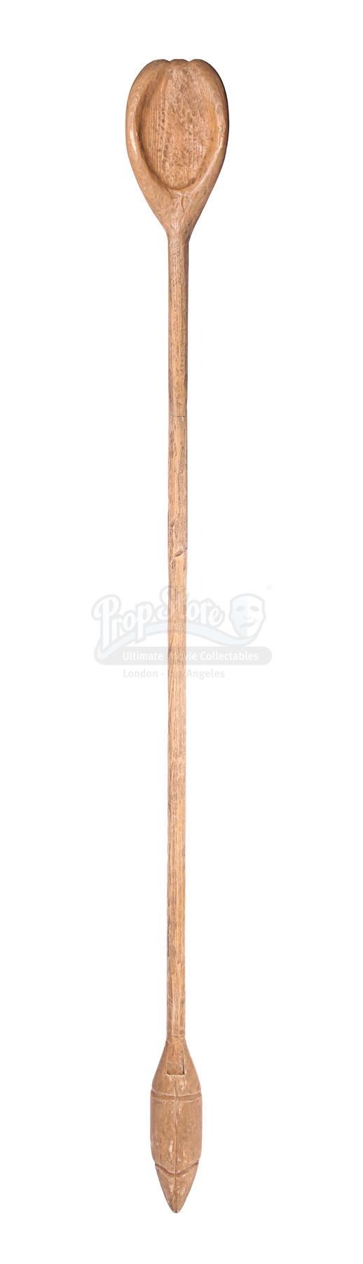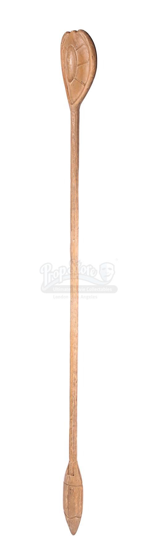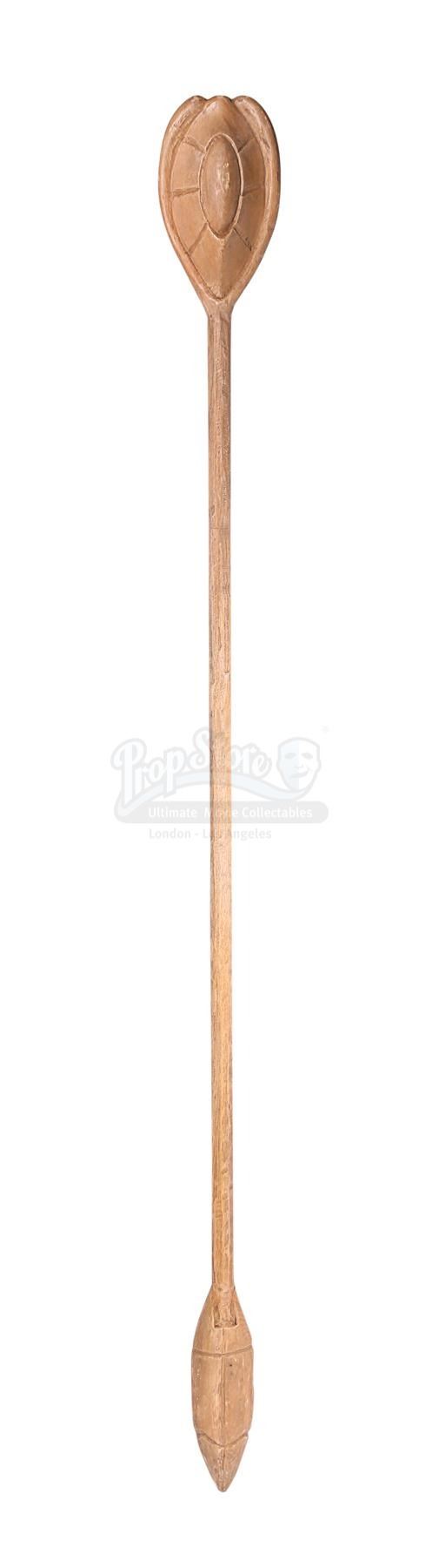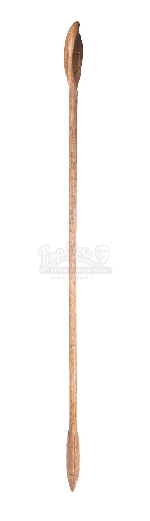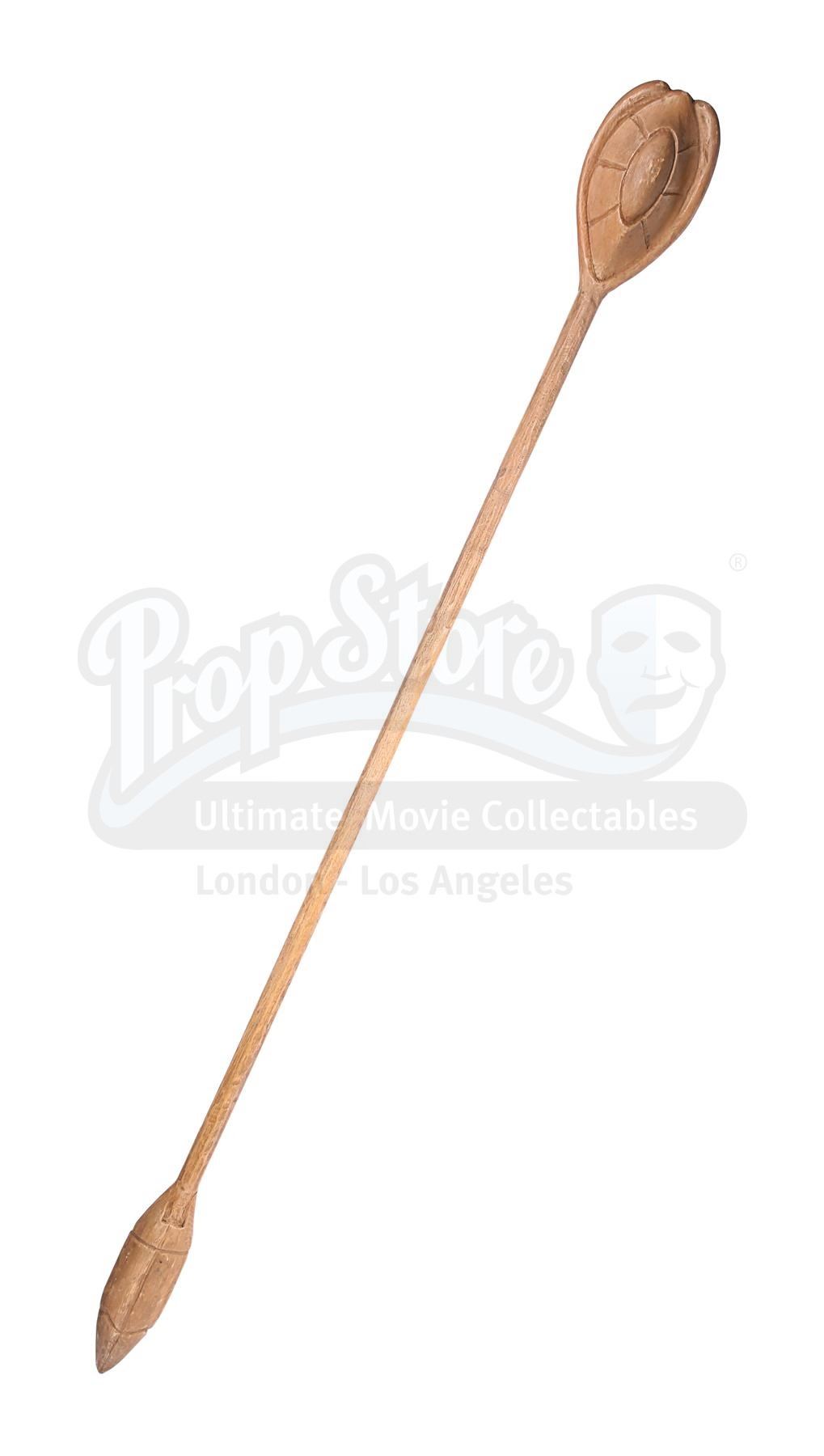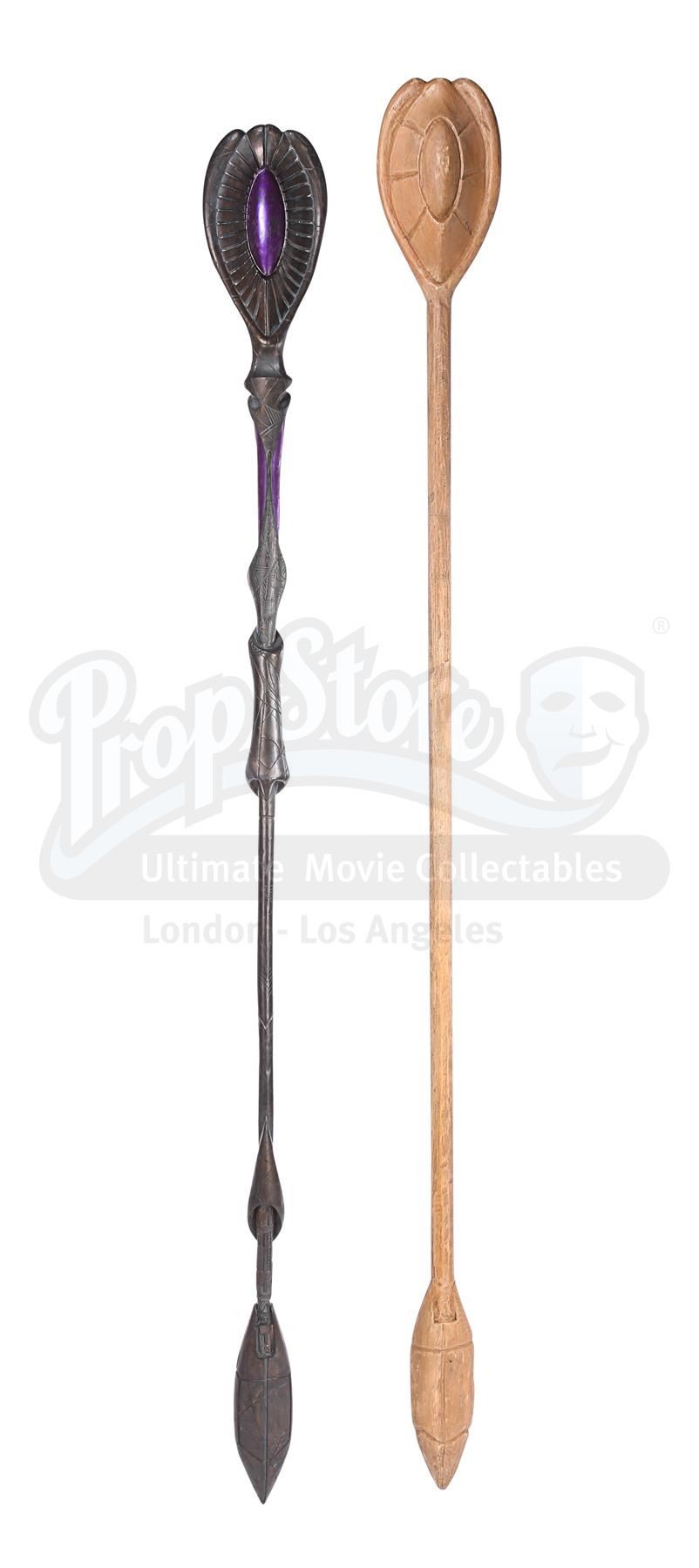 Crafted from dense rubber with an internal metal armature, the staff comprises an oval shaped €˜barrel', a long handle and a large paddle-like head at the opposite end. Painted in a dark copper colour with metallic purple accents, the weapon displays intricate etched patterns, and a green hue has been applied to produce a weathered appearance.