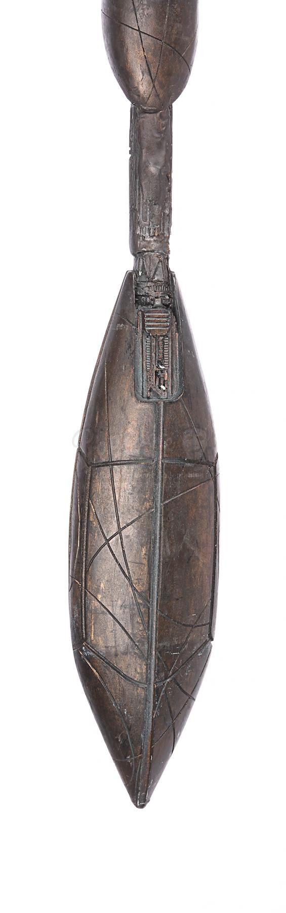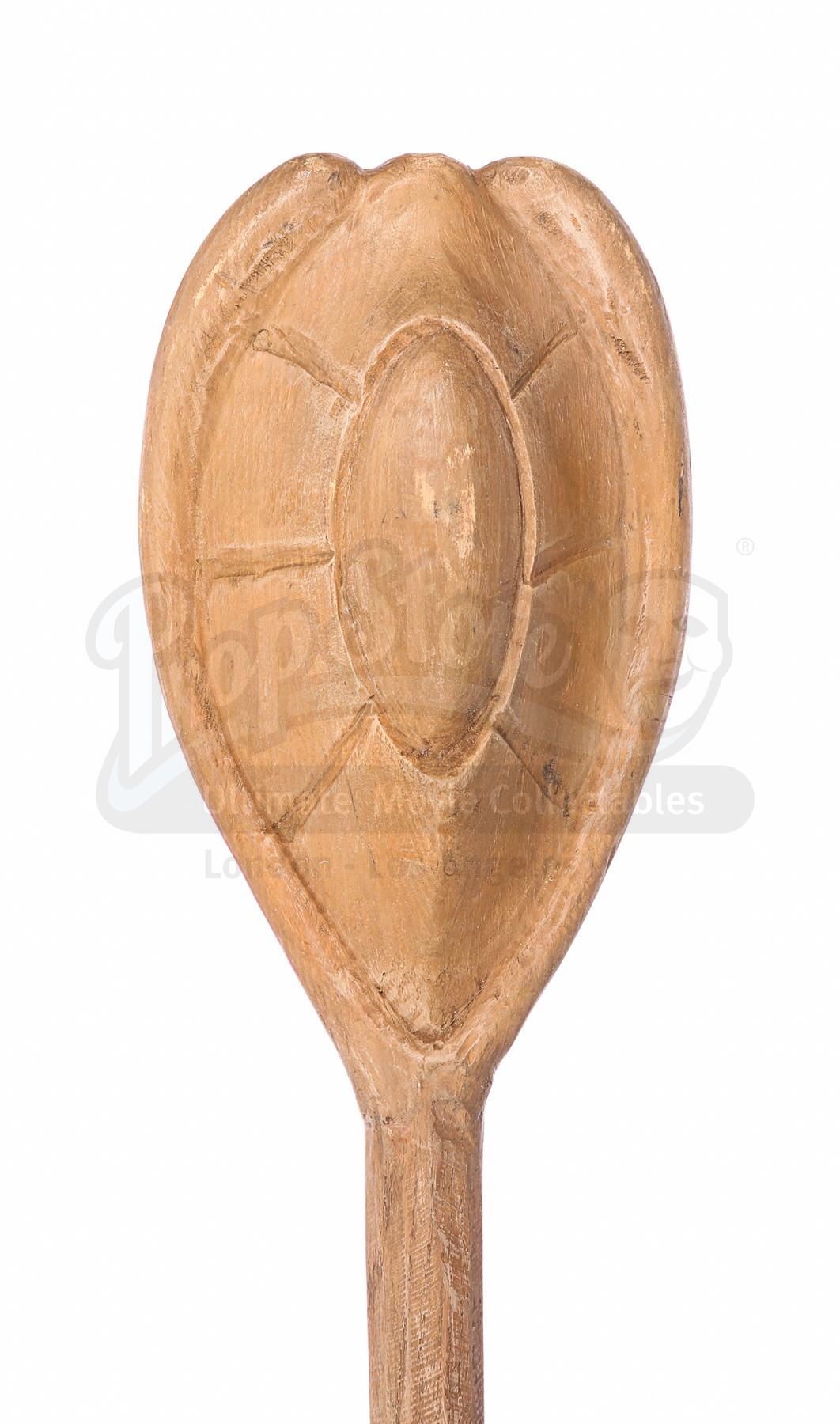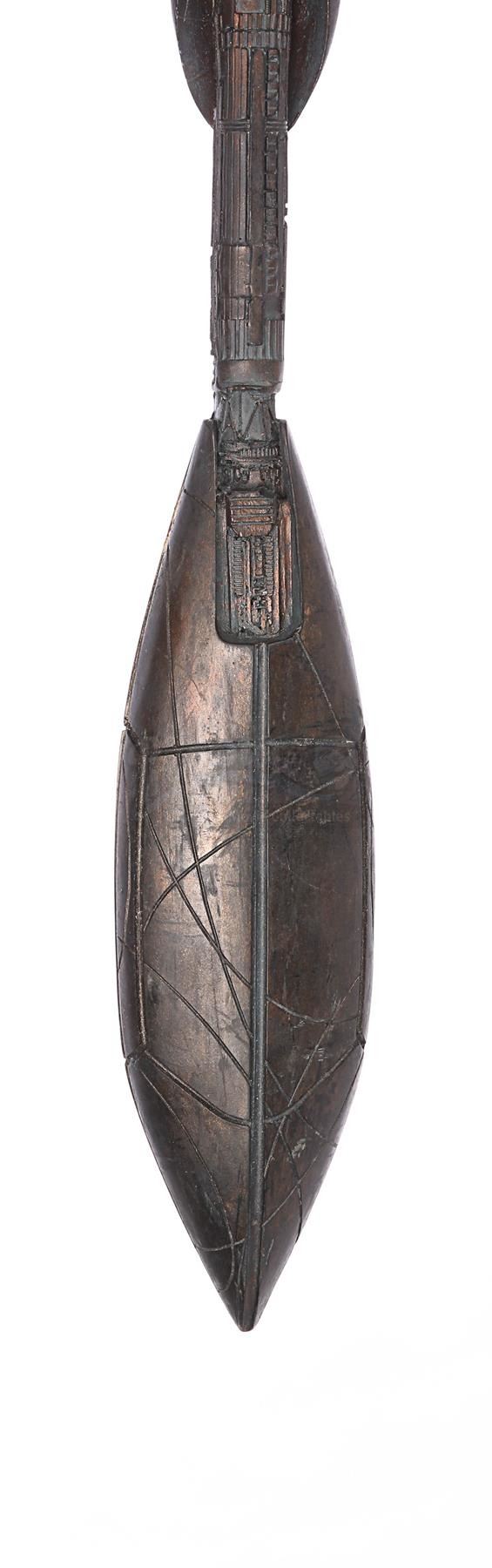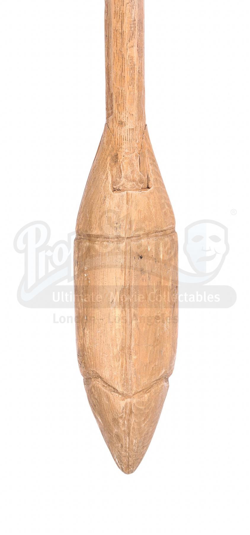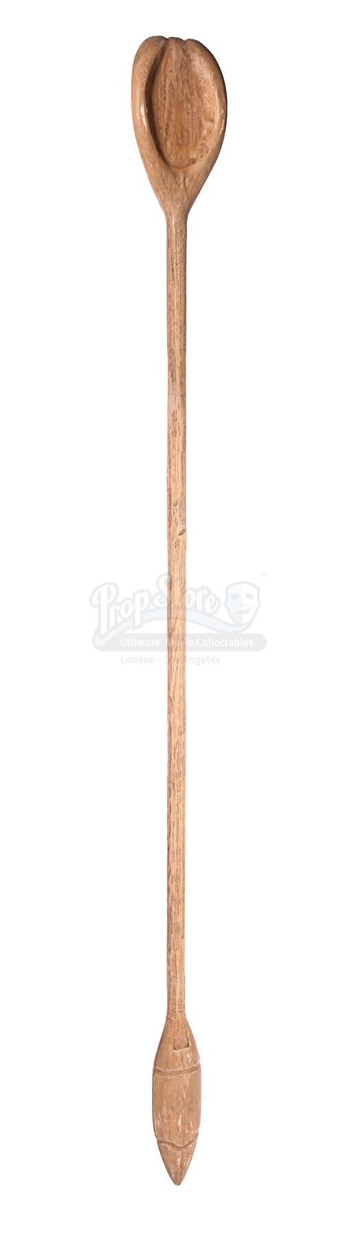 Crafted from dense rubber with an internal metal armature, the staff comprises an oval shaped €˜barrel', a long handle and a large paddle-like head at the opposite end. Painted in a dark copper colour with metallic purple accents, the weapon displays intricate etched patterns, and a green hue has been applied to produce a weathered appearance.