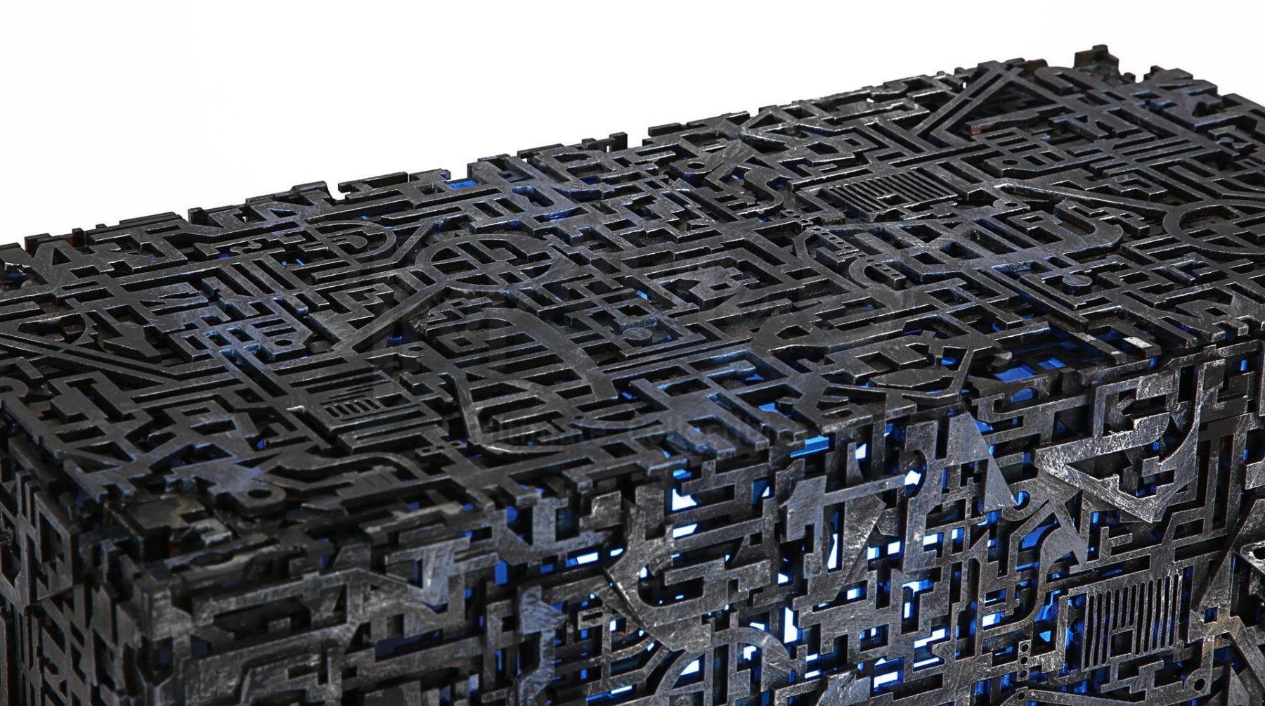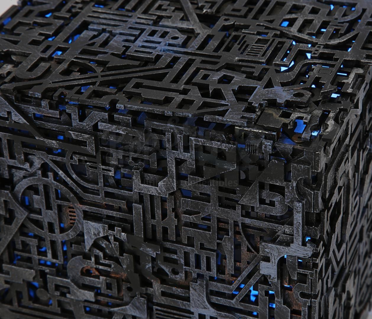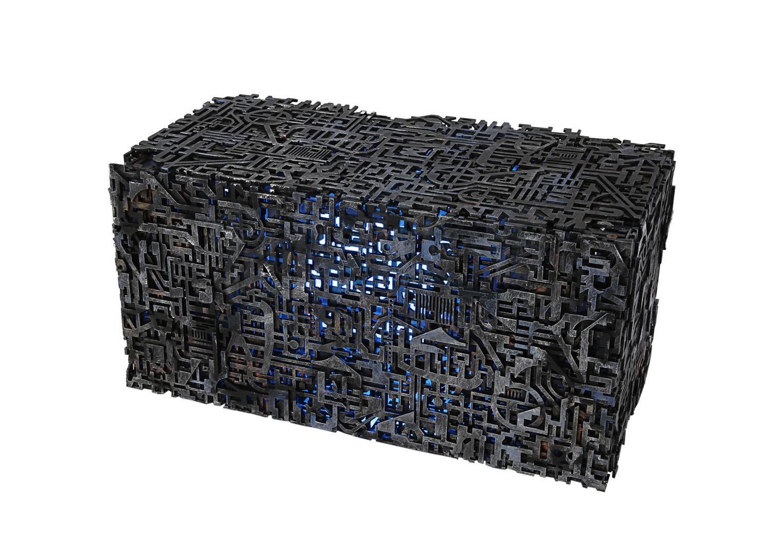 The reactor is a clear acrylic box containing a blue light source. The box is decorated with an intricate, layered pattern made of resin and painted to look like metal. The reactor is illuminated with a hidden switch along one edge, painted to blend in with the pattern. The reactor has some wear from production use and age. Due to the fragility of the resin pattern, several small pieces have come away, and two of the panels are a little loose on the sides. Dimensions: 31 cm x 15.5 cm x 15.5 cm (12 1/4" x 6 1/4" x 6 1/4")