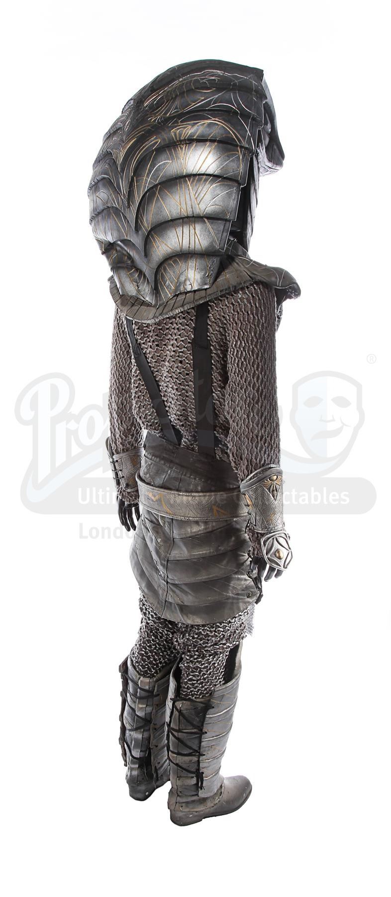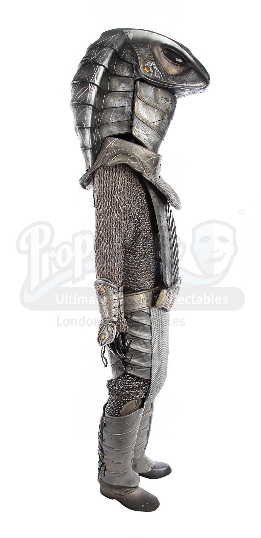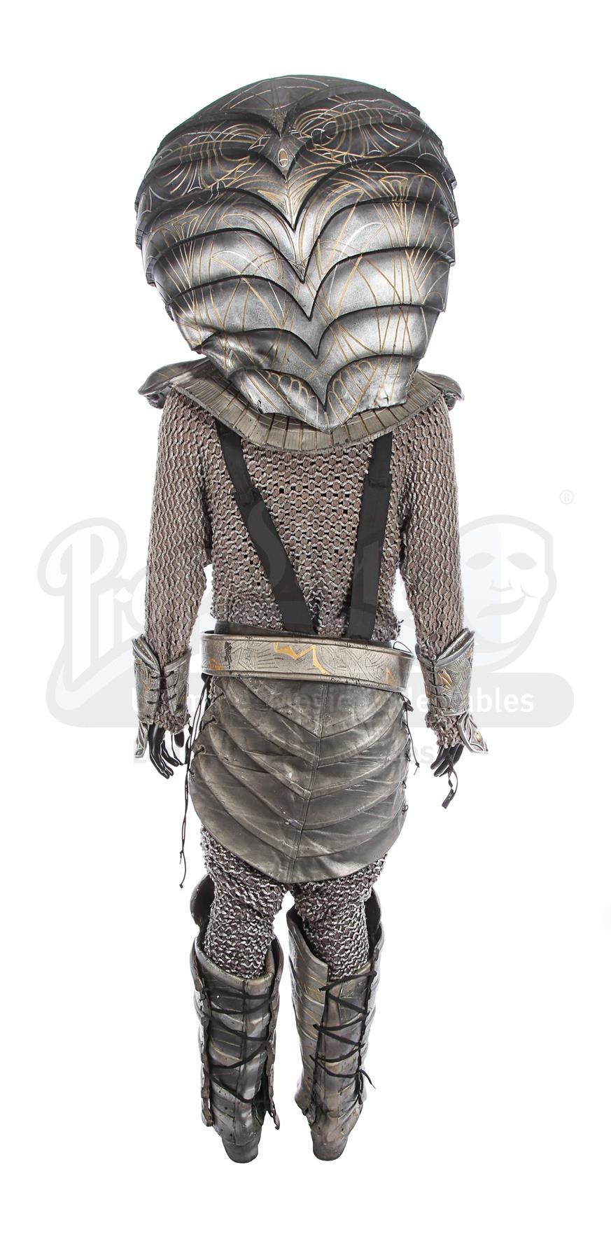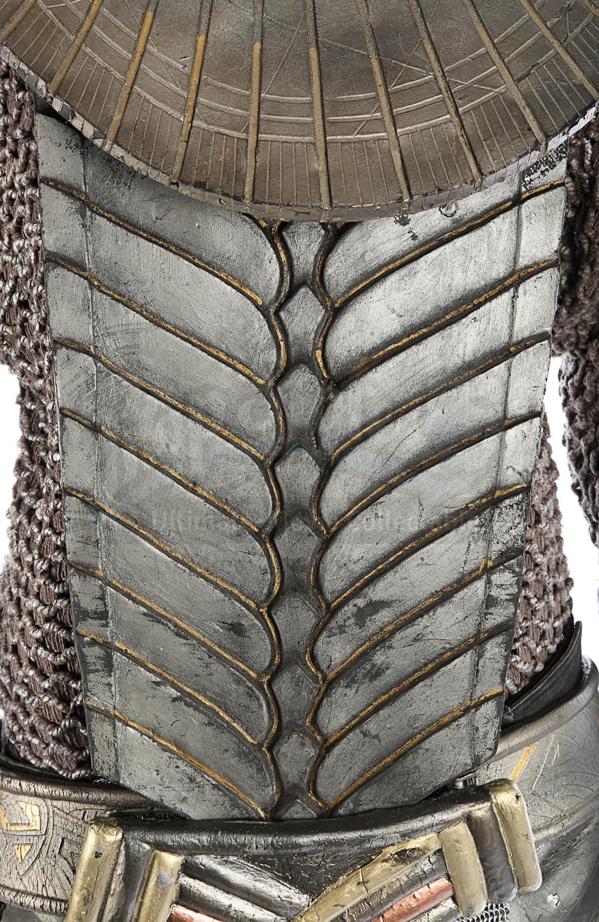 Two torso armour sections are missing from the lot. Signs of production use are present on the costume, including plucks on the woollen garments, marks and surface wear to the armour pieces, and minor cracks on the collar. The lot is accompanied by a studio certificate of authenticity. Dimensions (headpiece): 40 cm x 49 cm x 60 cm (15 3/4" x 19 1/4" x 23 3/4"); (staff): 133 cm x 11 cm x 7 cm (52 1/2" x 4 1/4" x 2 3/4")