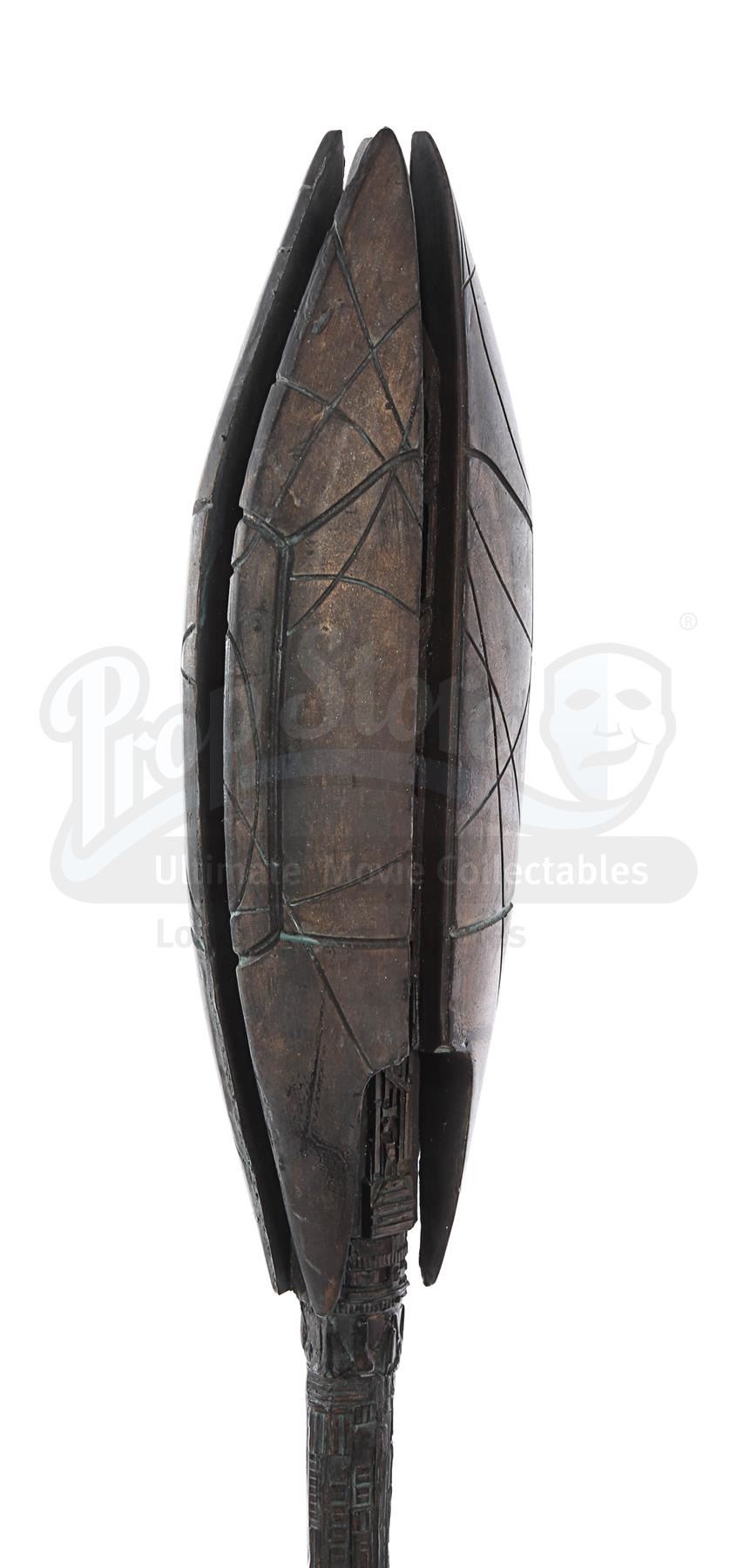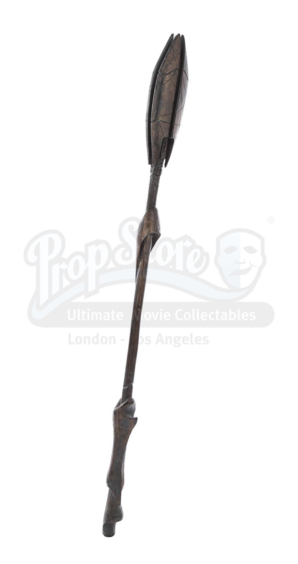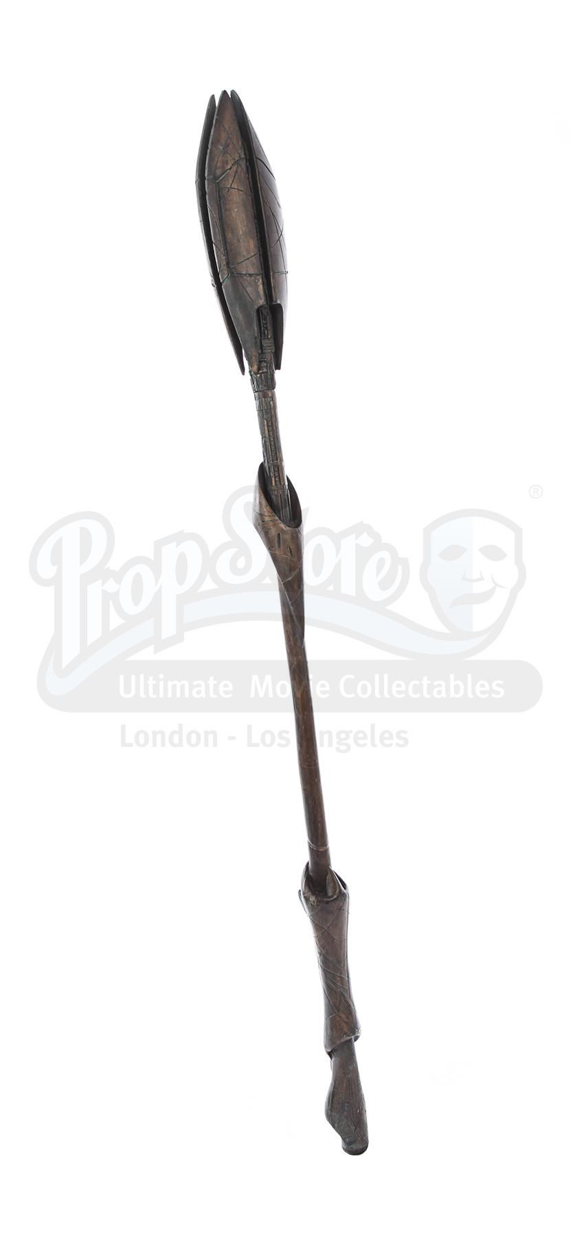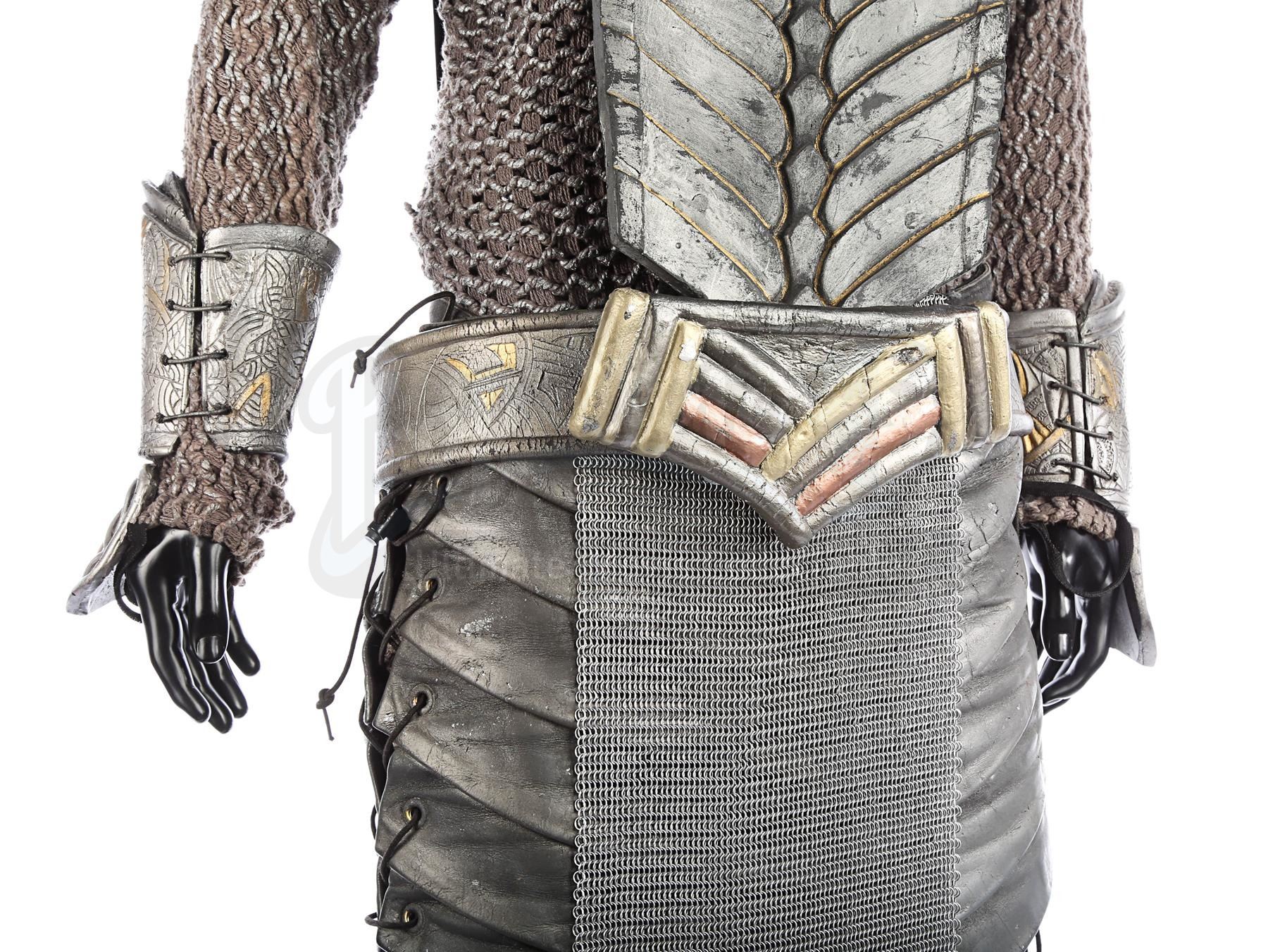 Two torso armour sections are missing from the lot. Signs of production use are present on the costume, including plucks on the woollen garments, marks and surface wear to the armour pieces, and minor cracks on the collar. The lot is accompanied by a studio certificate of authenticity. Dimensions (headpiece): 40 cm x 49 cm x 60 cm (15 3/4" x 19 1/4" x 23 3/4"); (staff): 133 cm x 11 cm x 7 cm (52 1/2" x 4 1/4" x 2 3/4")