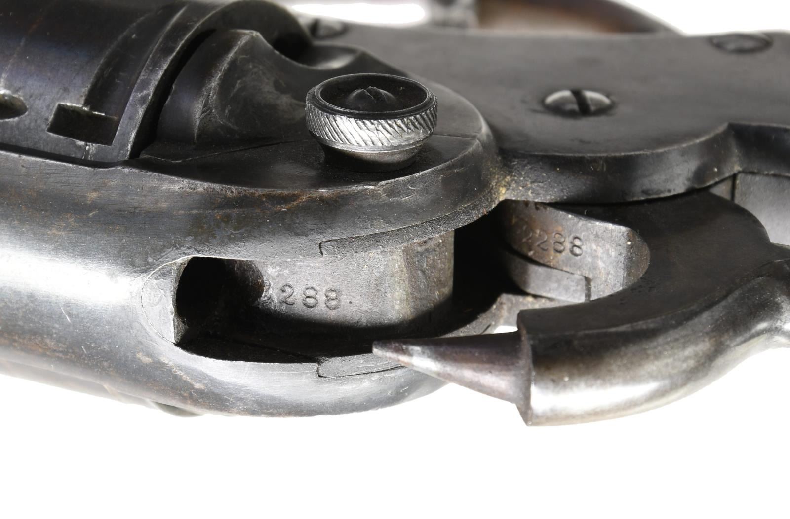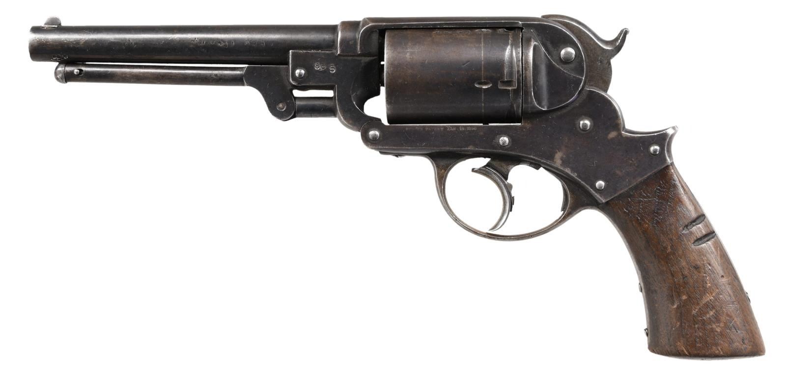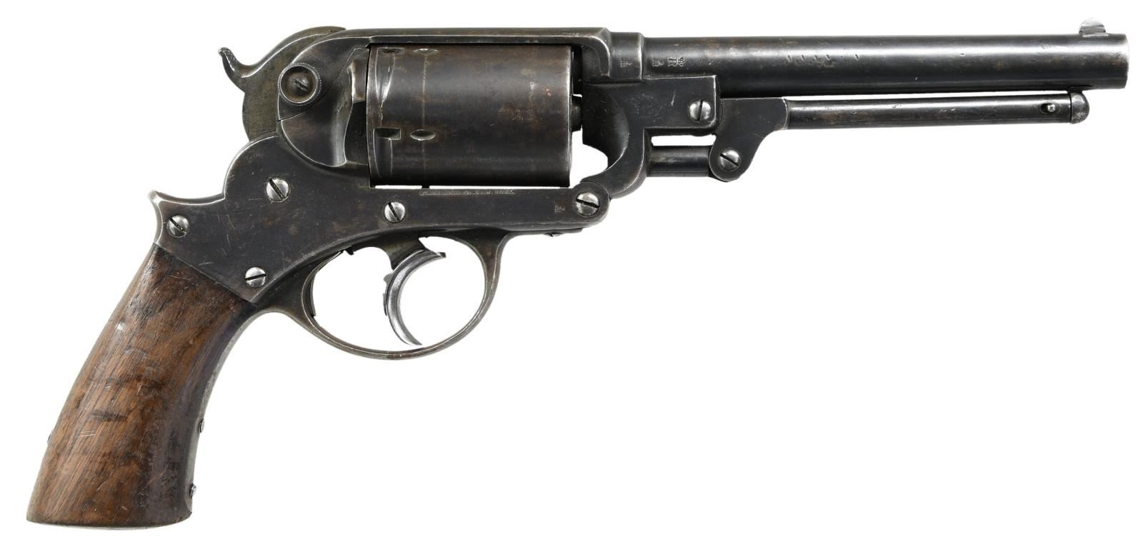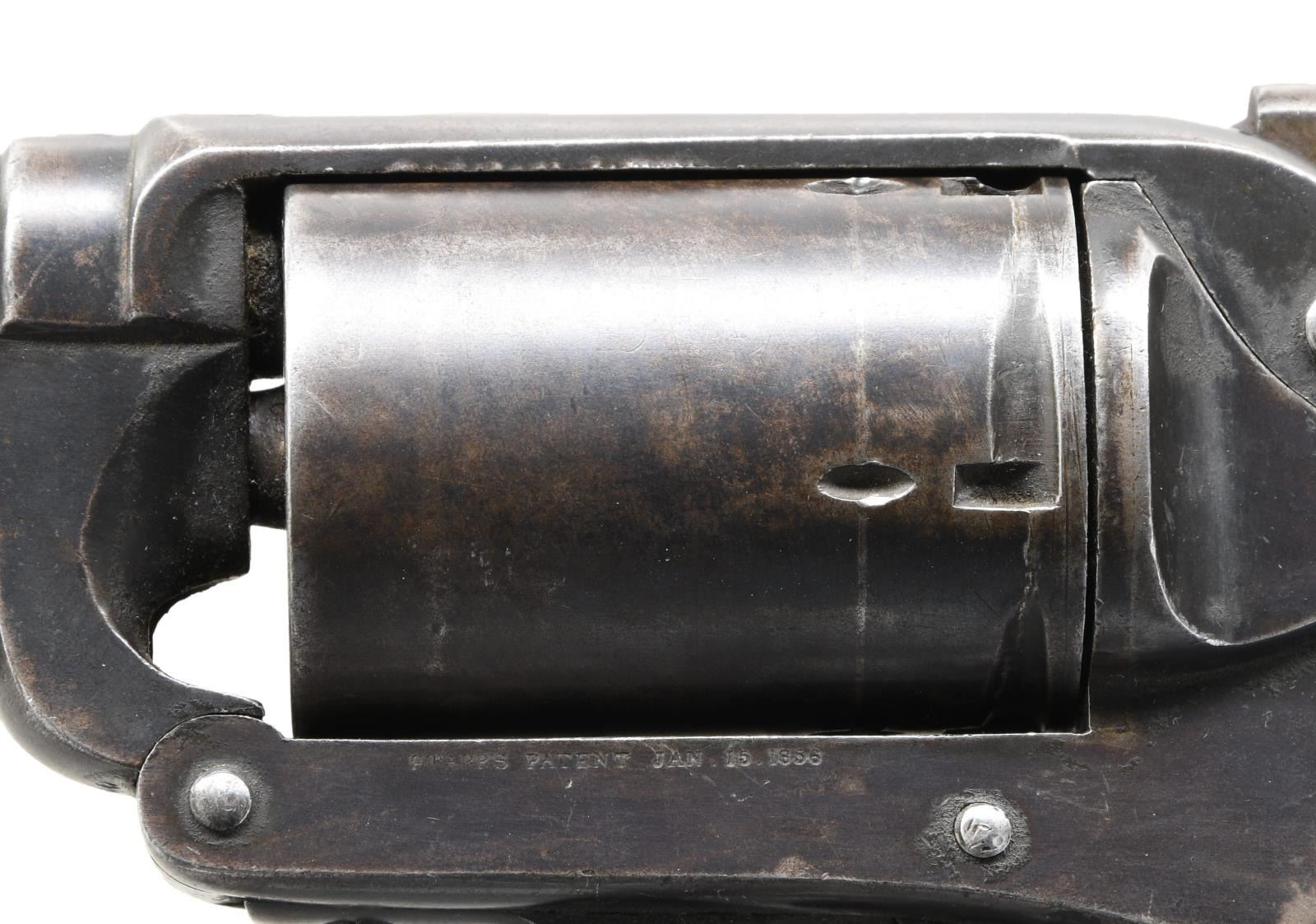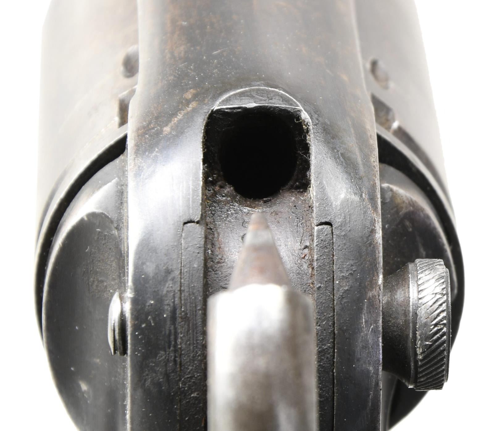 CONVERSION DA REVOLVER. Cal. 44 CF. S# 2288. Bbl. 6" round w/ dovetail mounted semi-circular front sight. Five shot round cyl. w/ added conversion plate at breech end. Right side of bbl. has Birmingham England proofs. Cyl. has Belgian proofs. Right side of frame below bbl. has added hand-stamped number "965". Blue finish. 1 Piece walnut grip has hand-cut notches on butt & left panel. About 23,000 mfg. late 1850s-60s. CONDITION: 40% dull fading blue showing small dents & marks. Grips show heavy wear. Functioning action. Bore retains sound rifling. (01-24387/DS). ANTIQUE. $800-1,200.