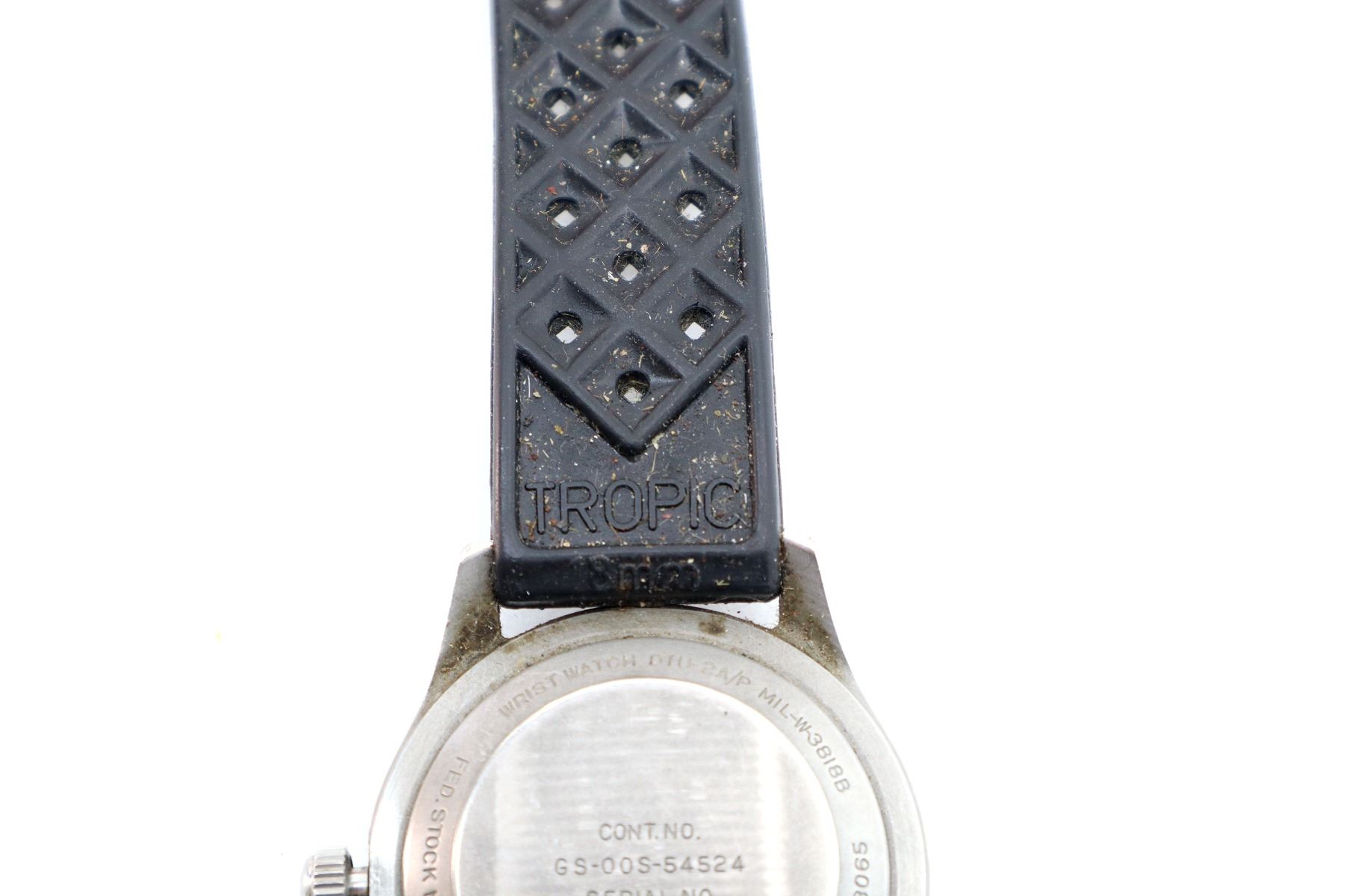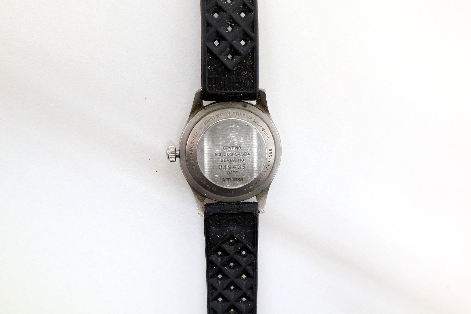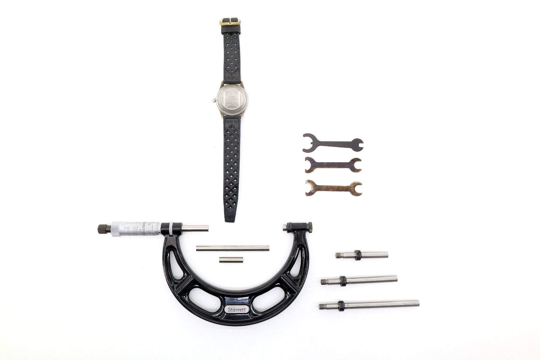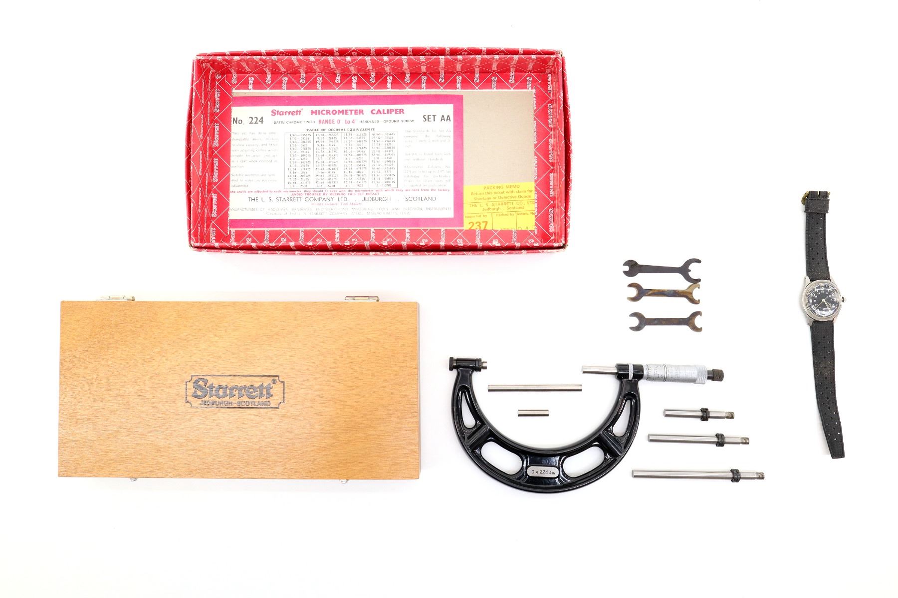 (1) STARRETT MICROMETER CALIPER, SATIN CHROME FINISH, HARDENED-GROUND SCREW, RANGE 0" TO 4", IN ORIGINAL PACKAGING WITH TABLE OF DECIMAL EQUIVALENTS, UNTESTED & (1) TROPIC WRIST WATCH, MARKED "CONT. NO. GS-00S-54524, SERIAL NO. 049439, DATE APR 1965", REQUIRES NEW BATTERY, UNTESTED. SEE PHOTOS.