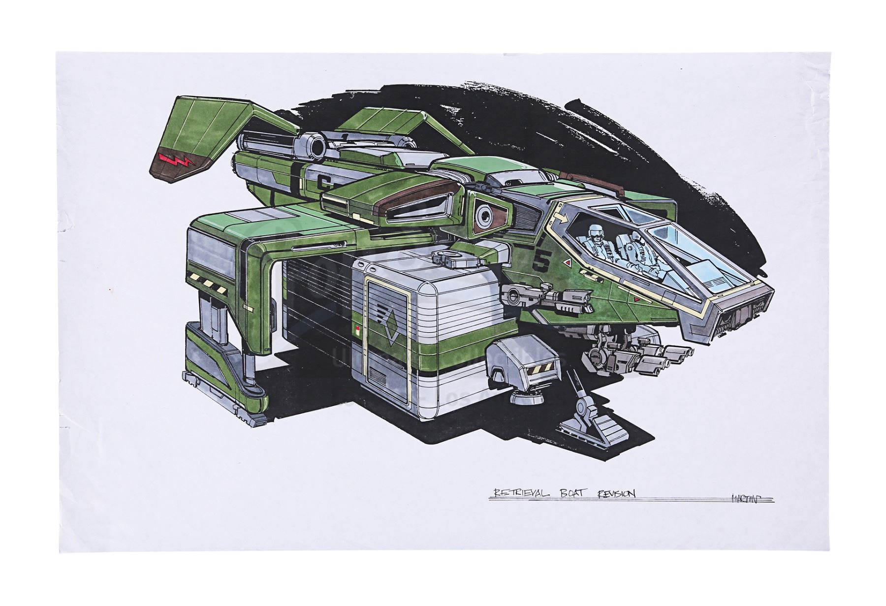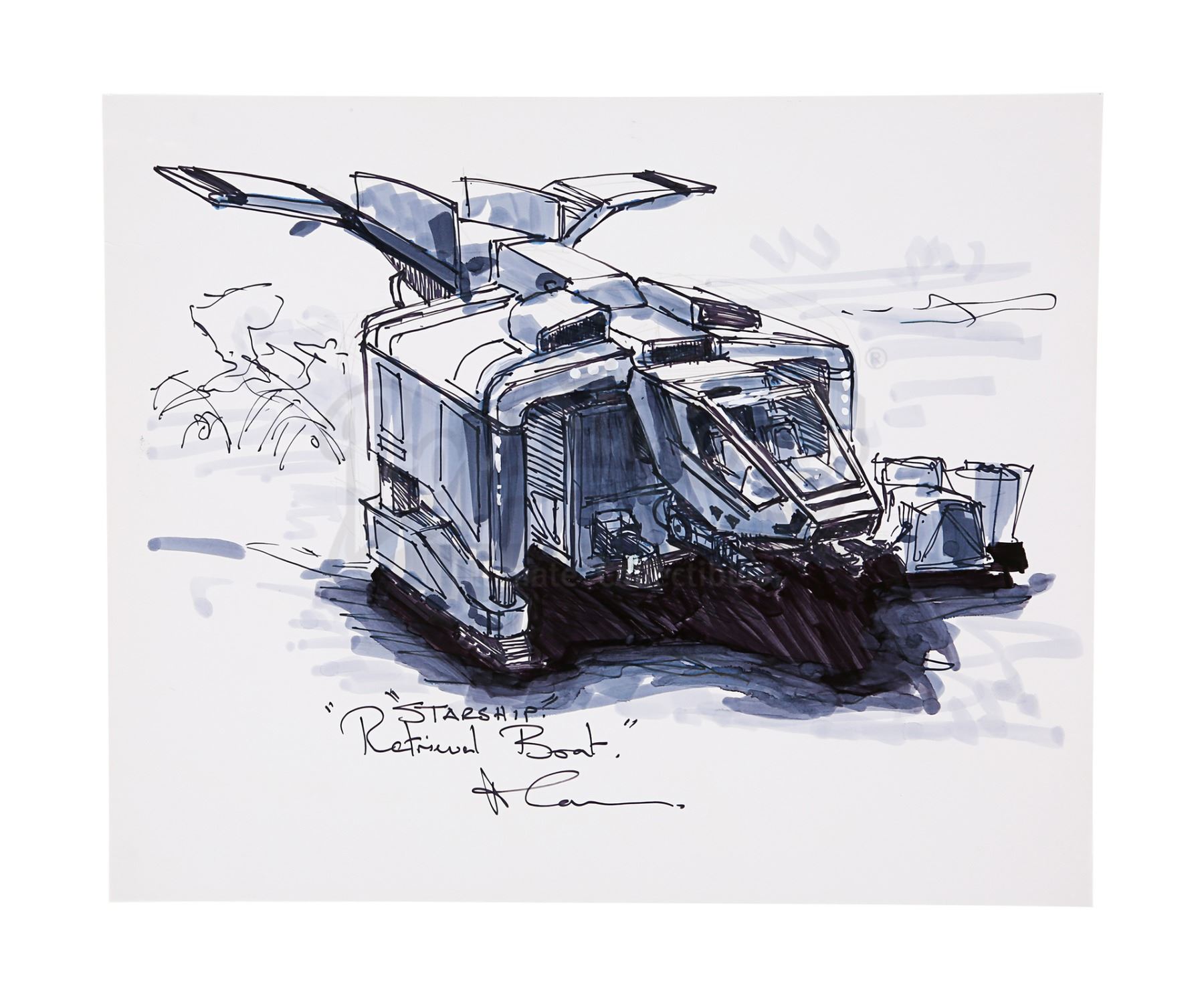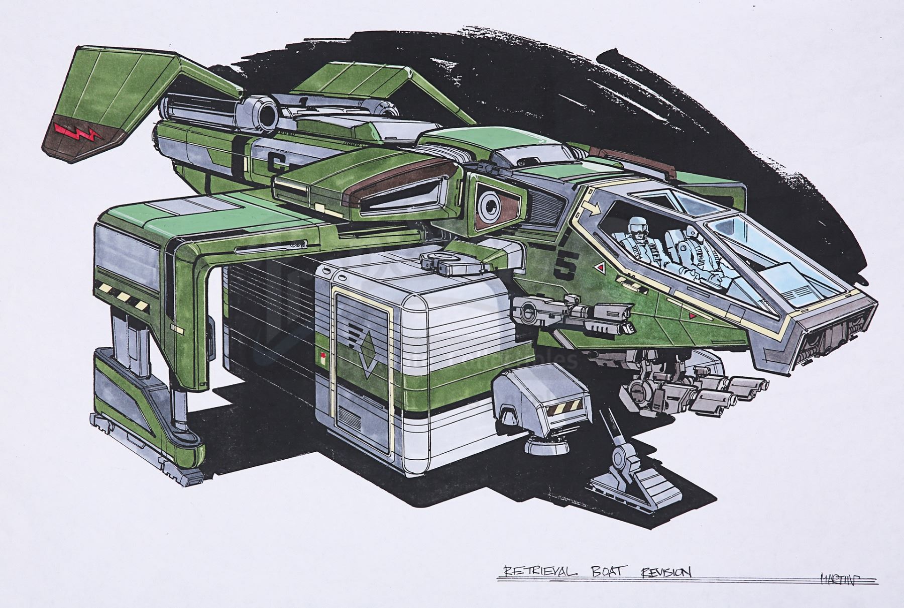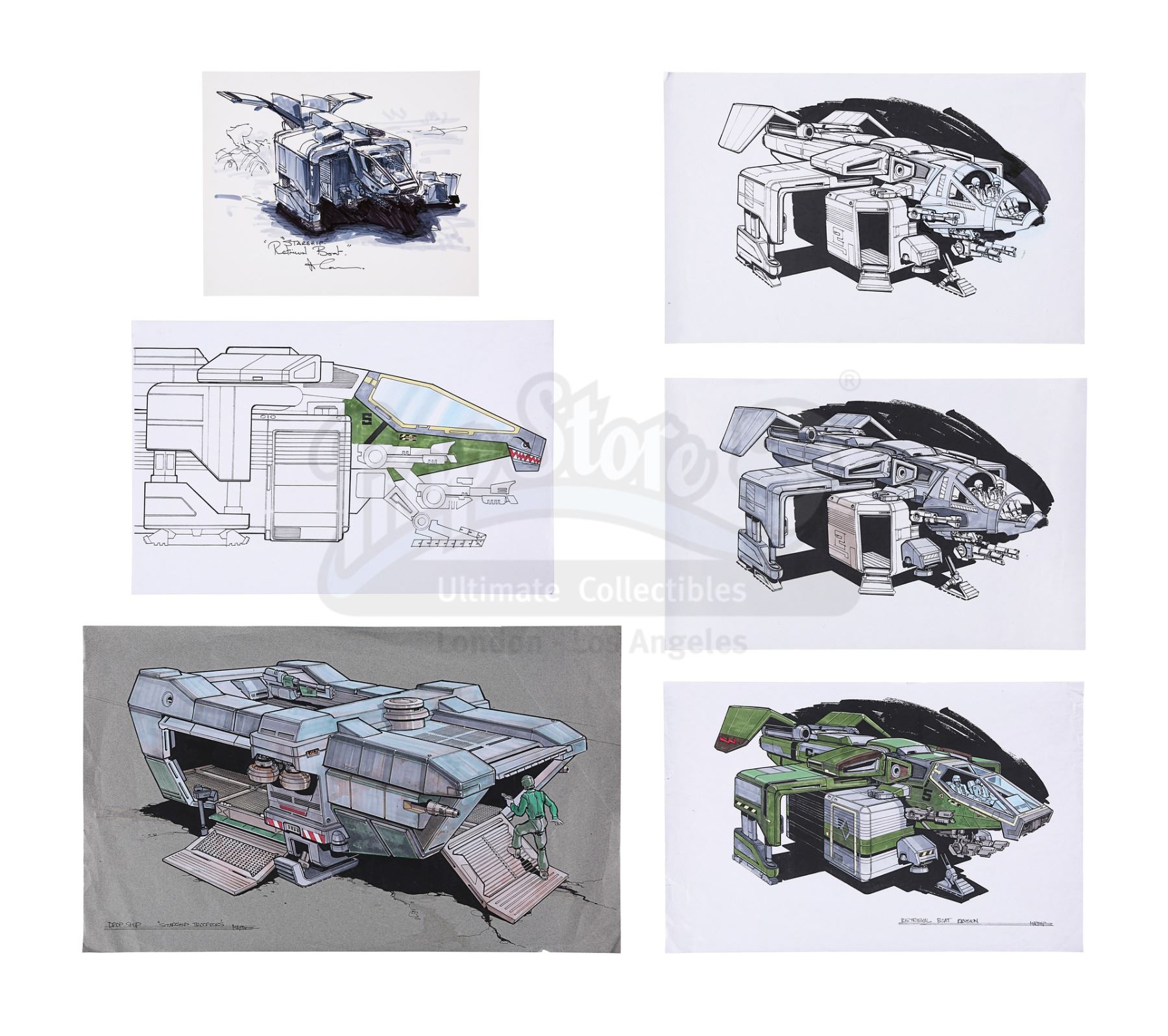 A set of six hand-drawn and hand-coloured retrieval boat concept designs from the production of Paul Verhoeven's sci-fi action film Starship Troopers. This collection of artwork features five pieces of printed and hand-coloured pieces by Jim Martin, as well as one hand-drawn and coloured piece signed in black pen by production designer Allan Cameron. One of the Martin pieces has been mounted onto grey card and the Cameron piece is rendered onto white card. The pages have some minor wear from production use and age, including curled corners and some minor staining. Dimensions (largest artwork): 33 cm x 55 cm (13" x 21 3/4")