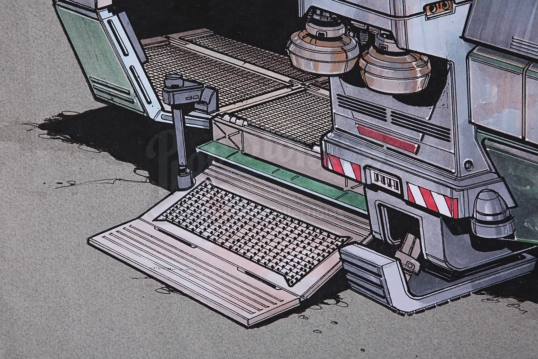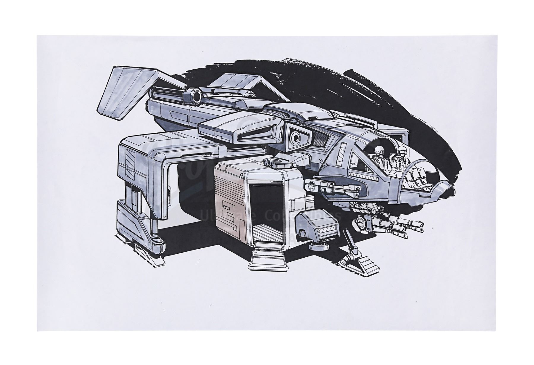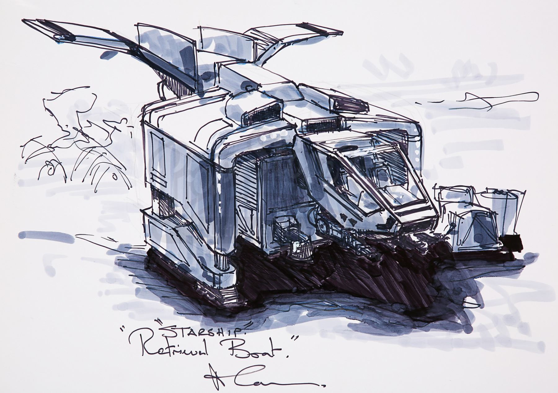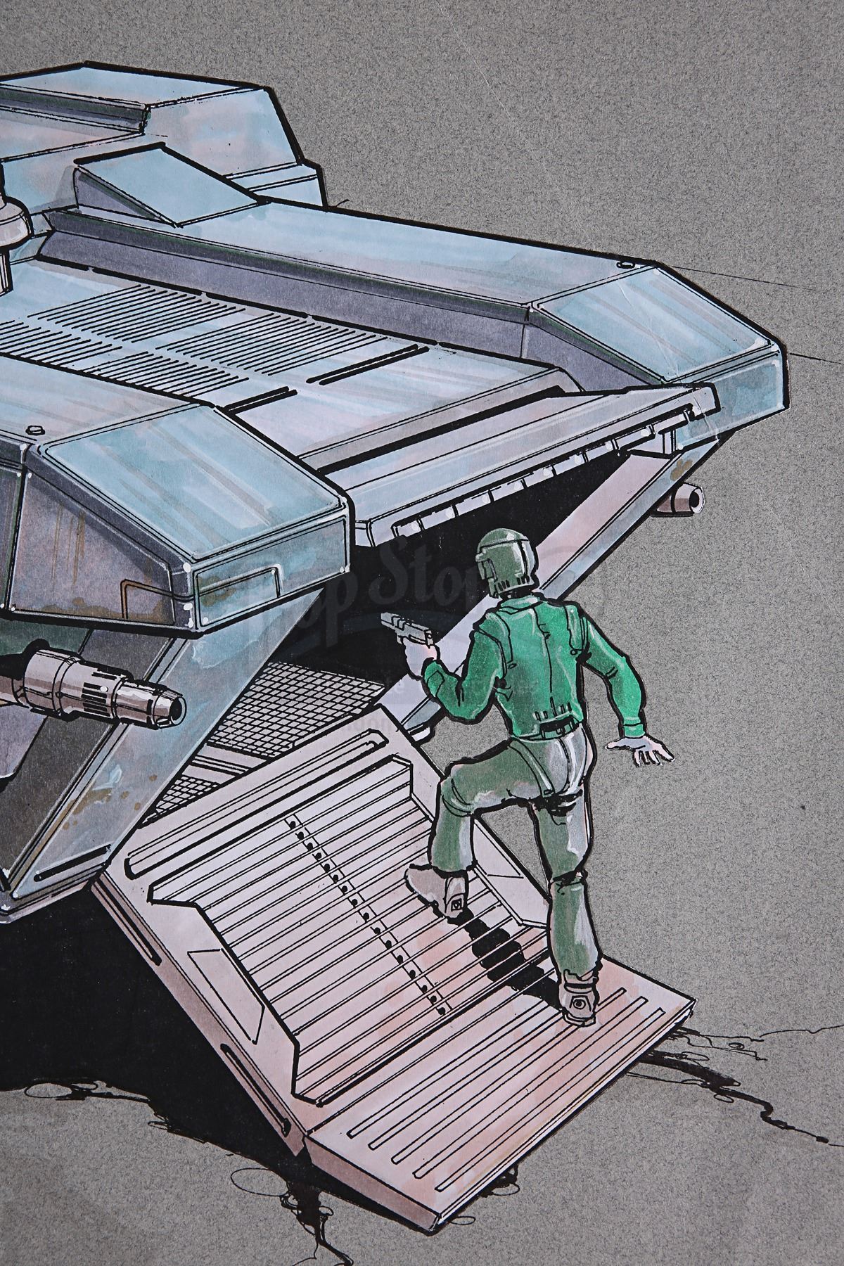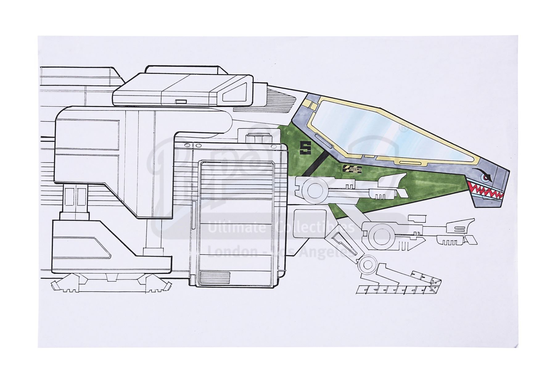 A set of six hand-drawn and hand-coloured retrieval boat concept designs from the production of Paul Verhoeven's sci-fi action film Starship Troopers. This collection of artwork features five pieces of printed and hand-coloured pieces by Jim Martin, as well as one hand-drawn and coloured piece signed in black pen by production designer Allan Cameron. One of the Martin pieces has been mounted onto grey card and the Cameron piece is rendered onto white card. The pages have some minor wear from production use and age, including curled corners and some minor staining. Dimensions (largest artwork): 33 cm x 55 cm (13" x 21 3/4")