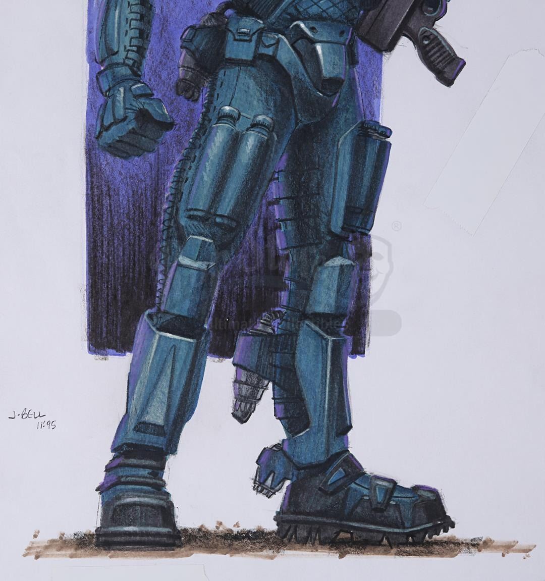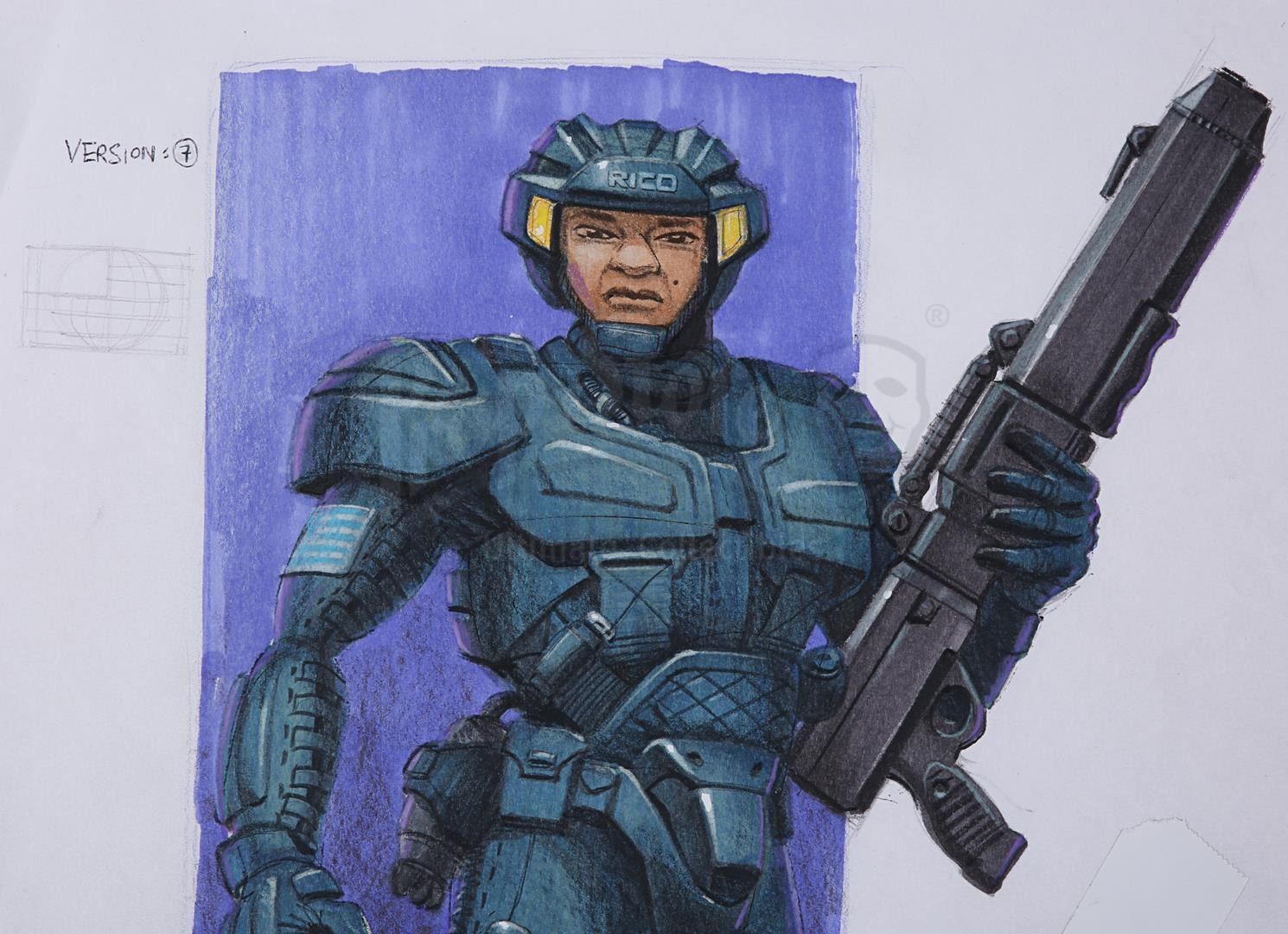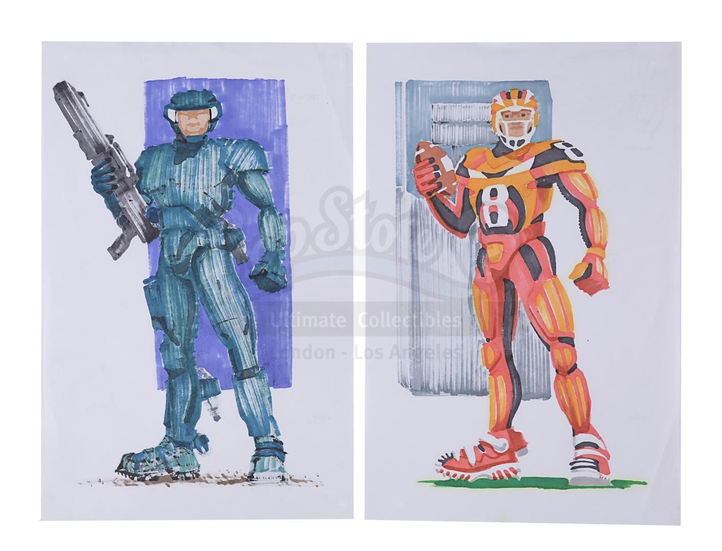 A pair of hand-painted concepts for Johnny Rico (Casper Van Dien) from the production of Paul Verhoeven's sci-fi action film Starship Troopers. John Bell created these two concept artworks, one of which shows Rico in his jumpball uniform and the other in his Mobile Infantry uniform.