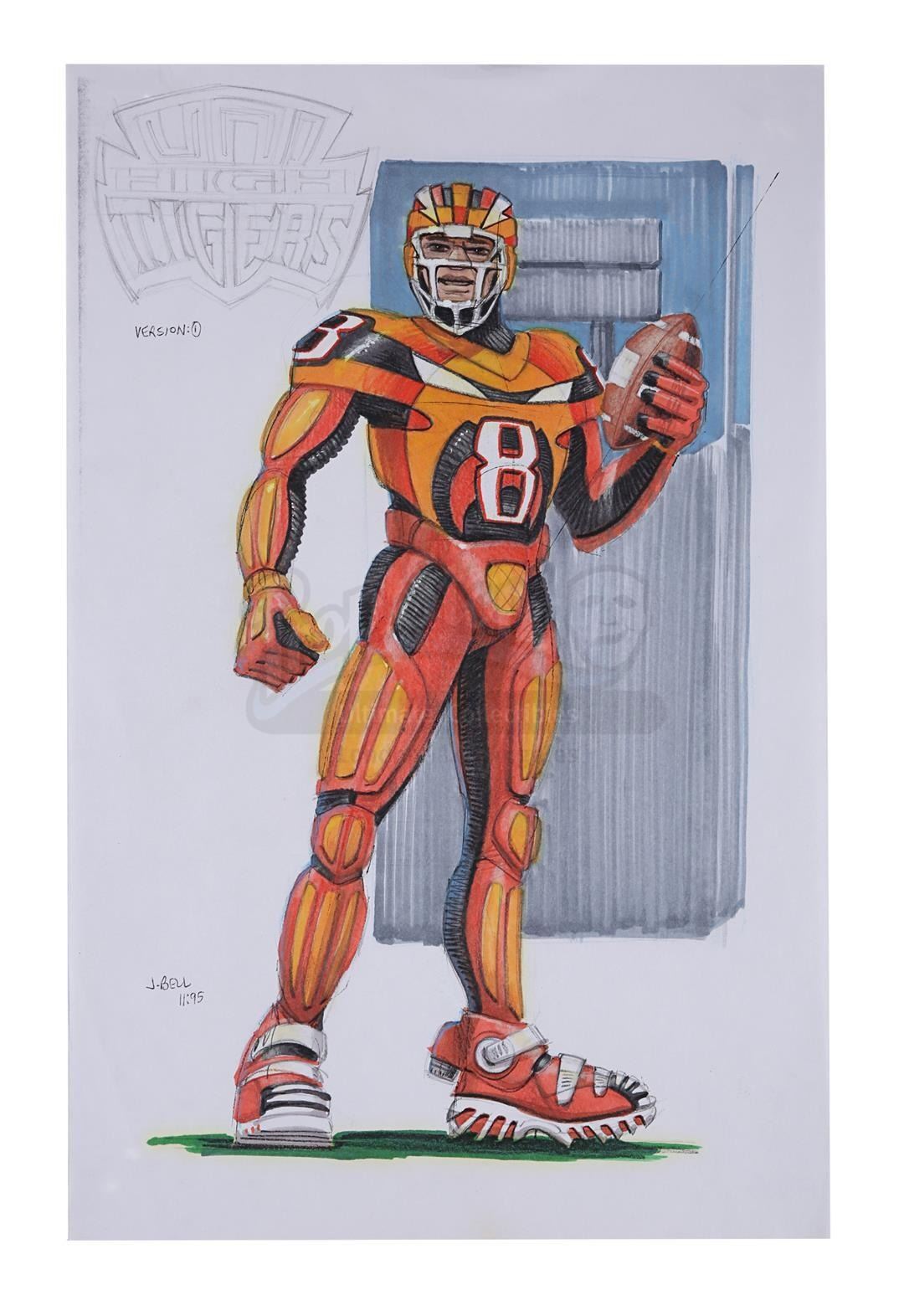 Both are rendered in pencil and black pen, then hand painted. The jumpball uniform concept is labelled "Version 1", while the military uniform concept is labelled "Version 7", with both signed and dated "J. Bell 11:95". The artworks have some creases and minor staining, and the military uniform concept has a piece of white tape adhered to the bottom. Dimensions: 43 cm x 28 cm (17" x 11")