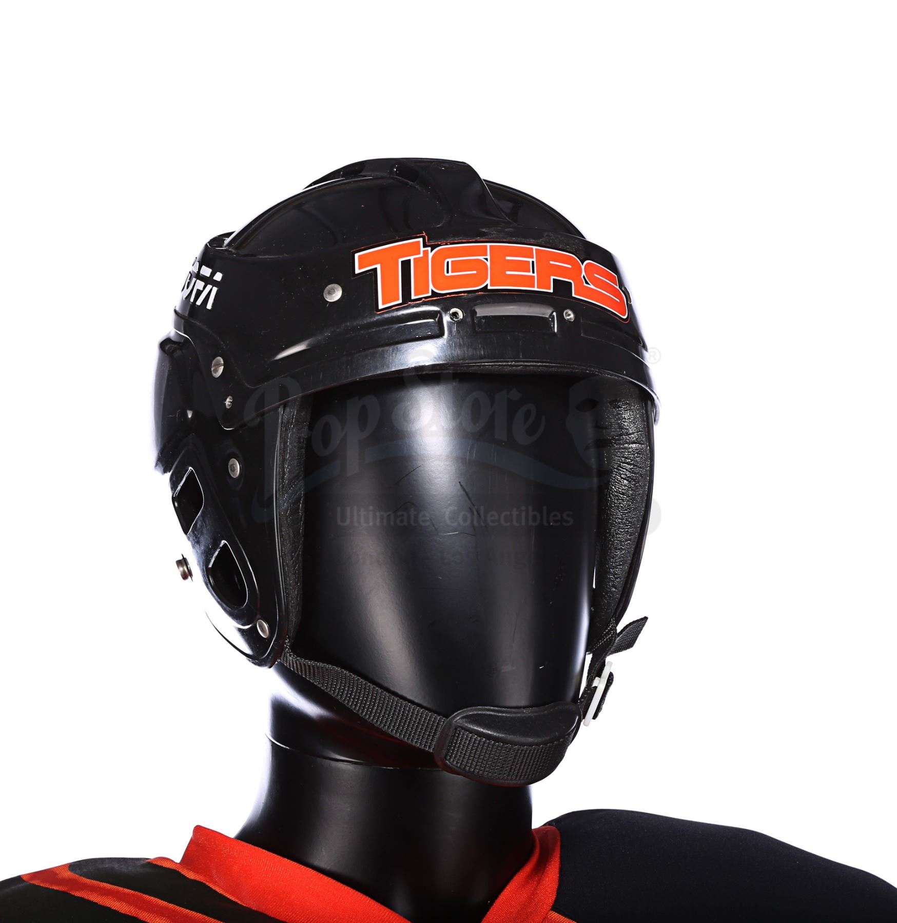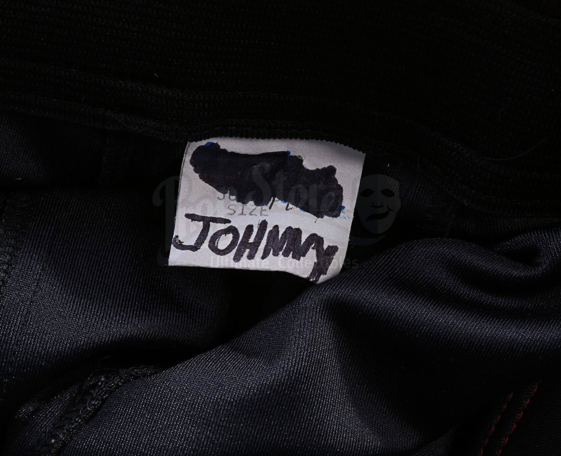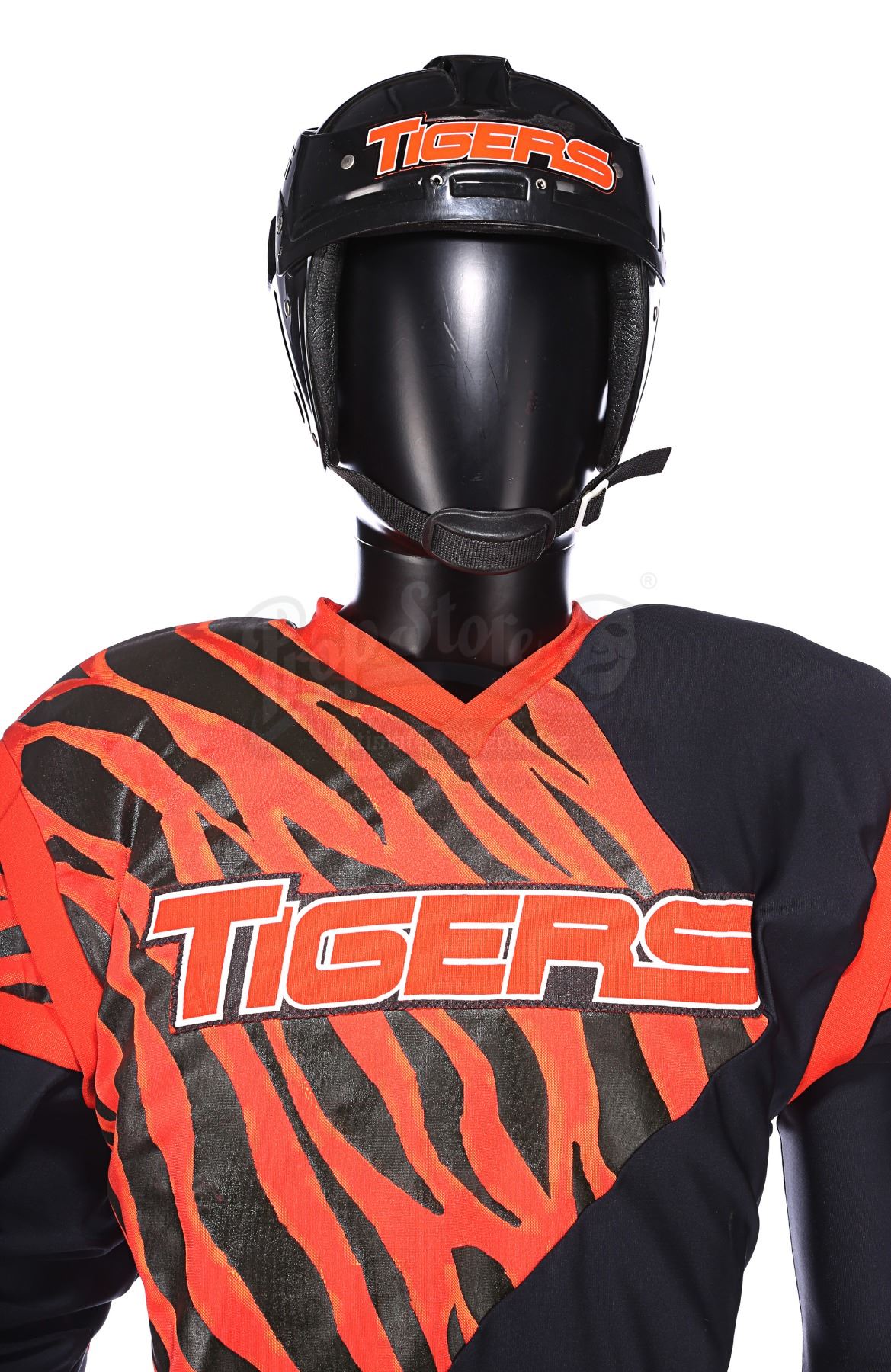 The costume consists of a black ice hockey helmet with a chinstrap and an orange Tigers logo on the front; a padded black Lycra top decorated with orange tiger stripes and the number 7 stitched on the back (labelled "Johnny"); a pair of black-and-orange gloves (size XL); a pair of black Lycra trousers with segments of orange padding running down the sides and a lace-up front (labelled "Johnny"); and a pair of UK size 9.5 high-top adidas trainers (labelled "Johnny #7"). The costume shows signs of minor wear from production use, including dirt remnants on the shoes and marks on the top.