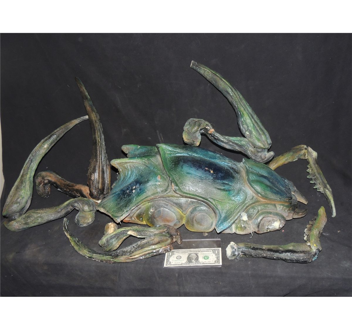 This is the Alien Scorpion bug that gets blown up in STARSHIP TROOPERS MARAUDER. One of the legs is melted and this shows battle damage. The tail was the same one from the Hero Animatronic so it is gone. This can be reasonably reassembled to make an incredible display. The colors are slightly different to work with the CGI.