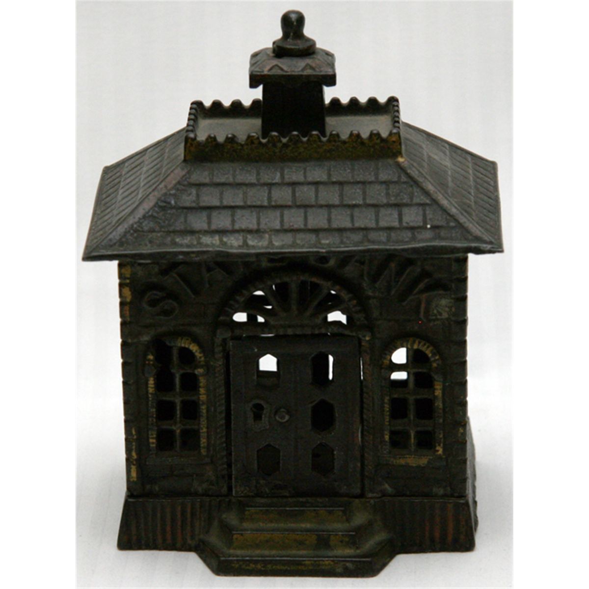 STATE BANK. Bank building. Coin opening at top, back. No handle, key, serial number or patent number.10cm x 15cm x 9cm. Cast iron, dark brown-black finish. Maker unknown. Fine.