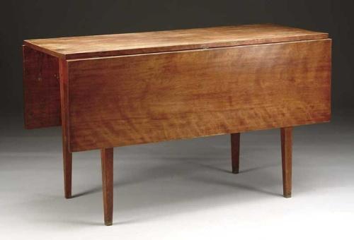 STATE OF MAINE HEPPLEWHITE WAVY BIRCH DEEP DROP LEAF DINING TABLE. Square tapered splayed legs, straight leaves in a light stain. Late 18th/first quarter of the 19th Century. SIZE: 28-1/2” h x 49” d x 18-1/2” (closed); 47-1/2” (open). CONDITION: Generally very good. Top has reset screws. 9-26865