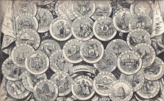 ~STATE OF THE UNION - Coats of Arms~ MATTED PRINT from a collection of rare prints. Each print from the collection were literally discovered in the attic of a South Carolina pre-civil war mansion. Each print was made by carving the scene, in reverse, into a wood block. Rare, fine condition and below market value with an estimate of $200 - $400. MWF2473