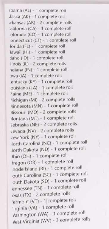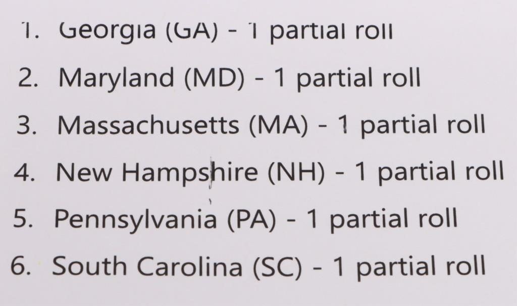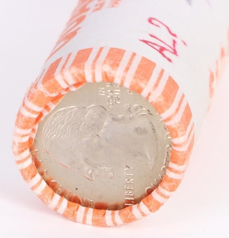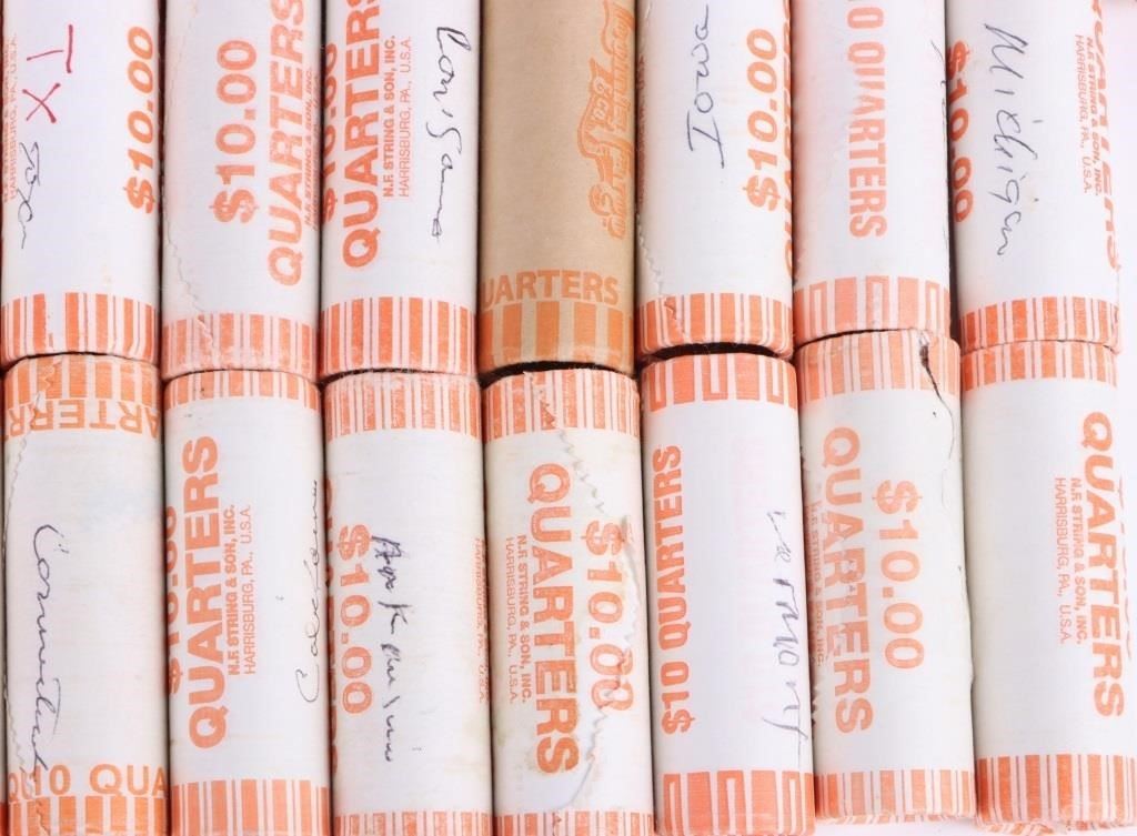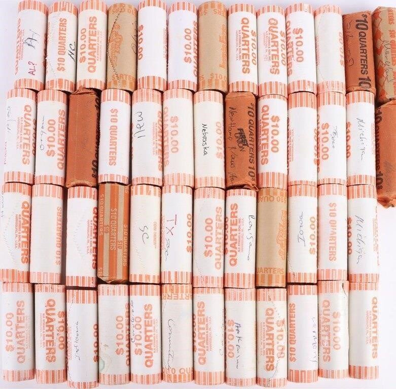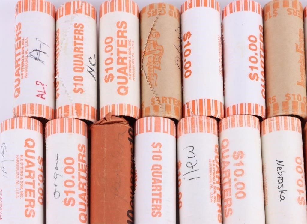 Collection of early 2000s State Quarters, consisting of 50 rolls in total. The lot includes complete rolls from the following states: Alabama, Alaska, Arkansas, California, Colorado, Connecticut, Florida, Hawaii, Idaho, Illinois, Indiana, Iowa, Kentucky, Louisiana, Maine, Michigan, Minnesota, Missouri, Montana, Nebraska, Nevada, New York, North Carolina, North Dakota, Ohio, Oregon, Rhode Island, South Carolina, South Dakota, Tennessee, Texas, Vermont, Virginia, Washington, and West Virginia. Partial rolls are available from Georgia, Maryland, Massachusetts, New Hampshire, Pennsylvania, and South Carolina. All rolls are in good condition and are offered as described.