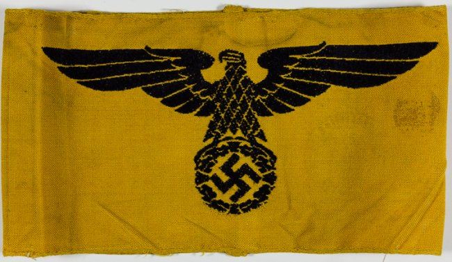 State Service armband, 14 1/2" long with BeVo eagle and swastika embroidered on yellow cotton, 4" wide, expertly joined on the reverse. Very good.