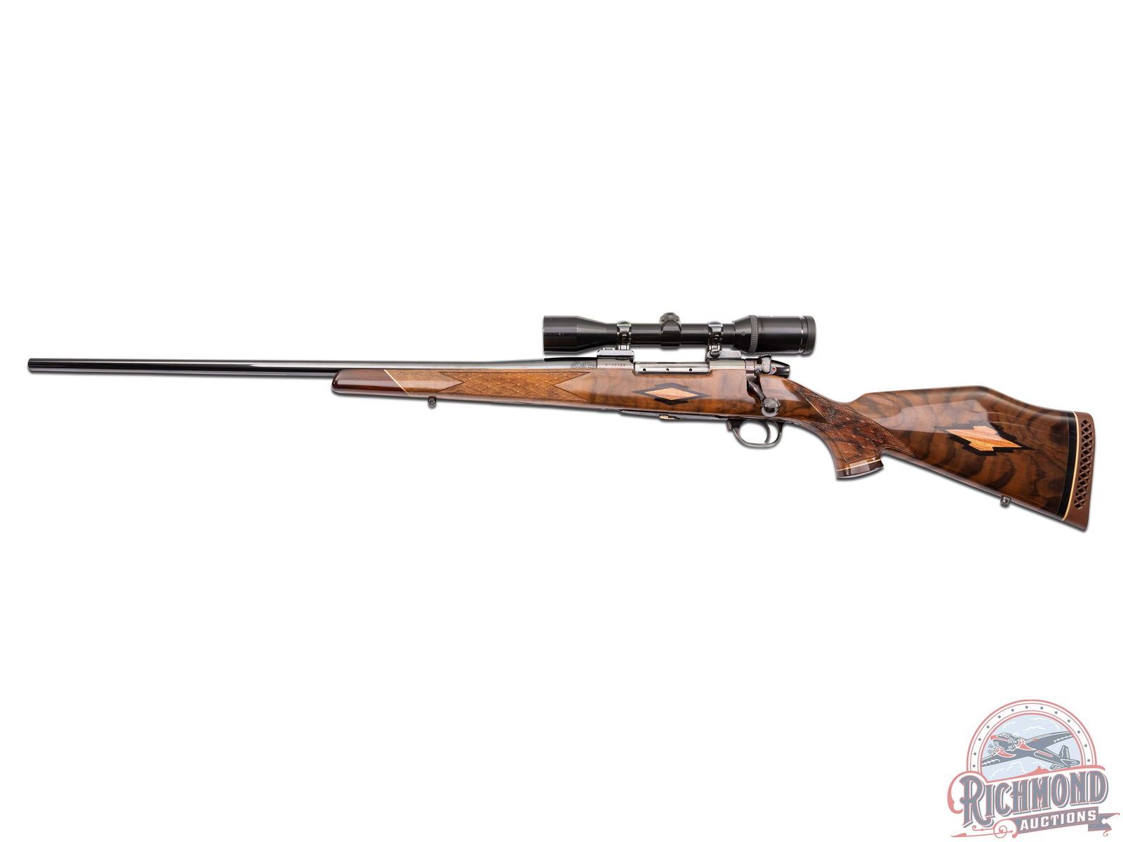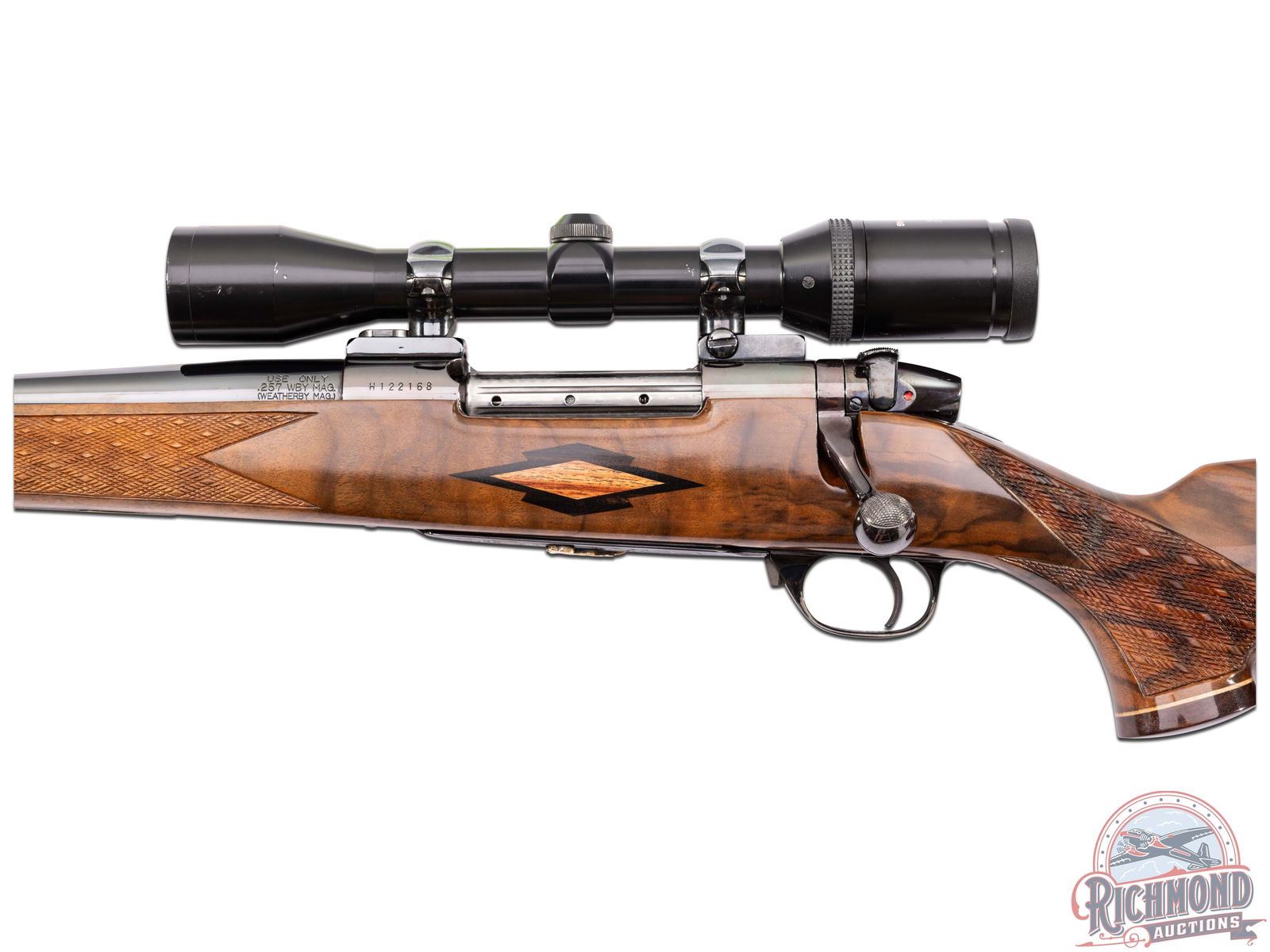Manufactured circa 1980 in Japan for Weatherby South Gate, CA. Features a 26" blued round sightless tapered barrel with high polish, stamped "USE ONLY 257 WBY MAG." Left hand action receiver is a high polish blued stamped "MARK V / Weatherby South Gate, Calif, Made in Japan". Machine jeweled 9 lug bolt, two position safety, knurled bolt knob. Equipped with Redfield scope mounts and a 3-9x36 Swarovski Habicht scope. Beautiful engraved floorplate with scroll and punch dot background surrounding a gold embossed Big Horn sheep. Bottom of trigger guard has matching engraving. Stock is a 2X walnut Monte Carlo style with rosewood forearm tip and pistol grip cap with white diamond inlay. Pistol grip and forearm are hand checkered with 12 LPI skip-line checkering. Left side of the stock and both sides of the receiver feature a diamond bi-wood inlay consisting of ebony and birch. Bottom of stock features a similar inlay with gold engraved diamond and initials "M.P.T." Factory sling swivel studs. butt stock is fitted with a factory ventilated recoil pad. LOP: 13-1/2". CALIBER: 257 WBY MAG. S/N: H122168. FFL STATUS: Modern.