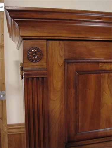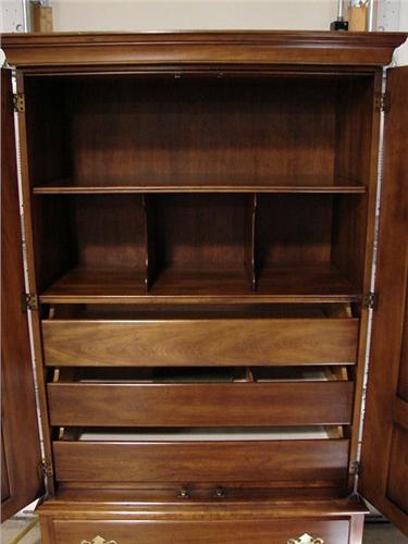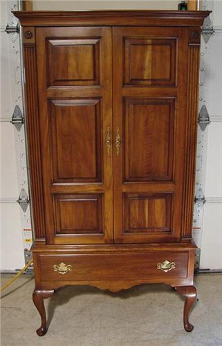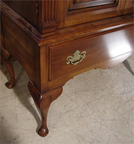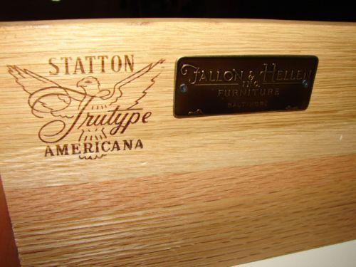 STATTON CHERRY QUEEN ANNE STYLE LINEN PRESS. Sold by Fallon & Hellen Furniture, Baltimore, Maryland. Has two 3-lite raised panel doors with fitted interior & three linen drawers. Has single dovetailed drawer at bottom. Marked on inside of bottom drawe