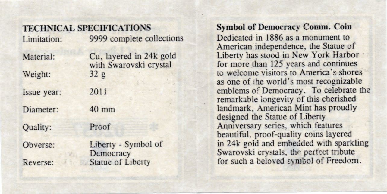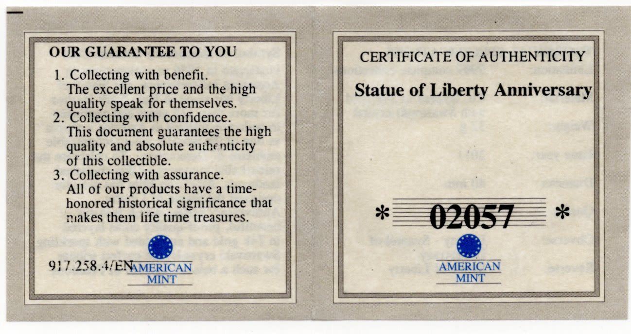 STATUE OF LIBERTY ANNIVERSARY COIN WITH COA