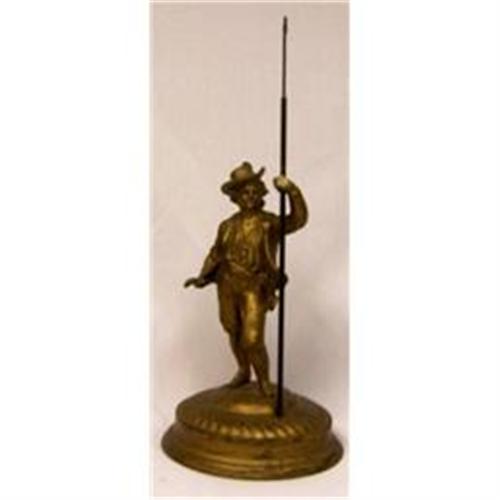 THIS IS THE NEATEST WATCH HOLDER I HAVE EVER SEEN! IT IS A MAN DRESSED IN EARLY CLOTHING WITH A JACKET, BOOTS AND A HAT WITH A FEATHER HOLDING A SHERPARD'S HOOK.HE HAS A BELT THAT IS TIED LIKE A BOW.HIS HAIR IS LONG AND CURLY.IT IS PAINTED GOLD EXCEPT FOR THE SHEPARD'S HOOK AND IT IS BLACK.ON THE SHEPARD'S HOOK YOU HANG YOUR POCKET WATCH FROM IT.ON THE BASE NEXT TO HIS FEET IT HAS C.P.F.THESE ARE VERY HARD TO FIND.YOU POCKET WATCH COLLECTOR'S CHECK THIS OUT!!!