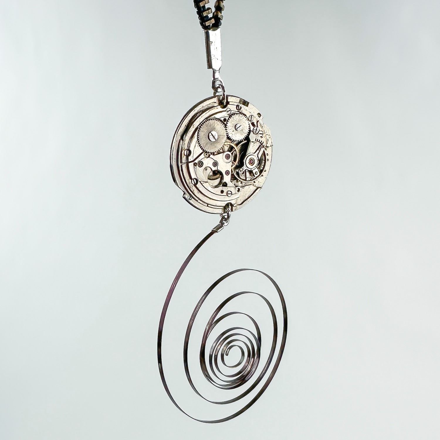 #8691 - UNMARKED - AGE AND MAKER UNKNOWN. STEAMPUNK STYLE JEWELRY NECKLACE WITH LOBSTER CLAW CLASP. WATCH MOVEMENTS AND GEAR PENDANT WITH DANGLE WATCH SPRING. WRISTWATCH PARTS ARE CONNECTED TO A CLOTHING ZIPPER NECKLACE. COSTUME JEWELRY DANGLE NECKLACE. LENGTH OF NECKLACE IS 16.5” (42 CM) LONG - DANGLE WATCH PARTS ARE 3” (7.5 CM) LONG