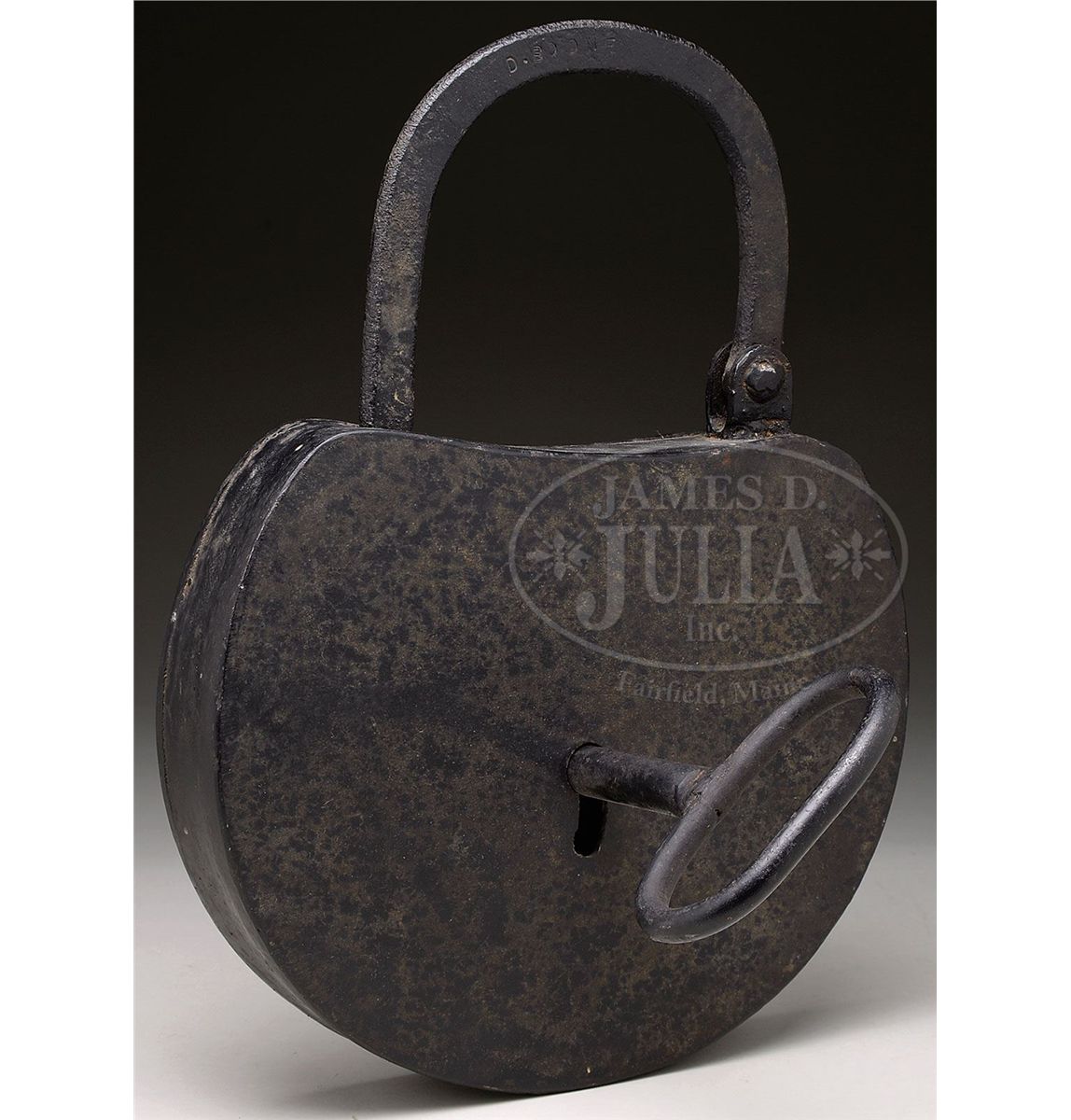 20th Century vintage hollow-bodied padlock constructed from welded steel plate features a key and working keeper. Top of rod iron clasp is stamped "D. Boone". SIZE: 13" x 17-1/2". CONDITION: Very good working condition. 1-13427