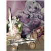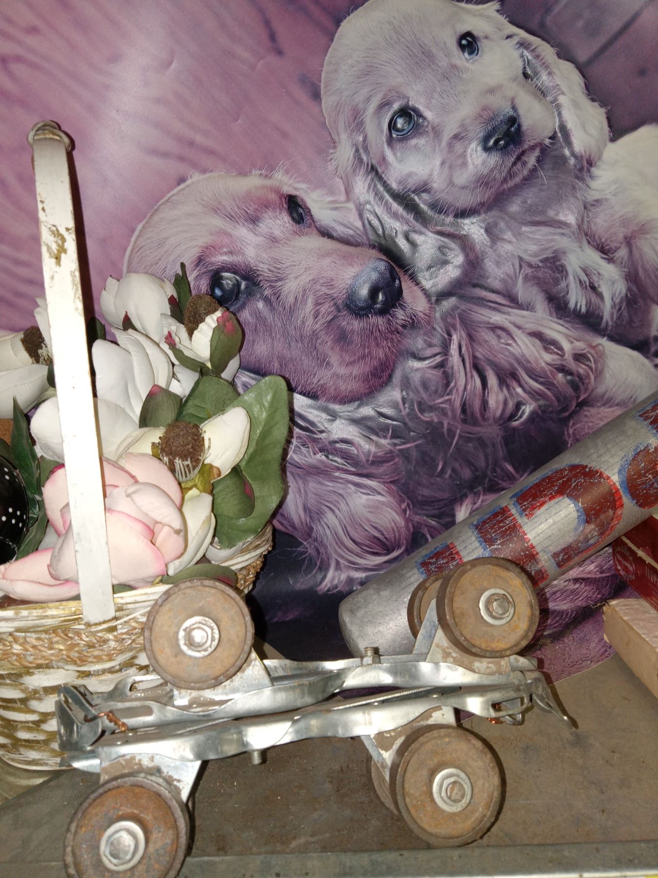 STEEL ROLLER SKATES & SHELF CONTENTS. SEE PICTURES.