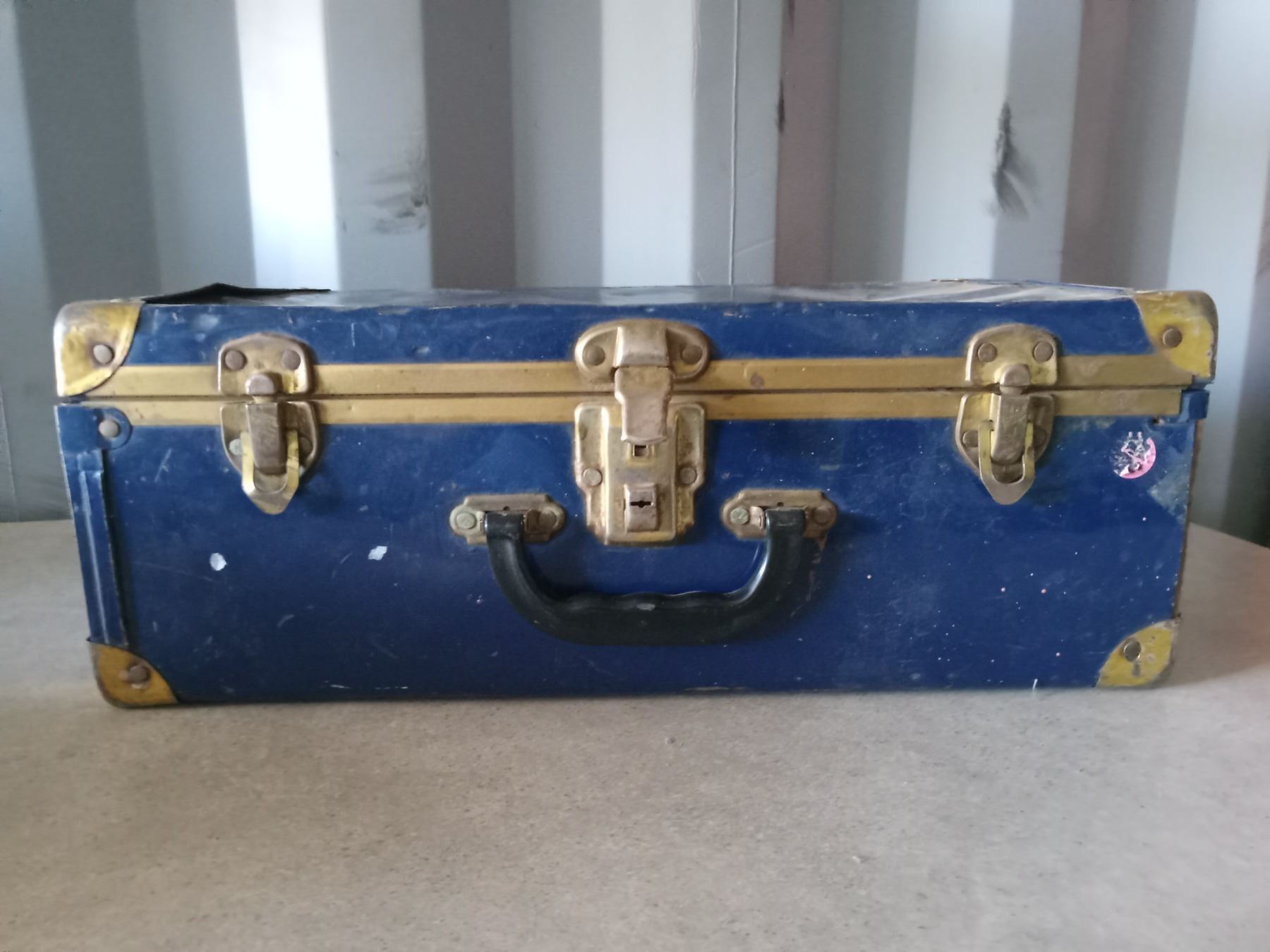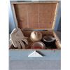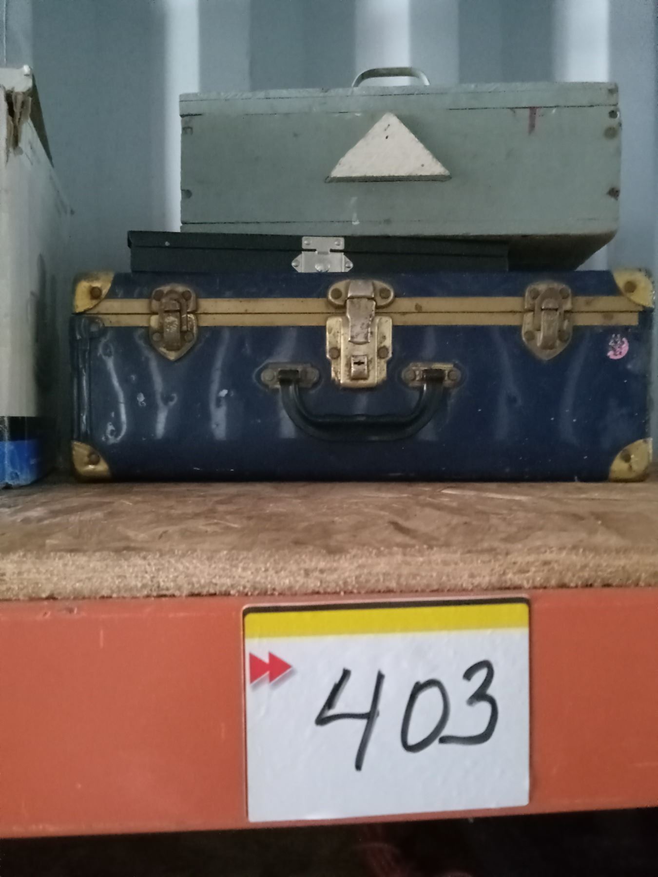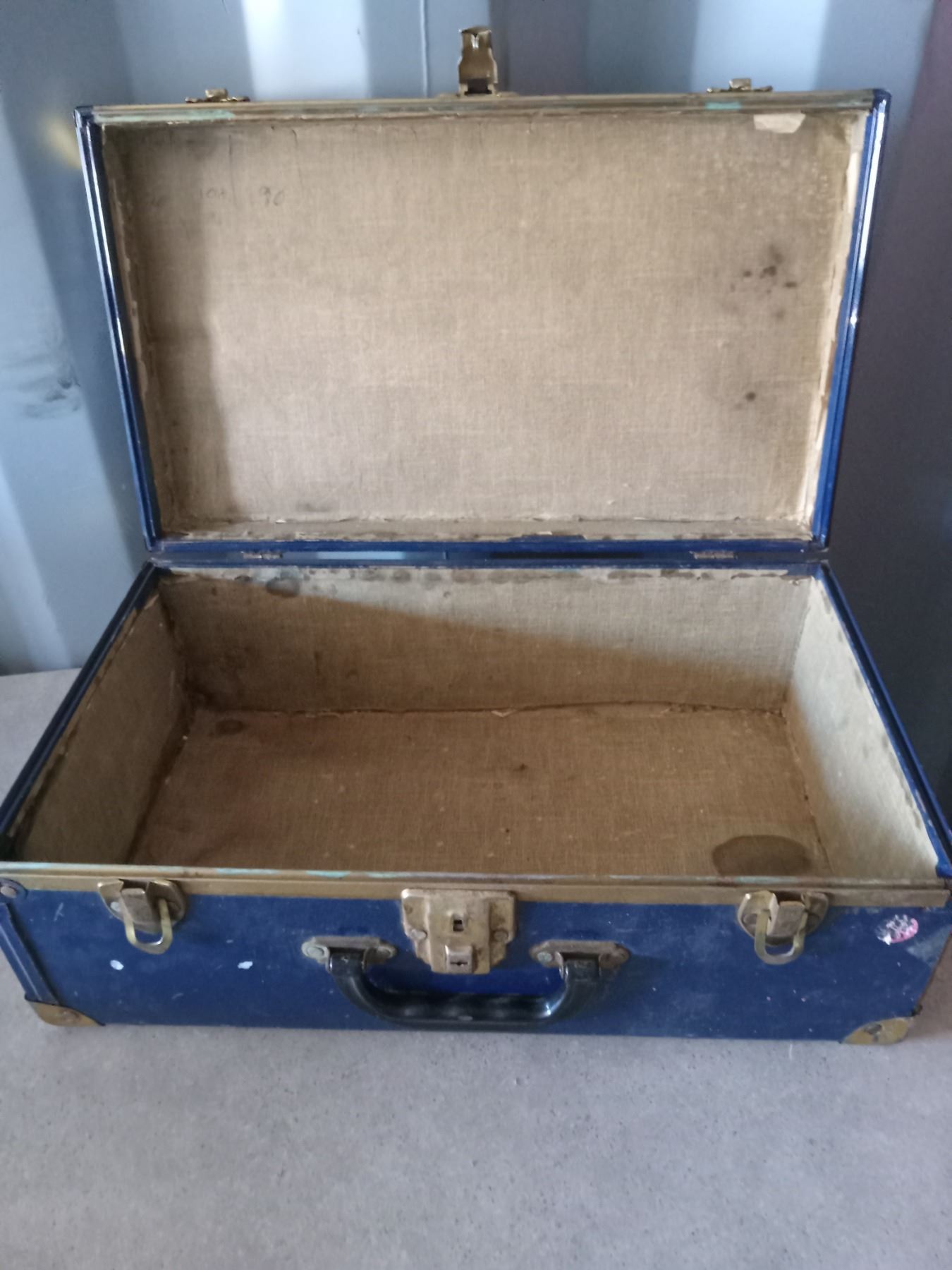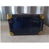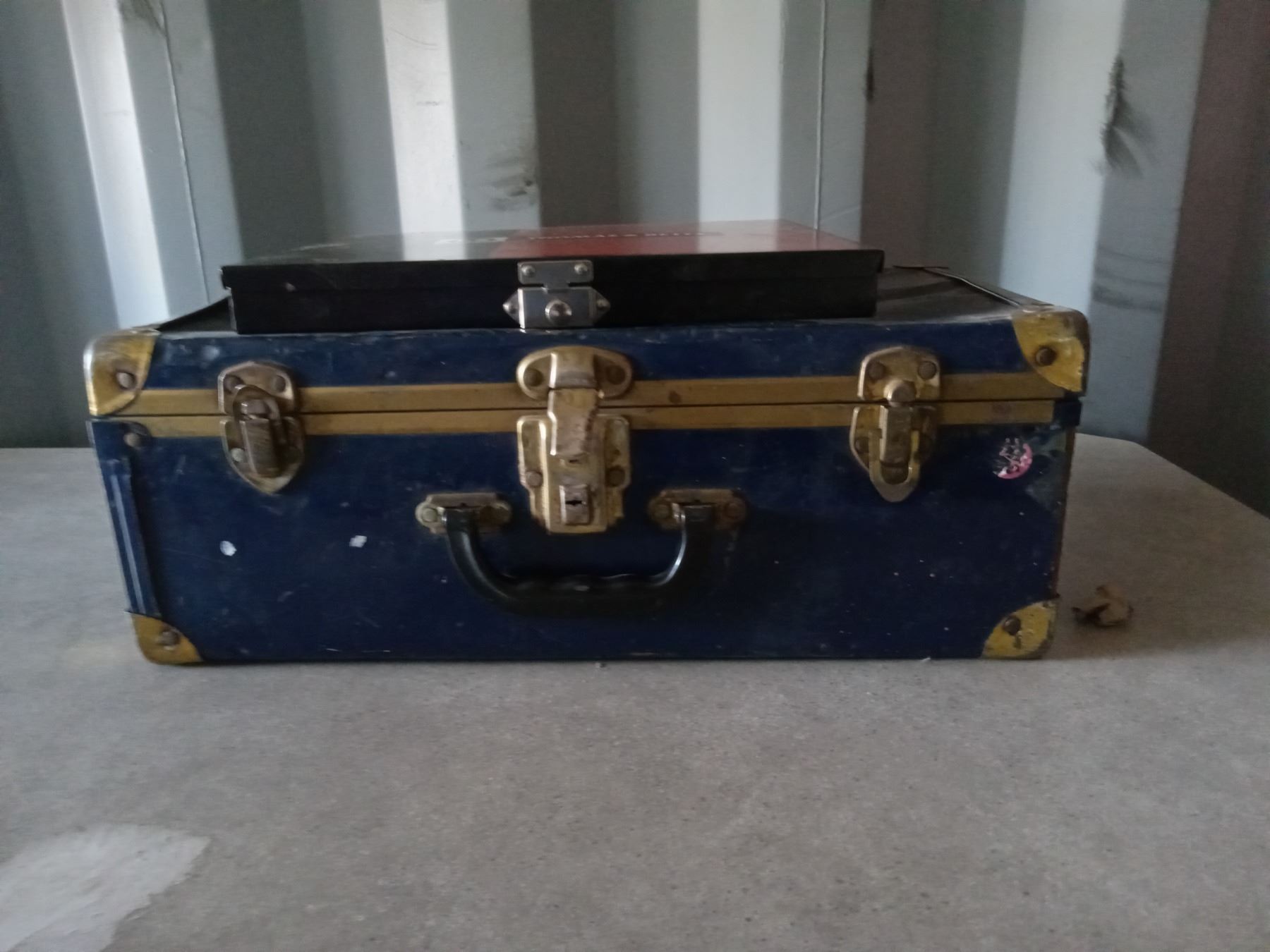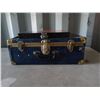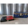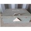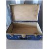 STEEL STORAGE BOX, STEAMER TRUNK. VARYING SIZES. WOOD BOX COMES WITH CONTENTS.