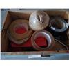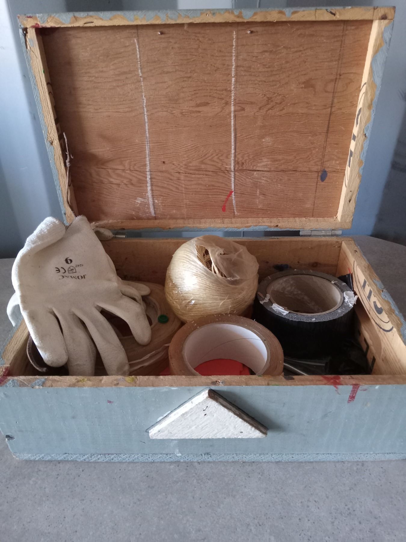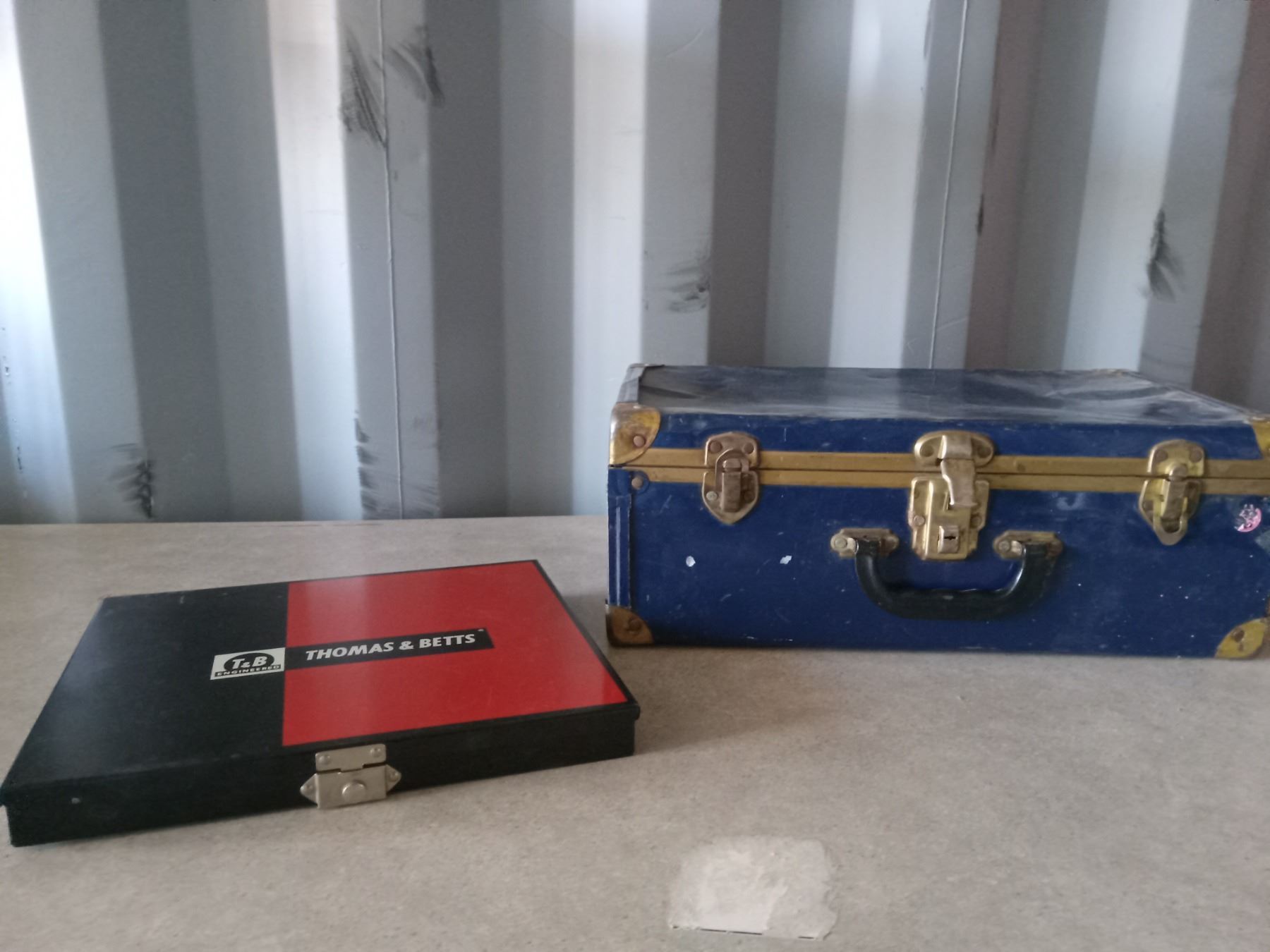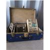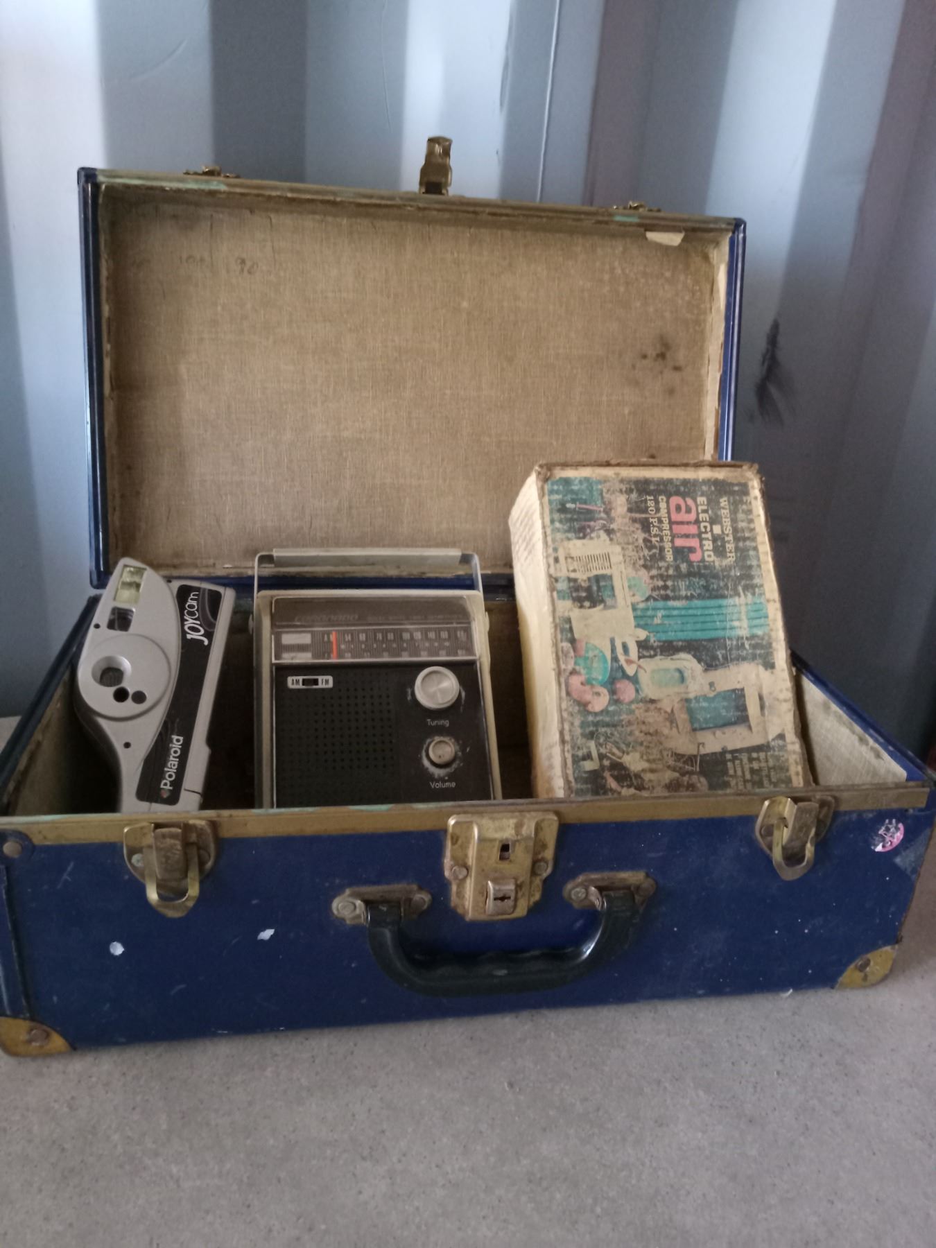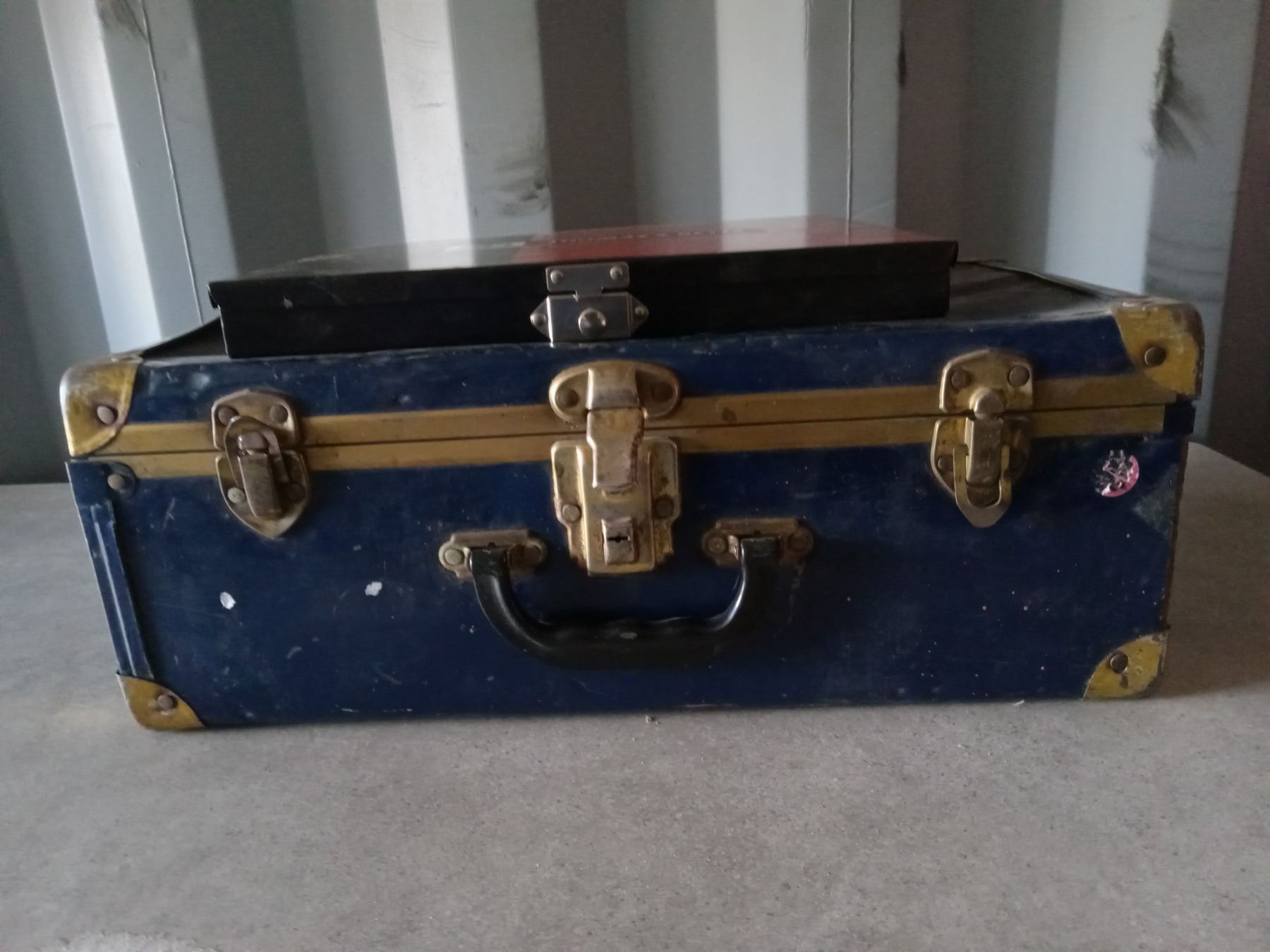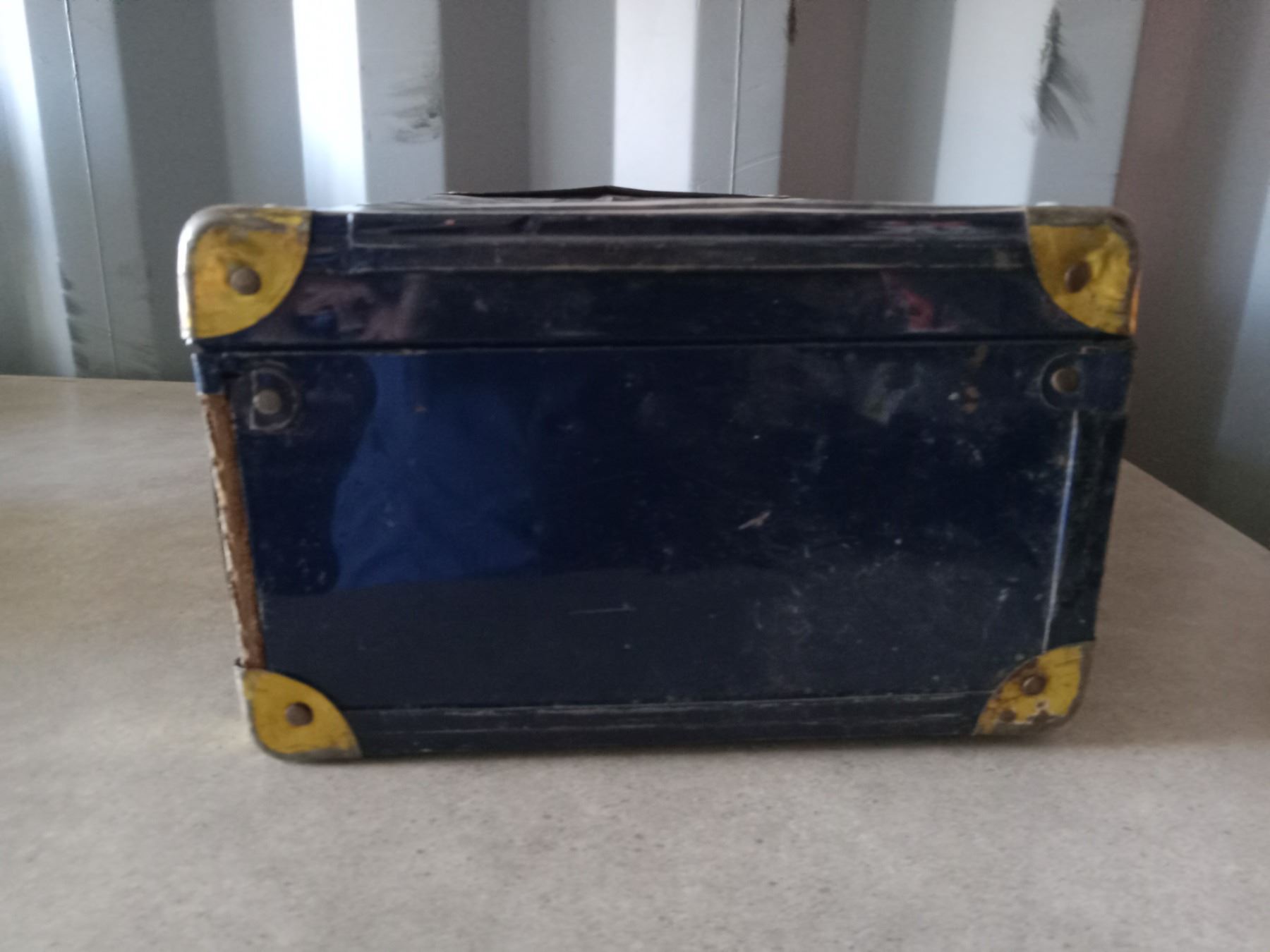 STEEL STORAGE BOX, STEAMER TRUNK. VARYING SIZES. WOOD BOX COMES WITH CONTENTS.