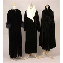 STEIN BROS  EVENING COAT, CIRCA 1940s Floor length black velvet evening coat, white sheared  beaver empire collar,  single button center front closure,  gathered cuffs.  Fully lined in cream silk. Labelled Stein Bros. 300 / 500 Illustrated