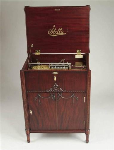 STELLA 17 " DISC CONSOLE MUSIC BOX. Console mahogany case with fluted legs, nice center carving, large door for record storage with lift top for accessing music box. Music box is double comb and includes 3 discs. SIZE: 29 " w. x 36 " h. x 22 " d. CONDITION: Case is nicely refinished, all brass hardware on exterior has been polished and cleaned creating a nice contrast. Inside is also cleaned and polished. All teeth in tact and all dampers working nicely. Winds nicely with original crank and original key for both locks on case. Plays beautifully with very nice brilliant tone. 1-5464 EO
