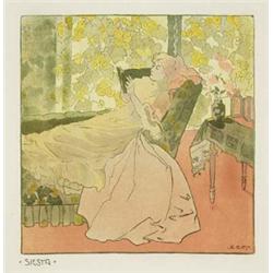 Der Tag einer Dame.  Komplette Folge von 11 Bll. Farbalgraphien (einschl. Titelblatt) um 1901. Wien, in Kommission bei Artaria, (1901). Gr.-Fol. Lose in Orig.-Umschlag.  - Sämtlich mit dem Namenszug und Titel sowie mit den Paßlöchlein in der Platte. Auf chamoisfarbenem Vélin. Darstellungsgröße: je ca. 29,7 x 30 cm. Sämtlich leicht stockfleckig und gering gebräunt, teils mit leichten Randläsuren. Titelblatt mit Randeinriß und Eckknickspur sowie Umschlag knitterfaltig und mit Gebrauchsspuren. Außergewöhnlich reizvolles und für den Wiener Jugendstil charakteristisches Werk, welches den Tagesablauf einer vornehmen Dame von der morgendlichen Toilette bis zum abendlichen Theaterbesuch zeigt.