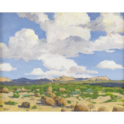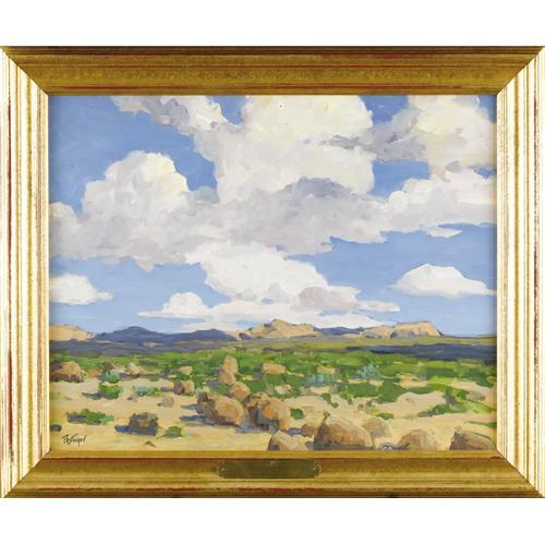 <B>STEPHEN POSTUHOV (living)</B></I><BR><I>Texas Big Sky,</B></I> April 2004<BR>Oil on artist board<BR>16in. x 20in.<BR>Signed lower left<BR>Dated and titled verso<BR><BR>Inscribed by the artist verso: <I>To emphasize the vastness of the Texas countryside I make a grand sky to convey its size. I was inspired by one of my favorite painters, Edgar Payne, and the rocks in the foreground. Big sky, Big state. "Texan Sky" Dell City, Texas near Guadalupe Nat Park April 2004.</B></I><BR><BR>Provenance:<BR>Stephen Postuhov<BR>Galerie Kornye<BR><BR> <B>Condition Report:</B> Excellent condition. New frame in excellent condition.<BR><BR><b>Shipping:</b> Requires 3rd Party Shipping (<a target="_blank" href="http://www.heritageauctions.com/common/shipping.php">view shipping information</a>)