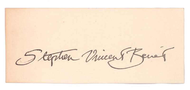 STEPHEN VINCENT BENÉT (1898 - 1943) American author, poet, short story writer, and novelist. Benét is best known for his book-length narrative poem of the American Civil War, John Brown’s Body (1928), for which he won a Pulitzer Prize in 1929, and for two short stories, The Devil and Daniel Webster and By the Waters of Babylon. Card signed “Stephen Vincent Benet”. 5” x 2”. Mounting trace on verso. Fine.