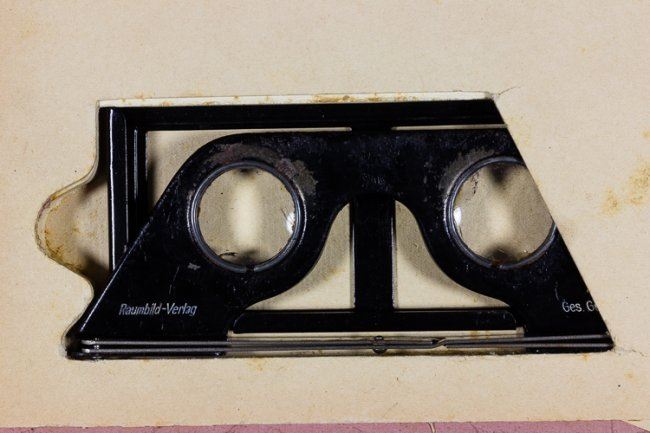 Album of stereoscopic images "Die Kriegmarine", (Munich: Raumbild Verlag Otto Schoenstein), 86pp. 4to. with color plates and 99 of 100 stereoscopic pictures and viewer. The text, which also includes a few illustrations, concerns all facets of the German navy, including E-boats, larg ships of war, and U-boats. Worn at the spins, viewer has a small bit of corrosion, else very good.