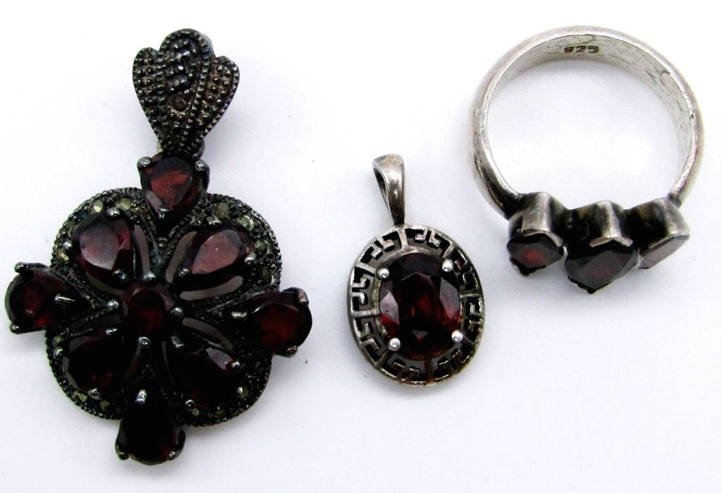 WITH RUBY STONE ACCENTS, (1)PENDANT WITH RED STONE & (1) RING WITH DEEP RED STONES. SIZE 6. TOTAL 10.2 DWT