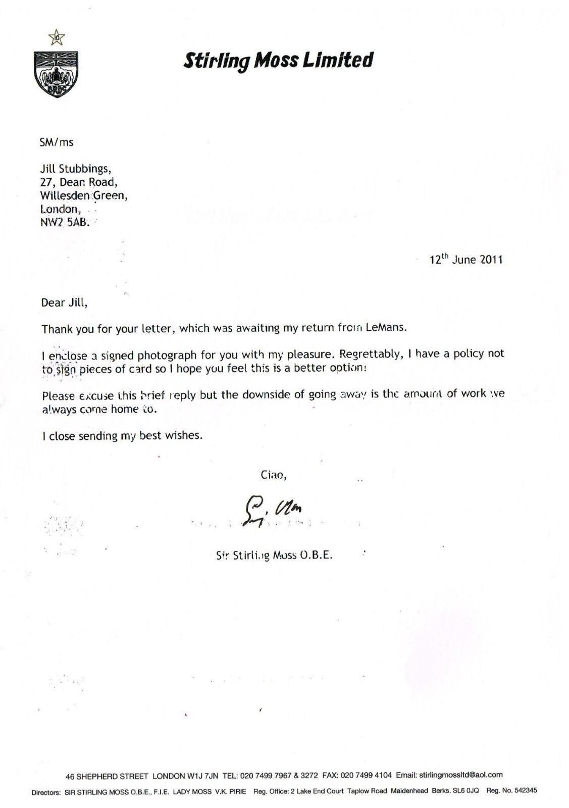 A signed letter from the Racing car driver Stirling Moss on his letter head. No signed photo is included. Letter has been folded and there is a large water stain on the letter.