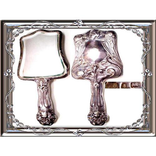 This is in such great shape and has wonderful silver patina to it. A true collectors item. This is one of the finest English sterling vanity mirrors I have ever seen. The marks are the lion and the anchor and AN E in lower case and WD for WD (William Davenport Birmingham 1888-1904). From what I understand it was one of the last years for him to make such beautiful pieces. There is a tiny flake missing off one of the bezel cuts of the mirror.