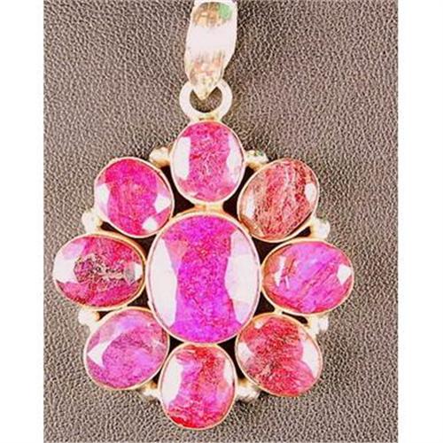 This STERLING Silver Pendant features a daisy shaped cluster of GENUINE RUBYS. The Cluster of Rubys measures 1 3/4 inches x 1 1/2 inches. There are 8 Oval Rubys surrounding a center Oval Ruby and the GENUINE RUBY TOTAL WEIGHT = 18 CARATS!