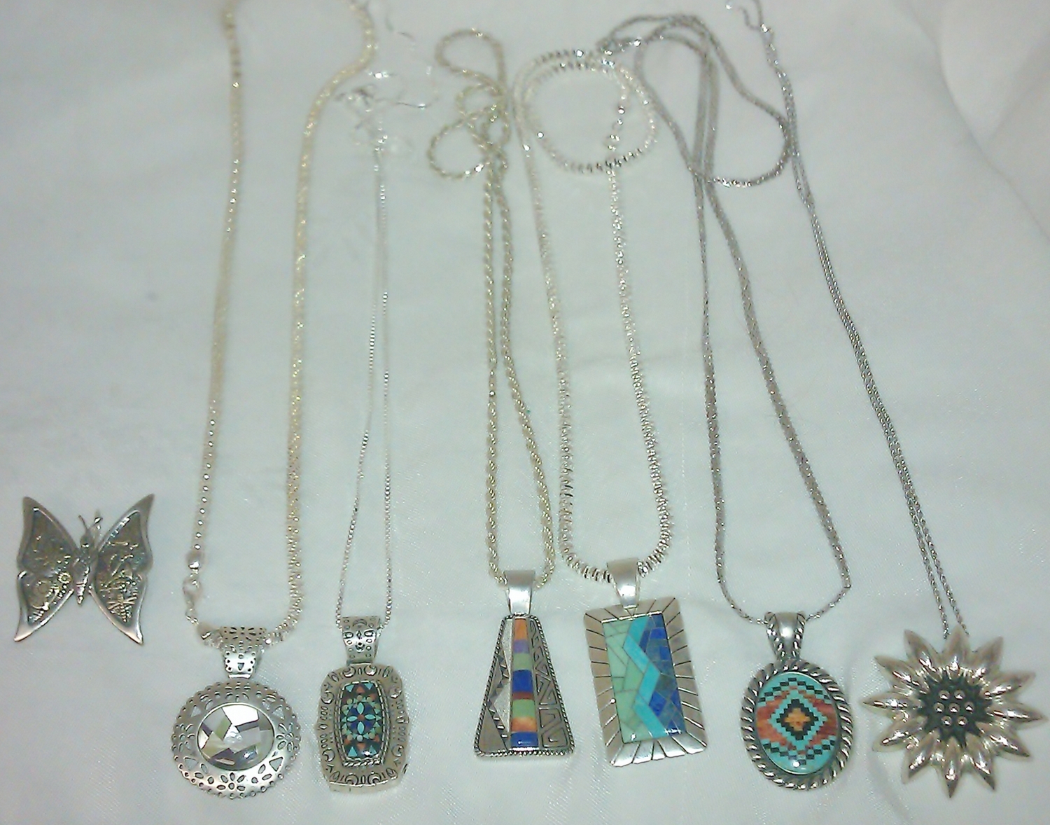 STERLING SILVER (6)NECKLACES, (6)PENDANTS & (1)PINS. THE NECKLACES &PENDANT WEIGH 289.8 GRAMS