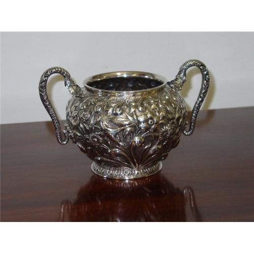 </font></strong>GORGEOUS SUGAR BOWL MADE BY " SAMUEL KIRK & SON " IN 1890. THIS NICE ITEM HAS ELABORATE ROCOCO REPOUSSE' FLOREAL ORNAMENTS, TOTALLY ENGRAVED-EMBOSSED BY HAND. TOTAL WEIGHT - 563 GRAMS <p>