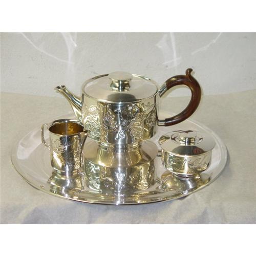 FANTASTIC 925 STERLING TEA SET LIBERTY STYLE, TAPOT DRUM-SHAPED WITH SOPHISTICATED CARVED WOODEN HANDLE, FANCY IVY FOLIAGE ORNAMENTS, ALL ENGRAVED BY HAND SURROUNDING THE BODY.