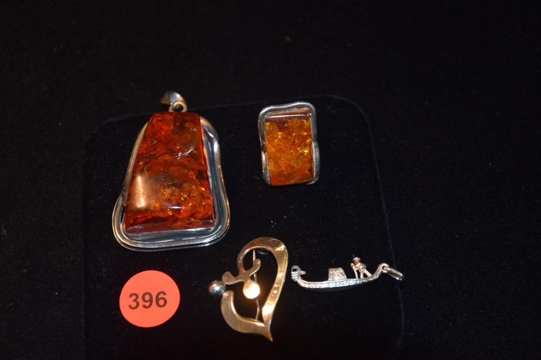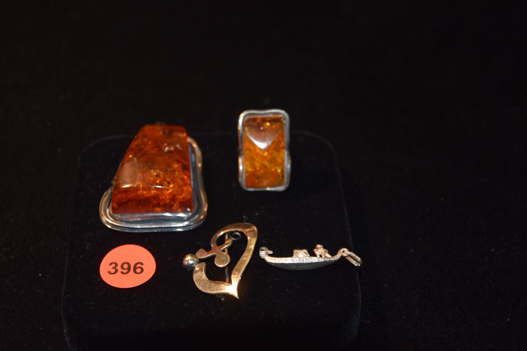 STERLING SILVER AMBER PENDANT & RING, STERLING SILVER CHARM & PIN (4 PCS)