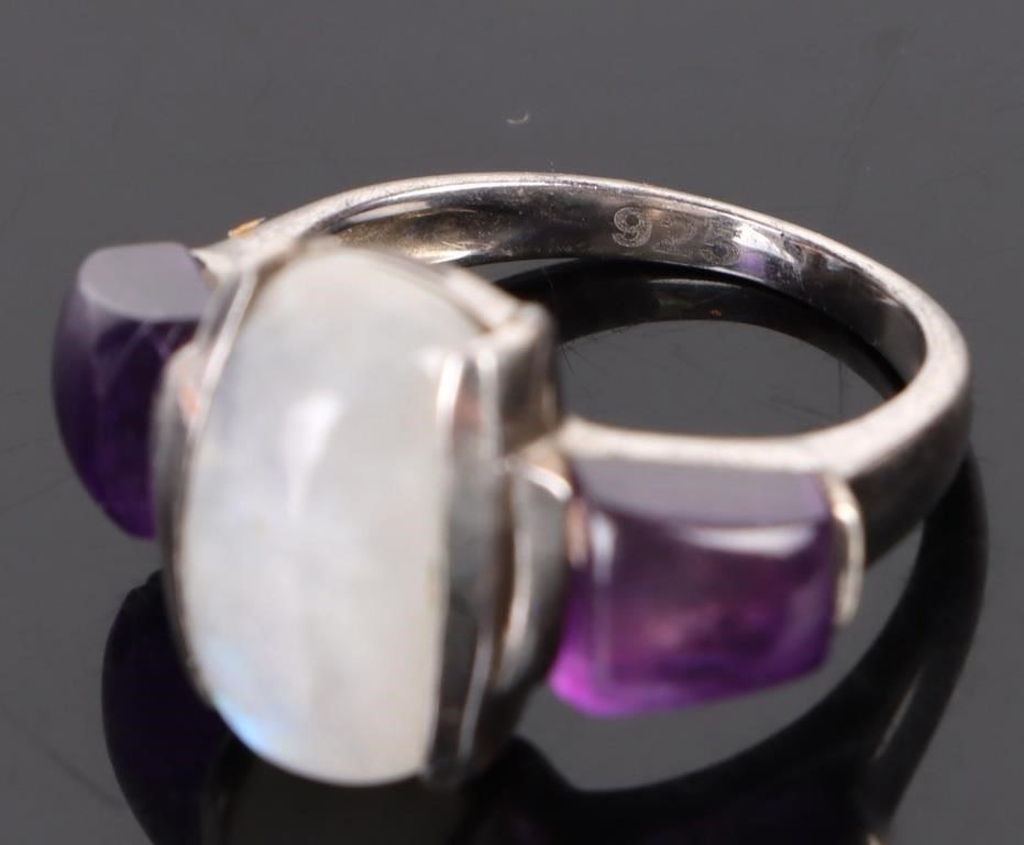 Sterling silver amethyst opal ladies ring to include two cabochon amethyst and one cabochon opal.